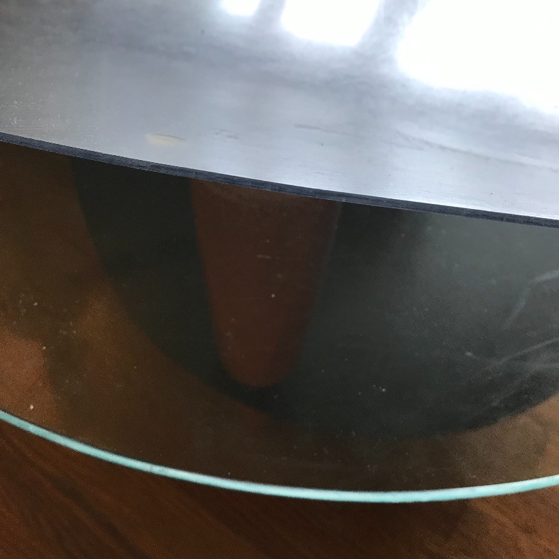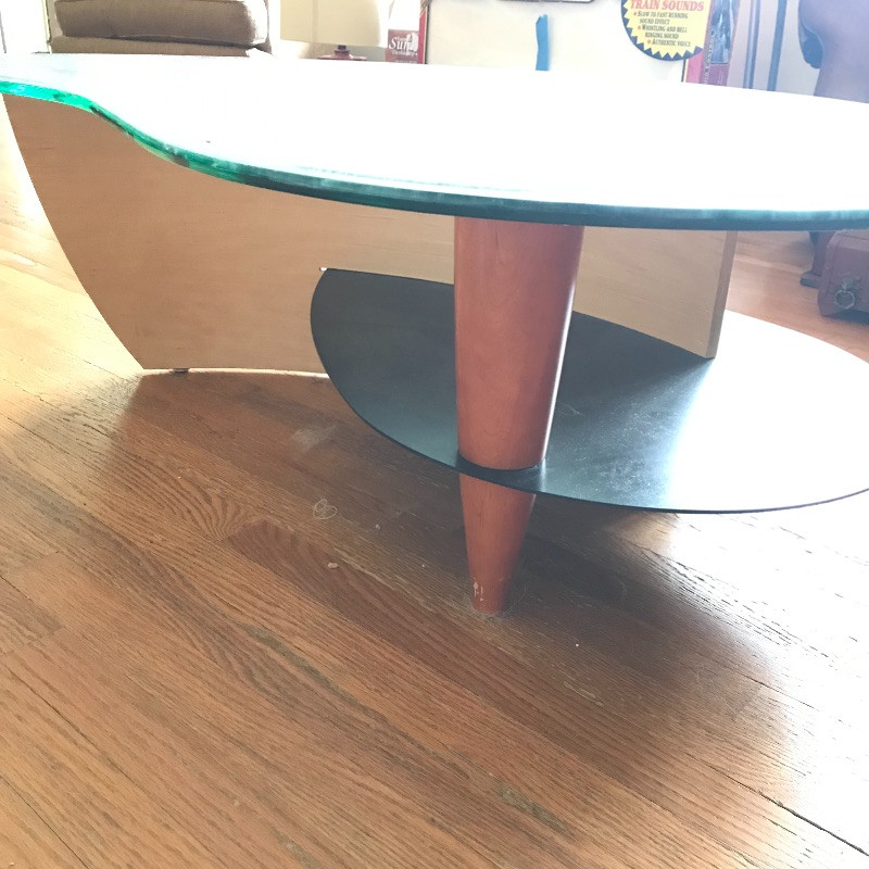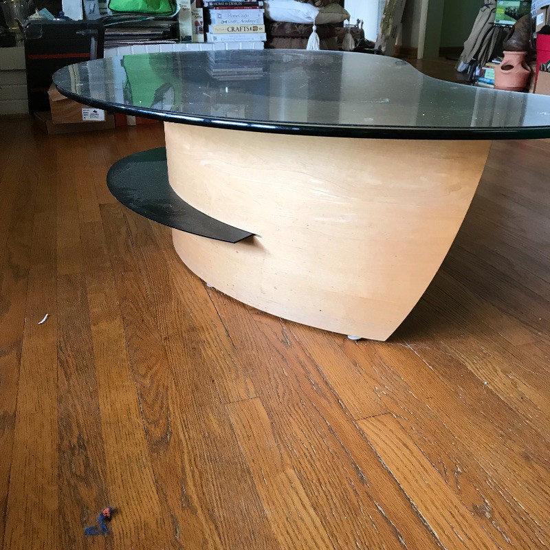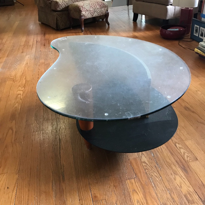 This Black and wood based coffee table with glass top and thin plastic overlay (glass protector added) are a nice addition to any living room. Piece measures 48” x33” x16”. Scratches are on the plastic piece. Glass is pretty free of scratches. There is no manufacture name to be found. Local pick up only.