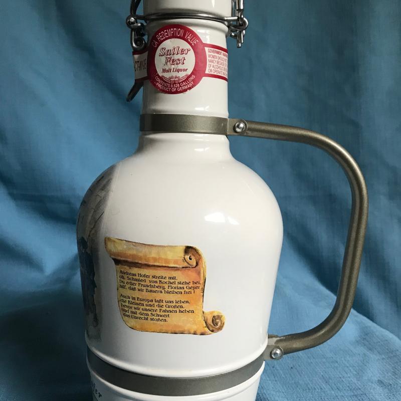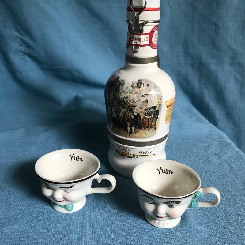 Large Sailer Fest Malt Liquor Bottle / Stein with unbroken seal. Ceramic Decanter from Germany. Measures 13”h. Lot also includes two small Bailey’s Cups. Local pick up only in Hendersonville, NC.
