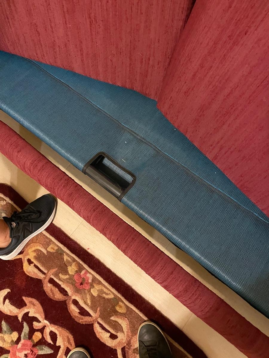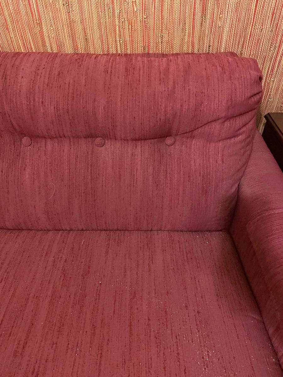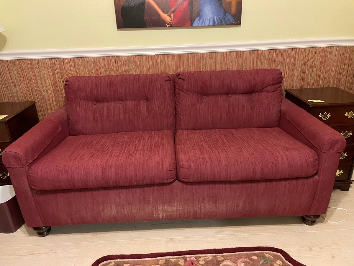 Burgundy fabric with some blemishes on the bottom of the front, but otherwise comfortable and clean 70" long