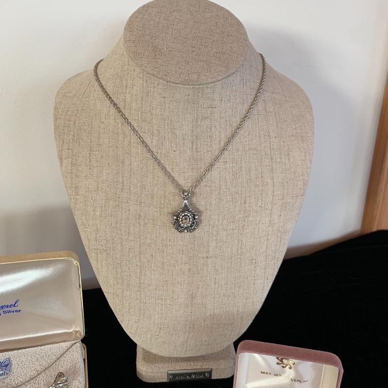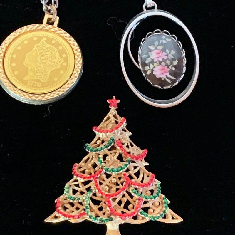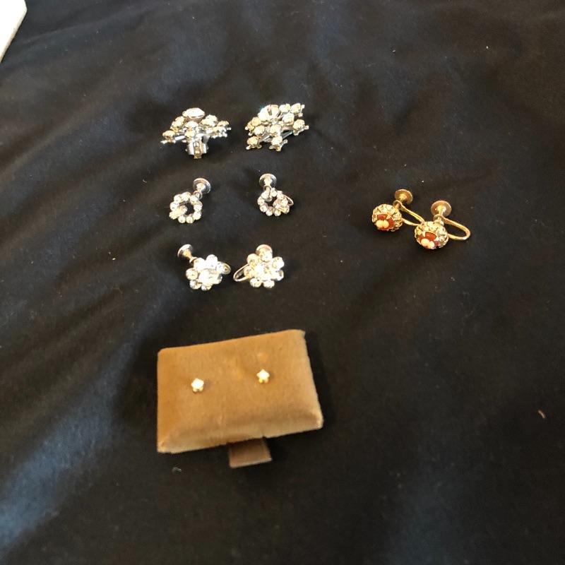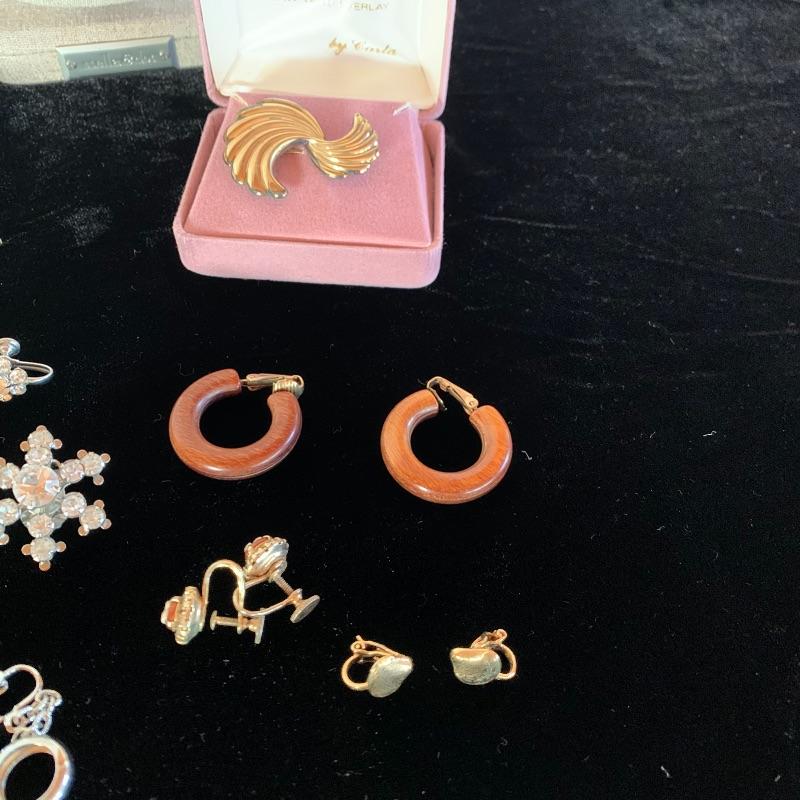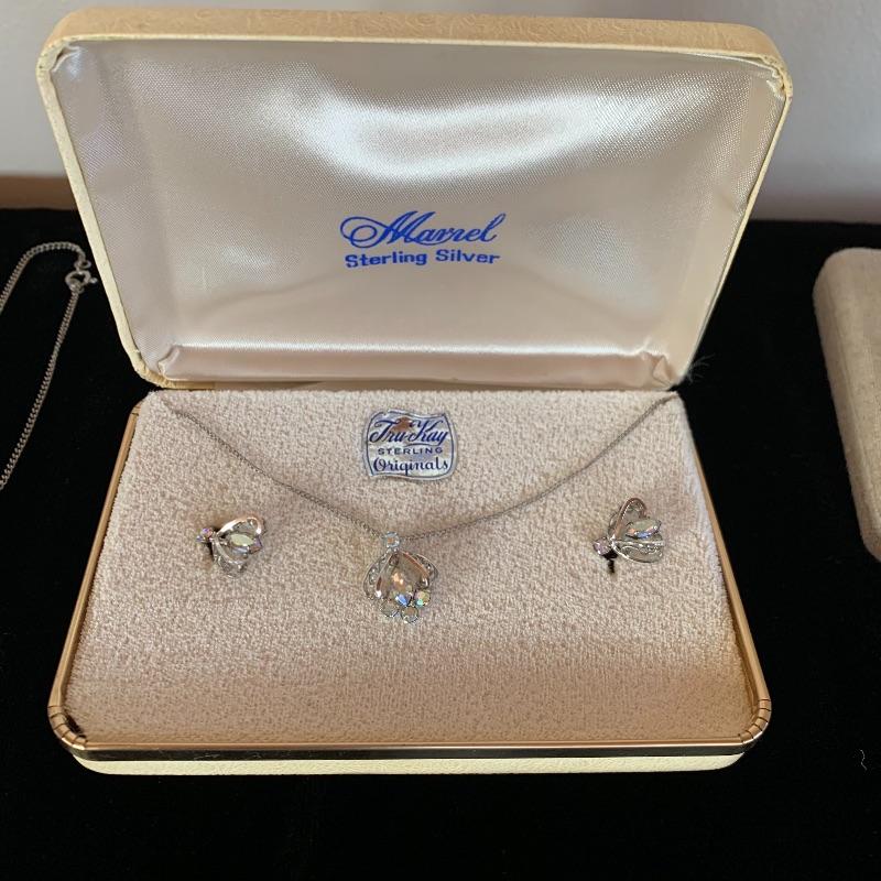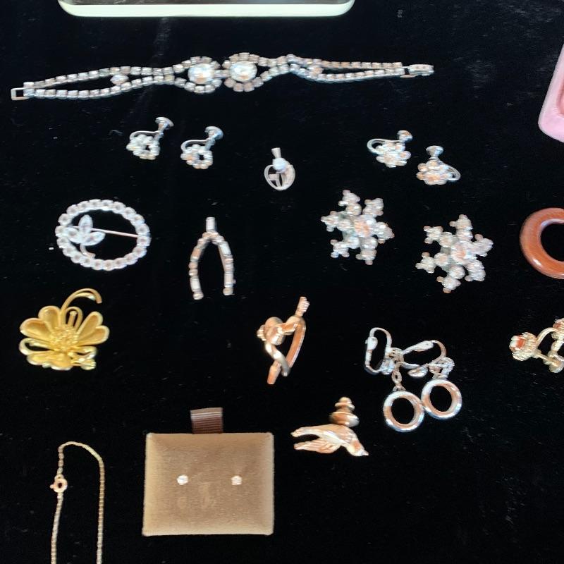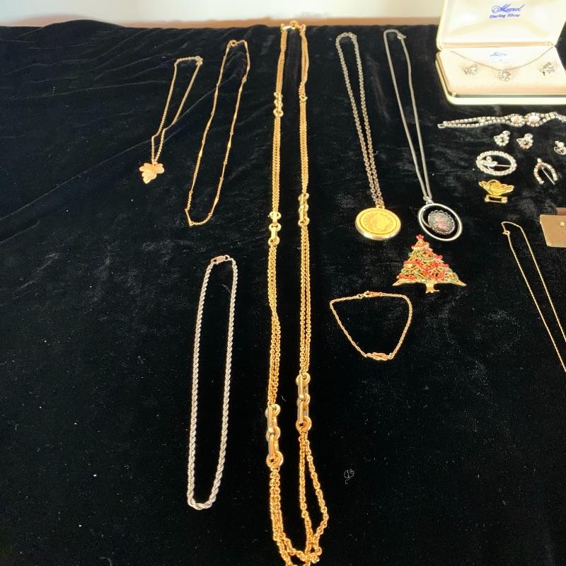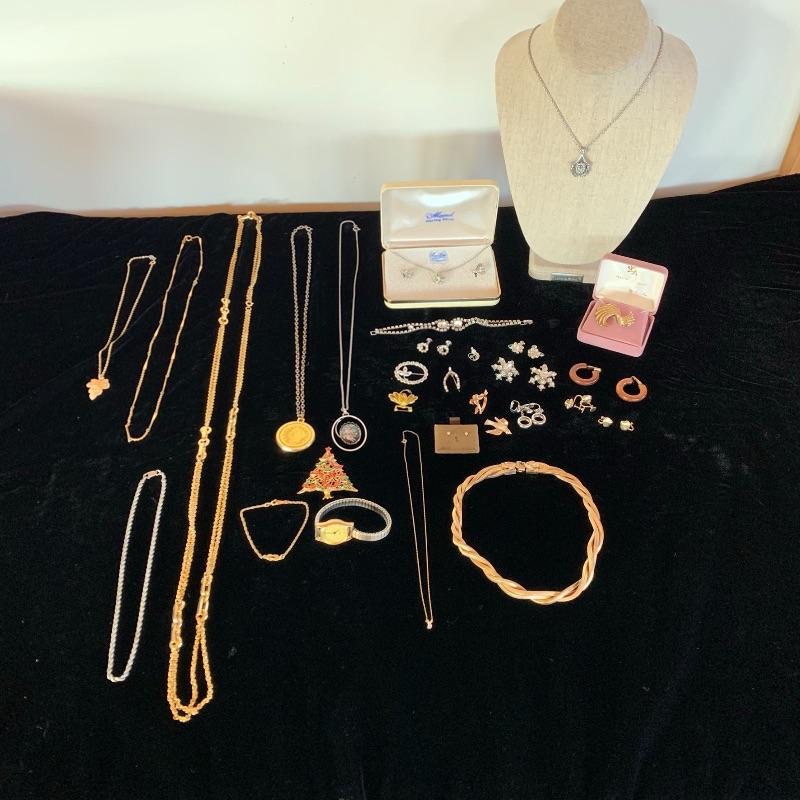 This lot of Silver, Gold and Sparkle has a lot to offer. It includes a 925 rope necklace, several gold colored Avon necklaces and pins. 14k gold studs earrings, a sterling silver set of necklace and clip earrings and so much more. Wish bone pin seems to be missing something for the clasp and one of the shell earrings clip does not closed. Quartz Meredian stretch watch needs a battery. Lot is shipping available.