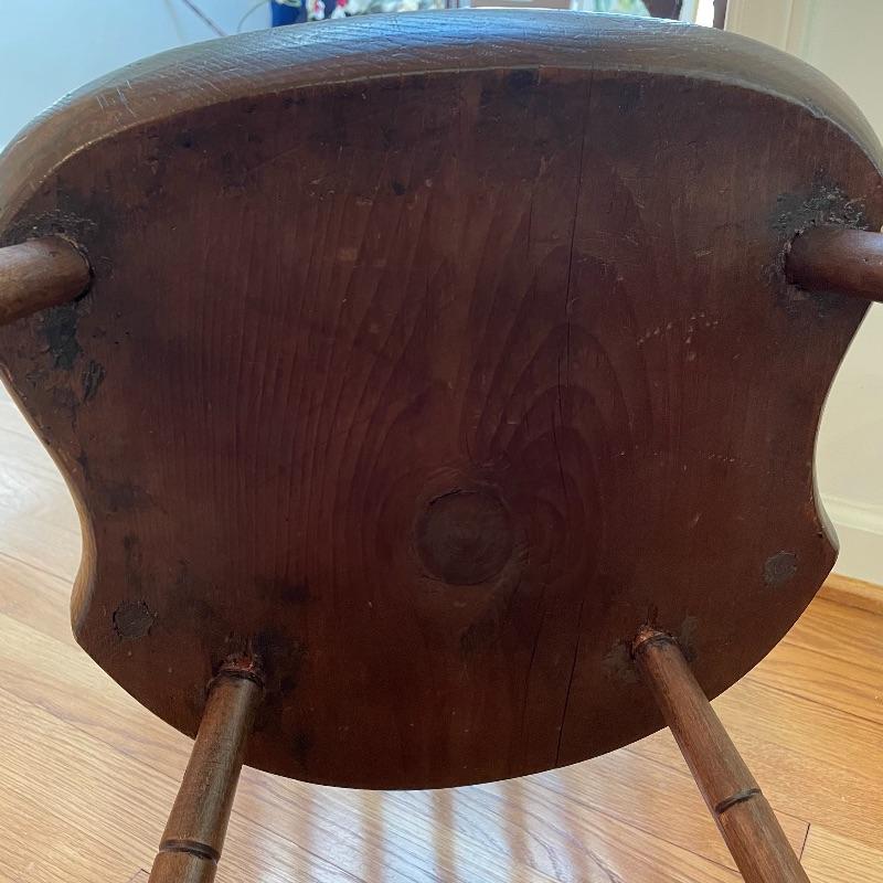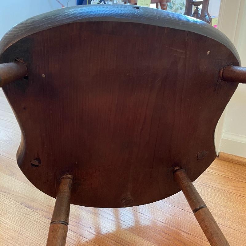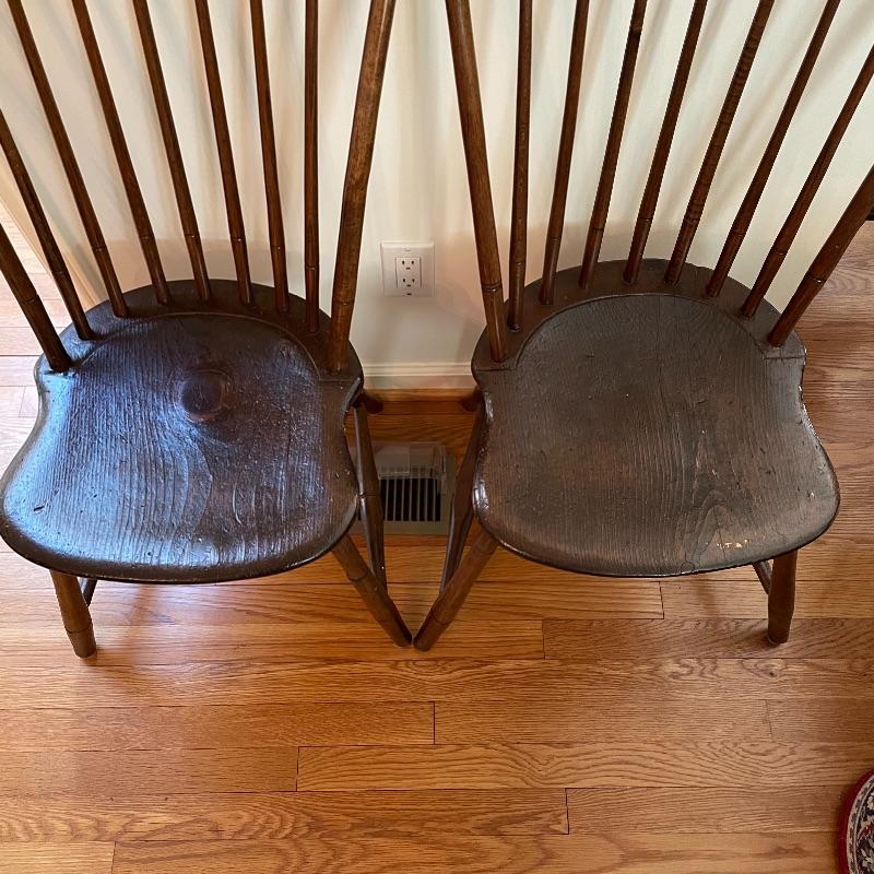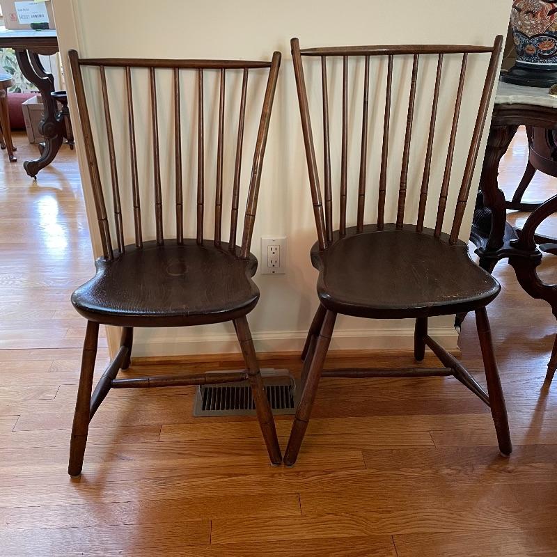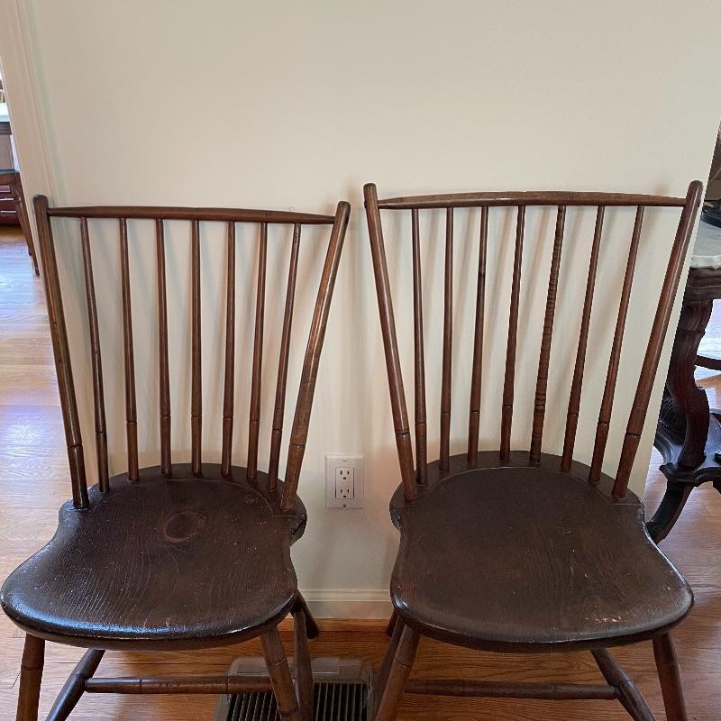 Two very nice, antique chairs with carved ring design throughout. These chairs appear to have been high quality Windsor Chairs back in the day and look great for their age. The chair photographed on the left is slightly larger, measuring 21” x 17” x 35” with a seat height at 17”. We cannot guarantee which type of wood, but Mrs. Olson appears to have a love of mahogany antiques. See photos. Local pick up only.