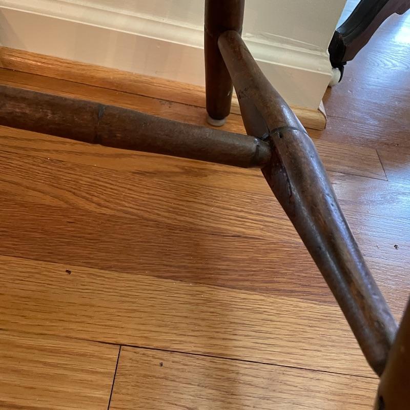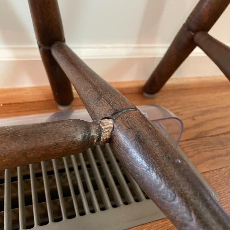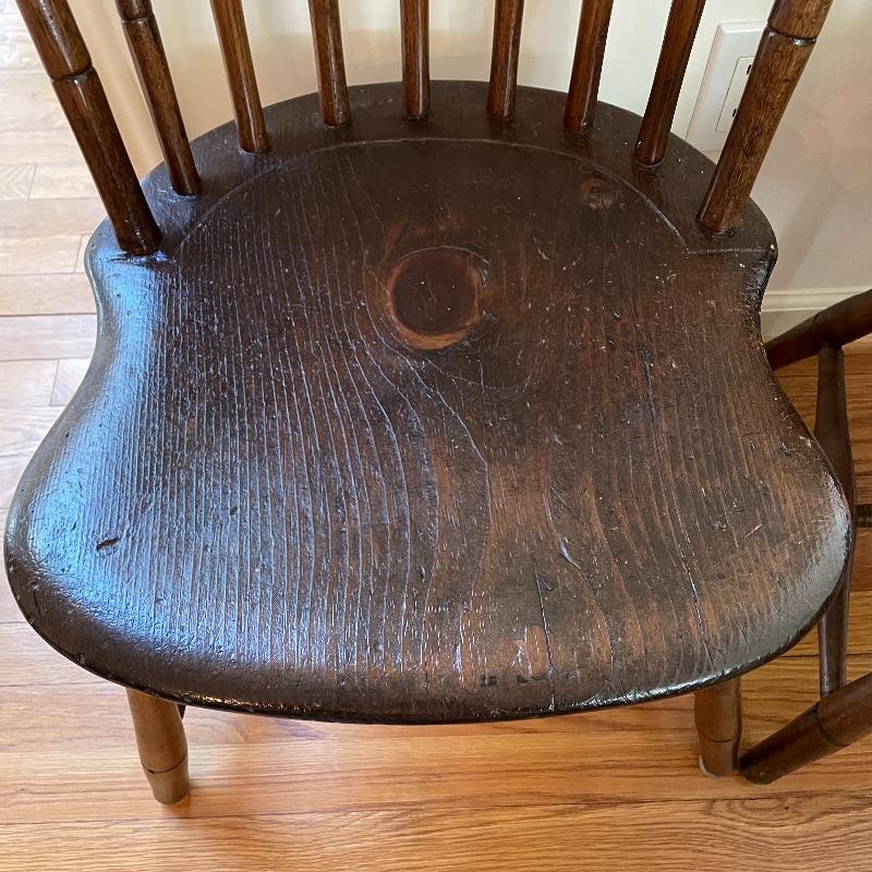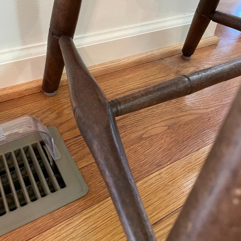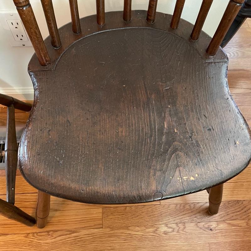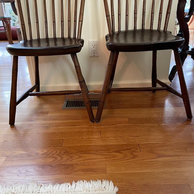 Two very nice, antique chairs with carved ring design throughout. These chairs appear to have been high quality Windsor Chairs back in the day and look great for their age. The chair photographed on the left is slightly larger, measuring 21” x 17” x 35” with a seat height at 17”. We cannot guarantee which type of wood, but Mrs. Olson appears to have a love of mahogany antiques. See photos. Local pick up only.