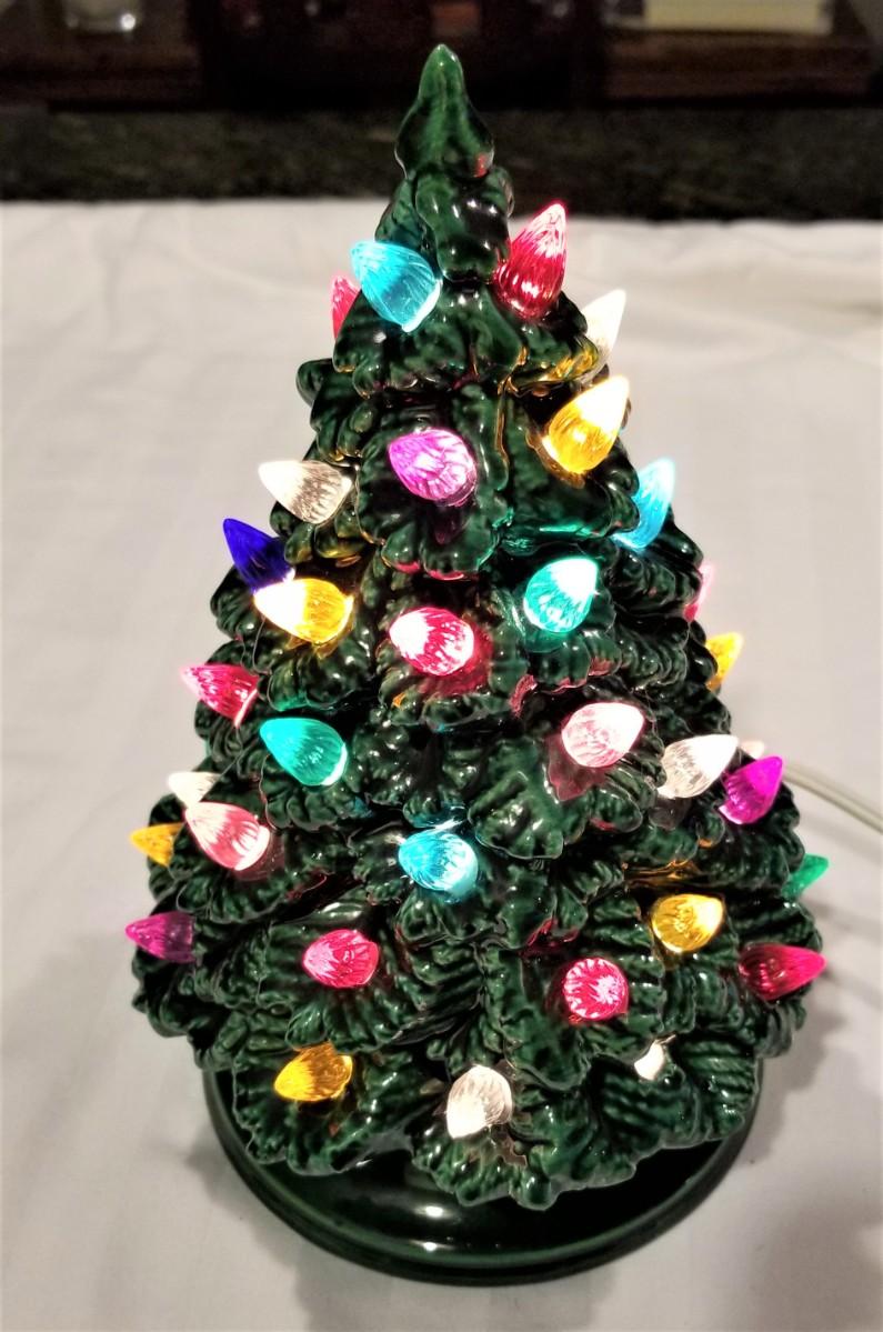 Vintage ceramic light up Christmas tree in a hard to find small size. Works fine. Switch on the cord. Stands 6.5" tall. All the colored bulbs are present. Some have been glued in (as found). No chips, etc.