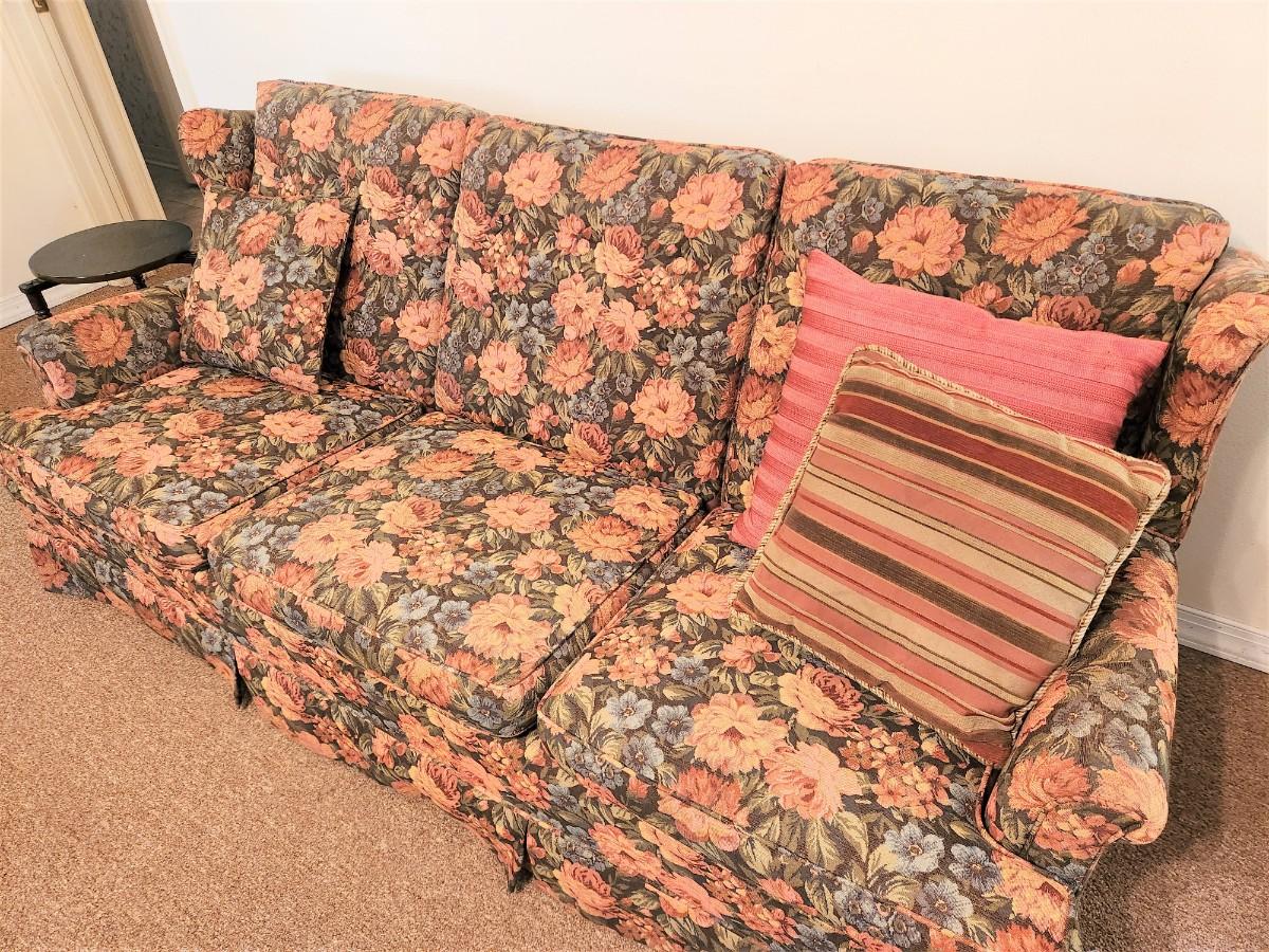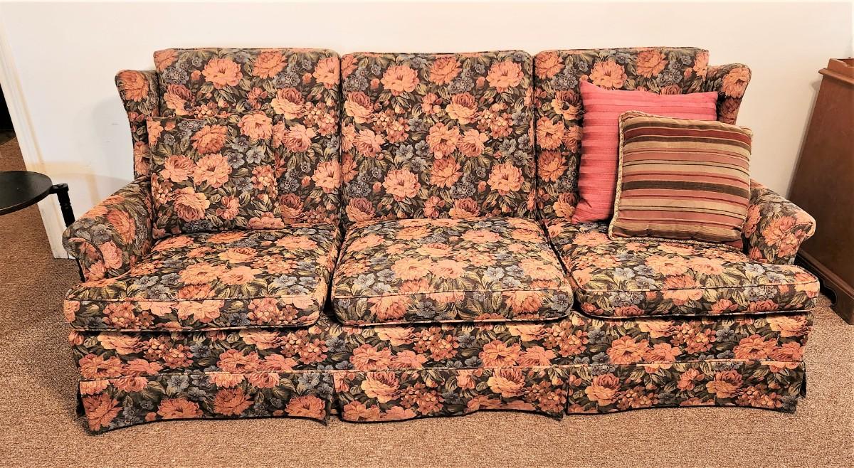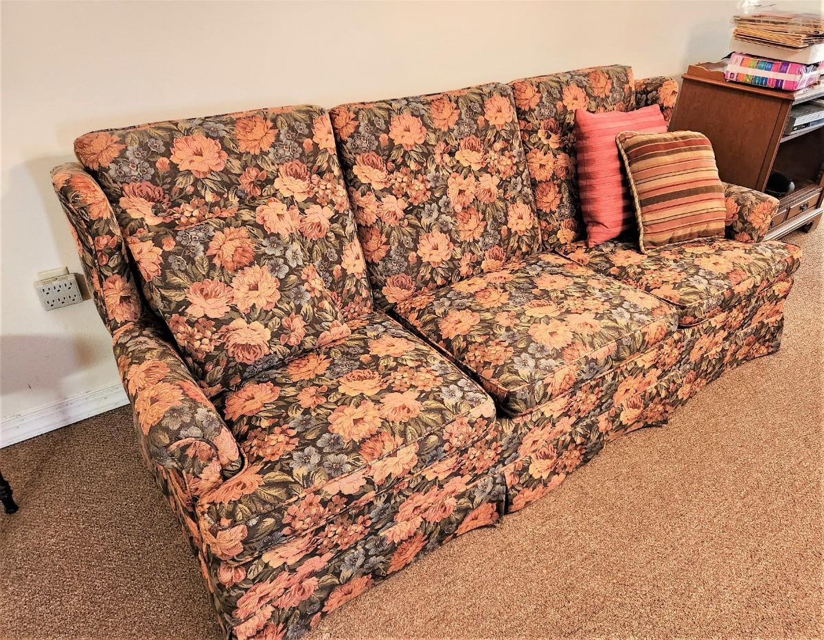 Vintage Floral upholstered sofa, decorative print - 82" across (nice size), 32" deep, 31" tall at the back. Good used condition. Perfect for first apartment, beach house, camp.