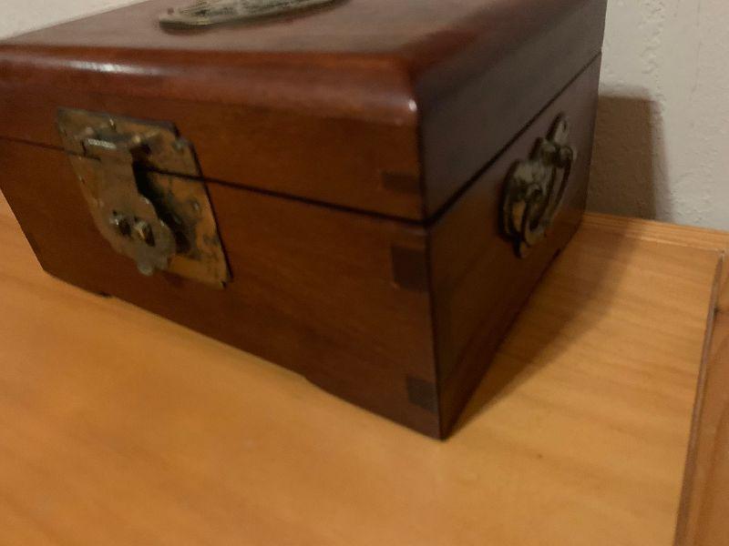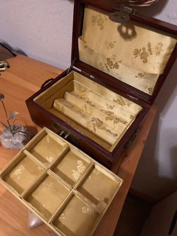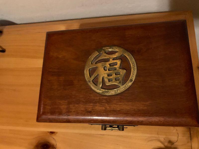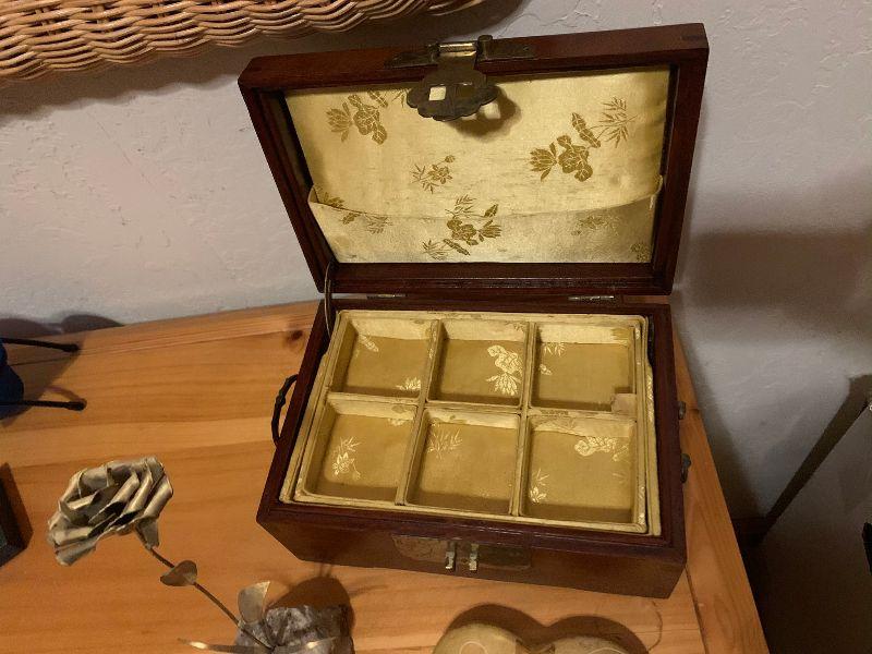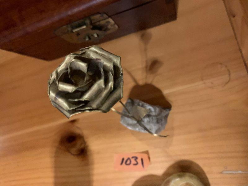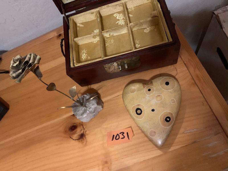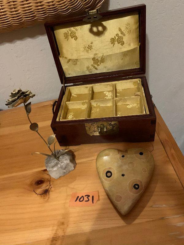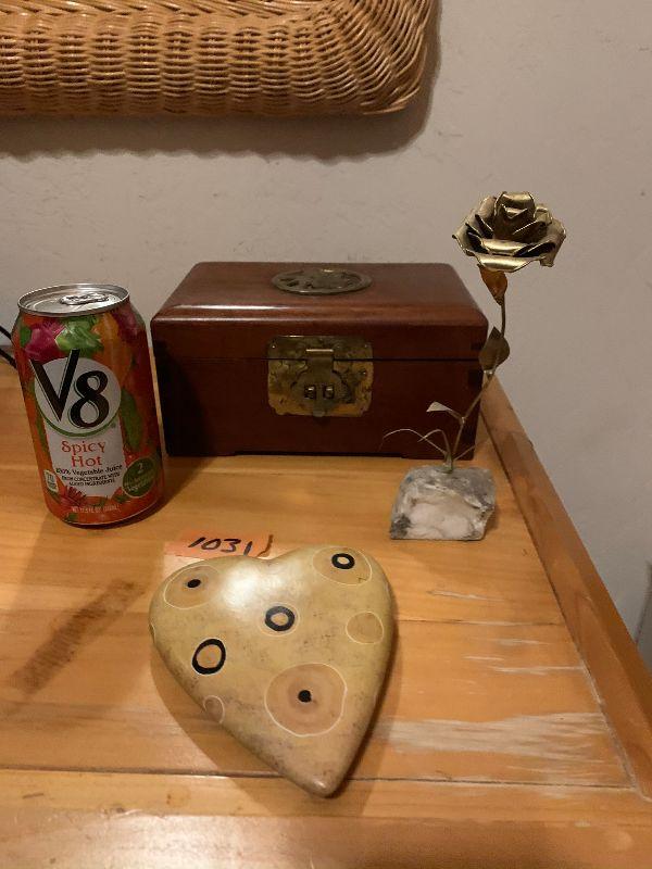 Wood and Brass Asian Jewelry Box, Metal Rose in rock and art heart rock