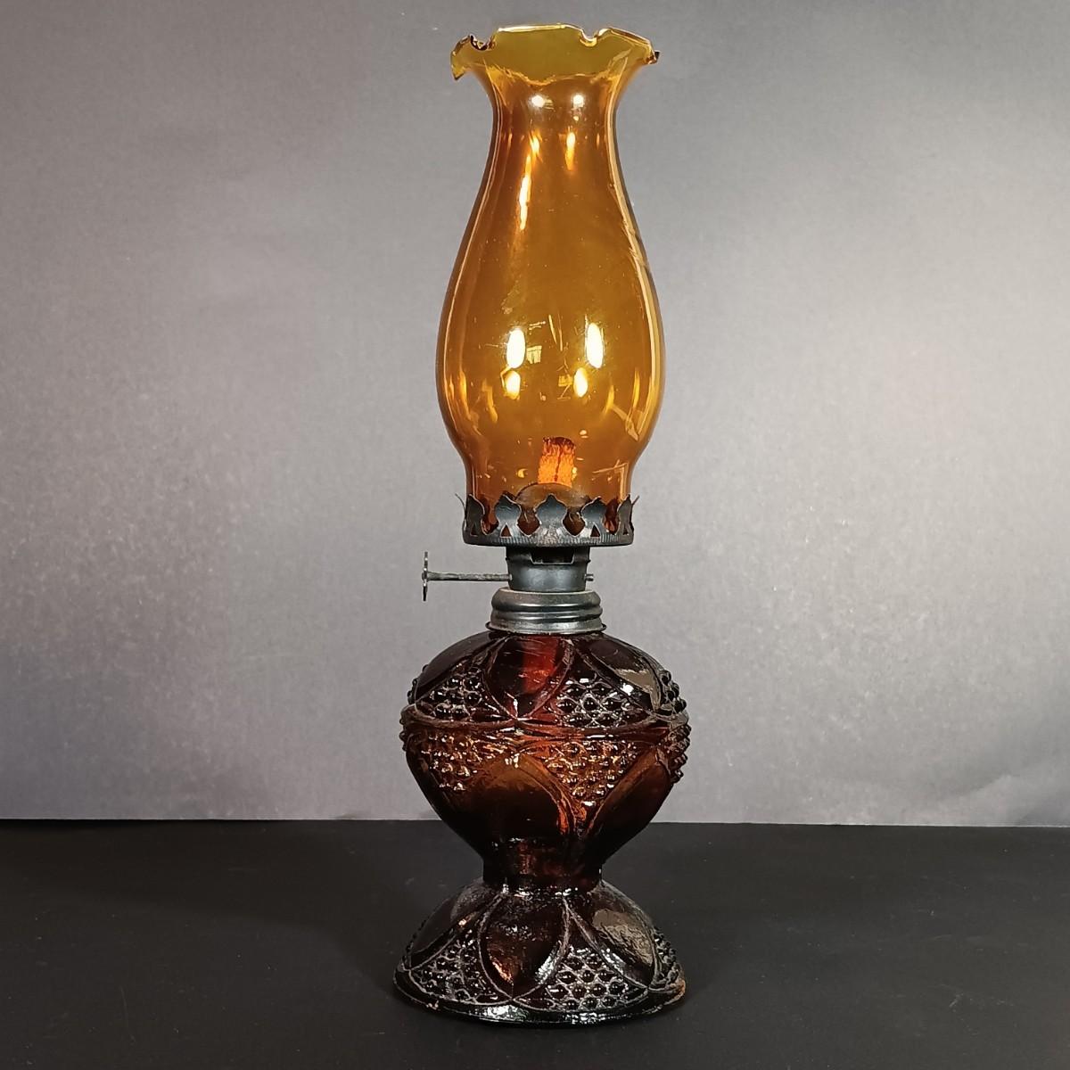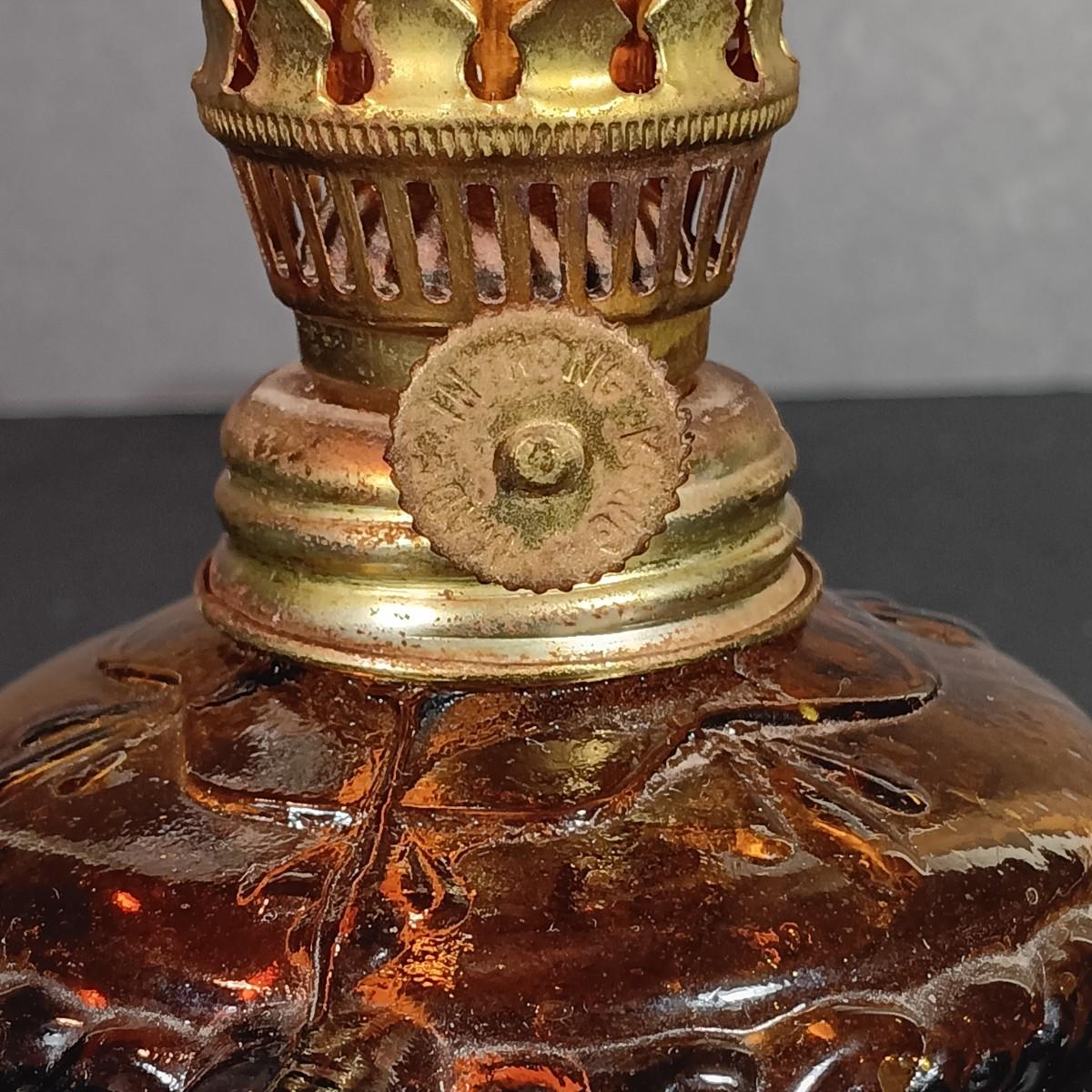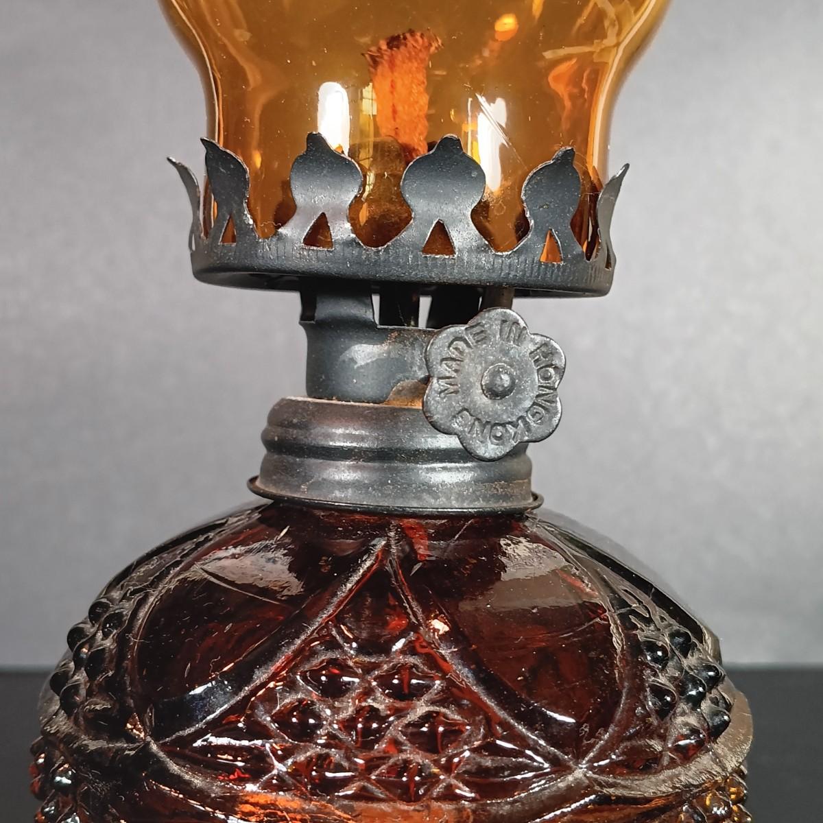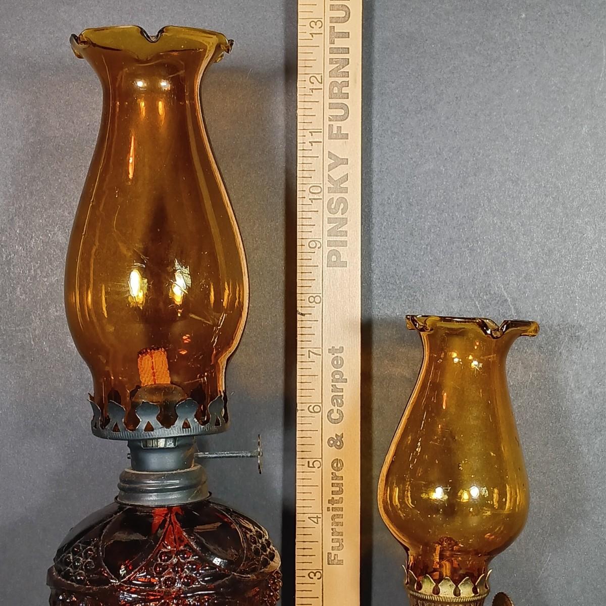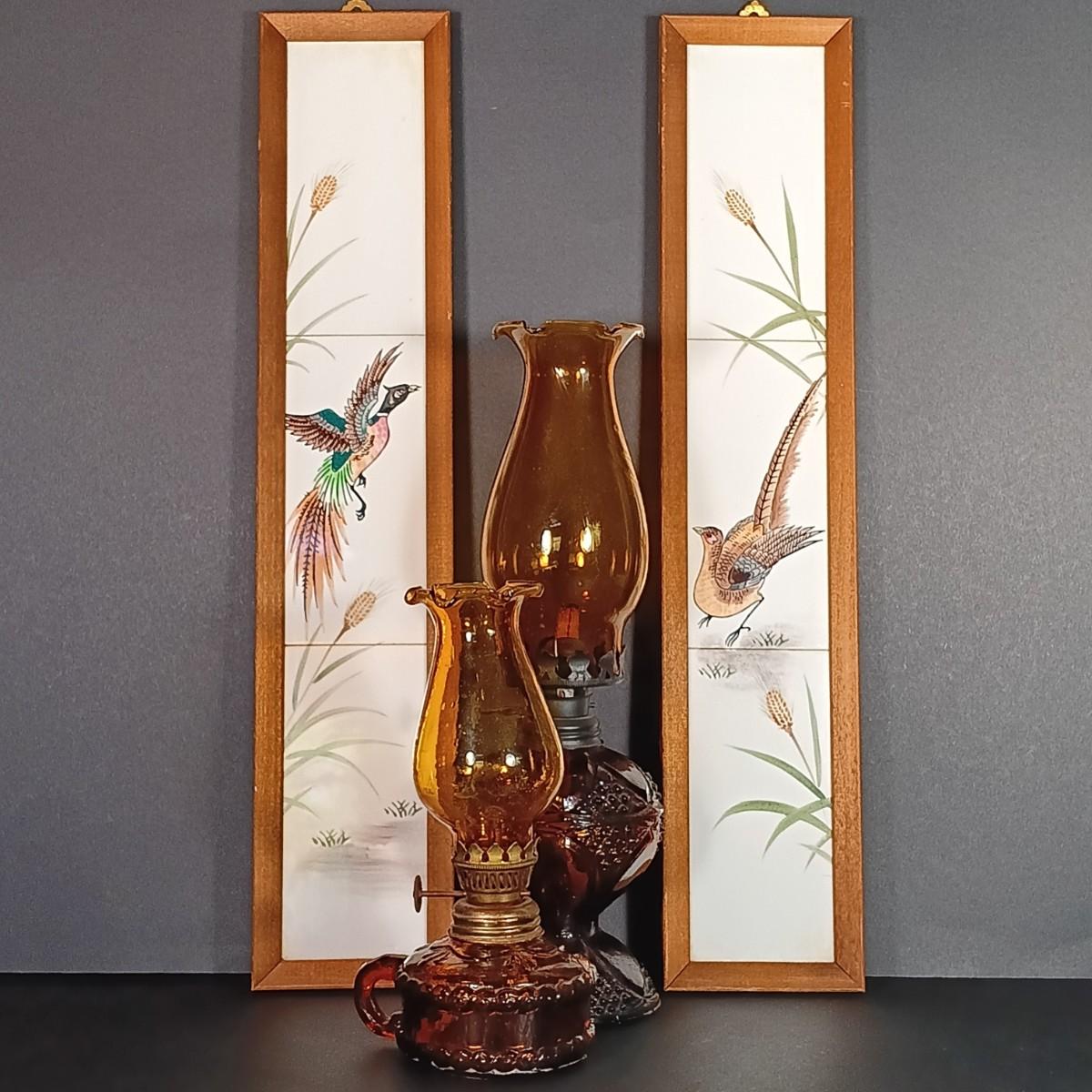 LOT 30: Vintage Amber Hurricane Lamps & Painted Framed Tiles