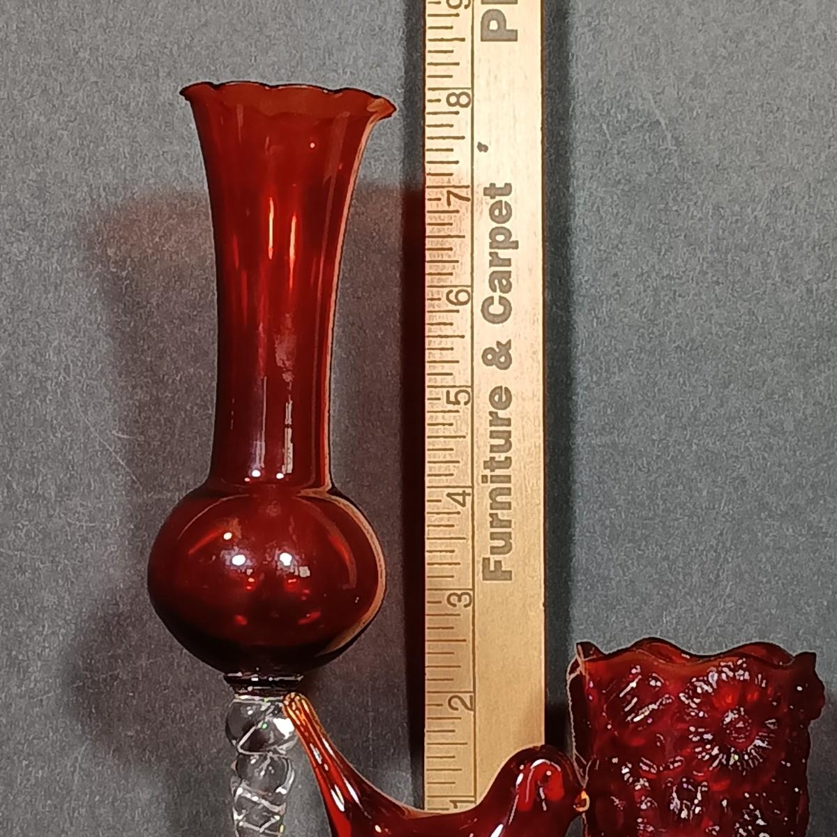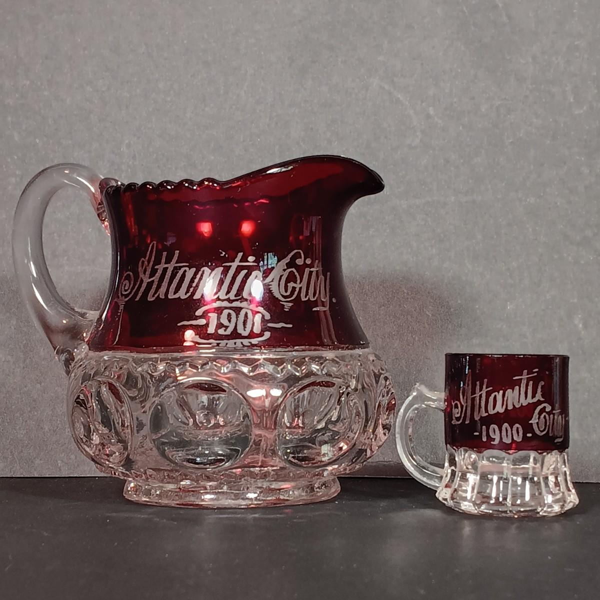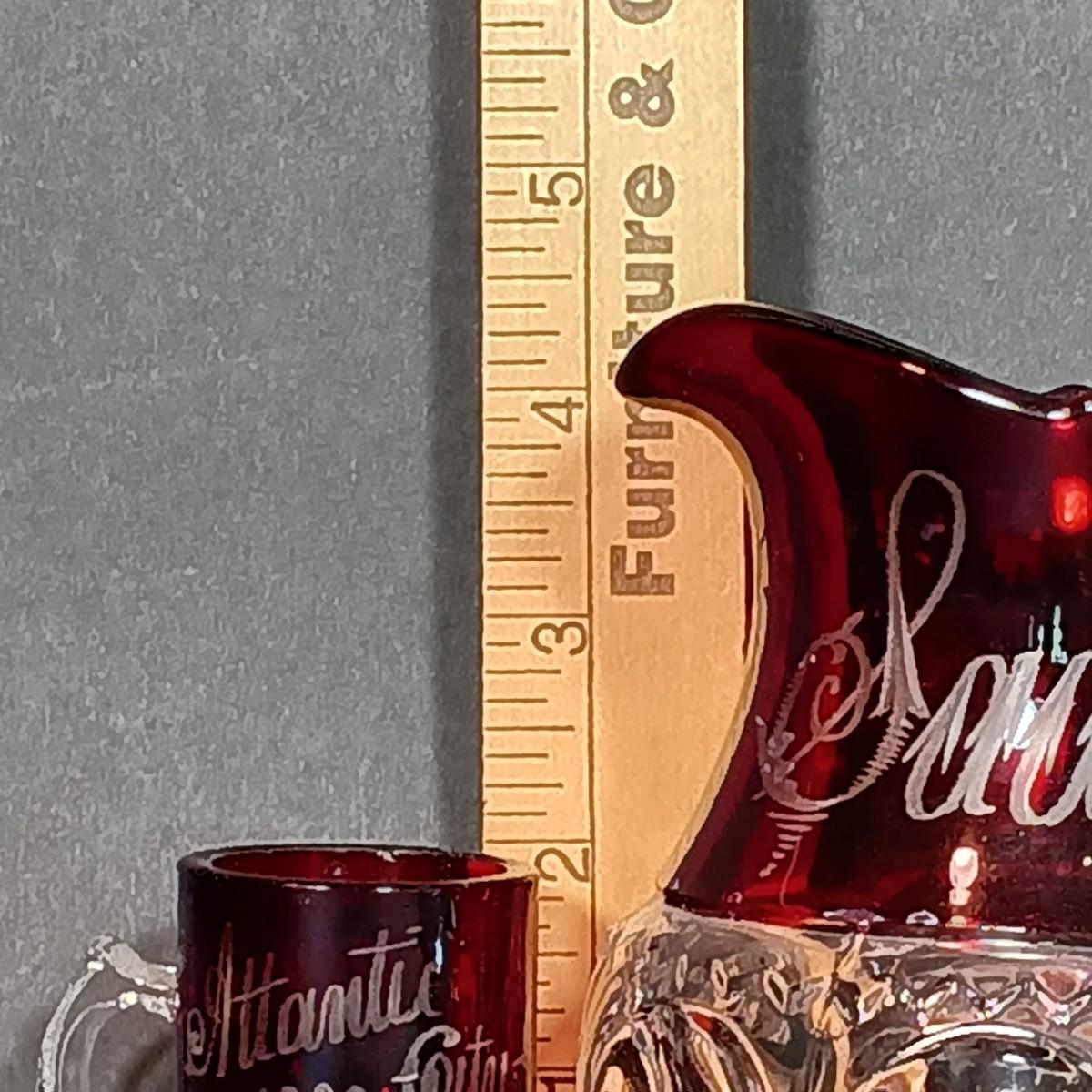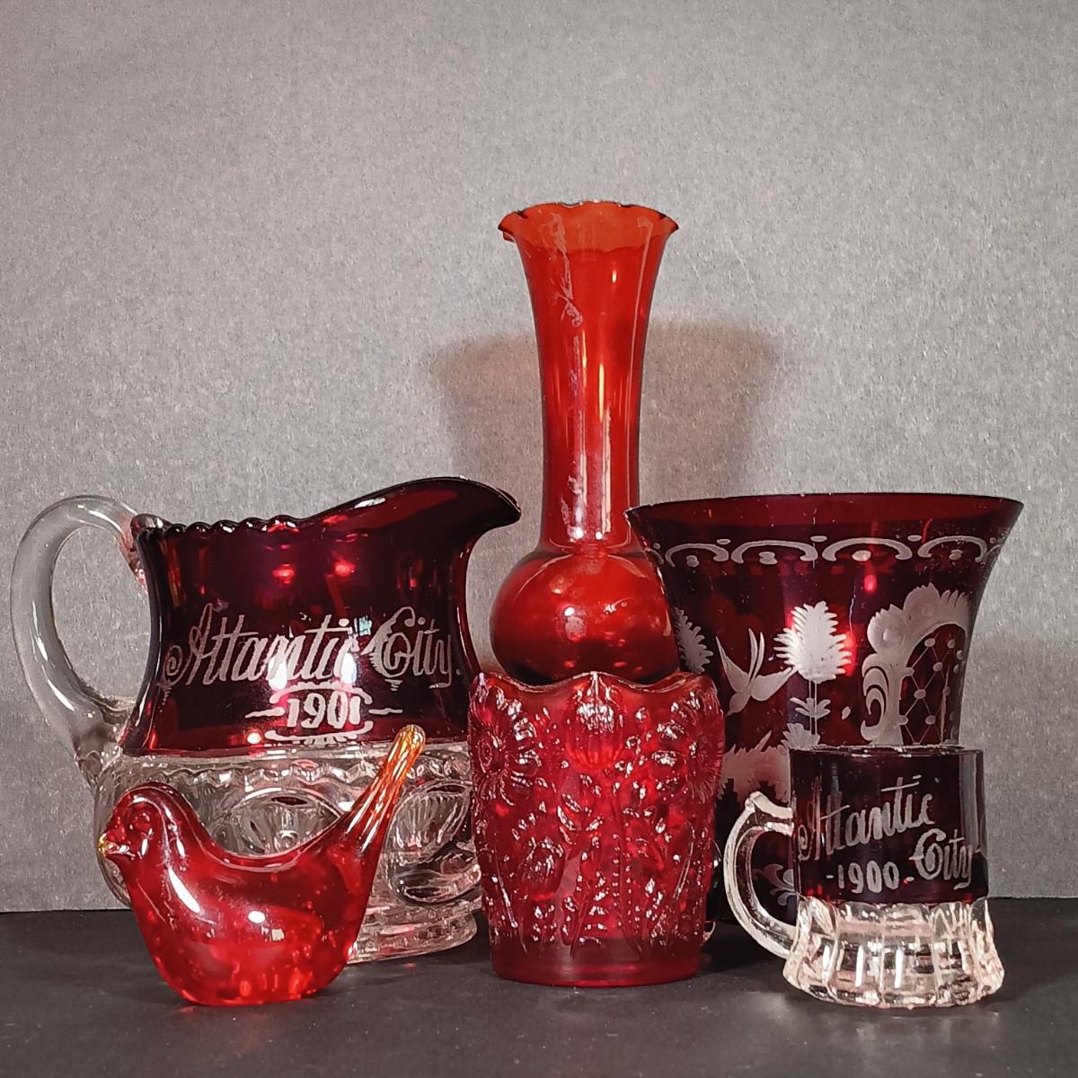 LOT 34: Vintage Ruby Red: Etched Vase, Little Bird, Vase, Atlantic City Thumbprint 1901 Souvenir Pitcher, Atlantic City 1900 Souvenir Shot Glass