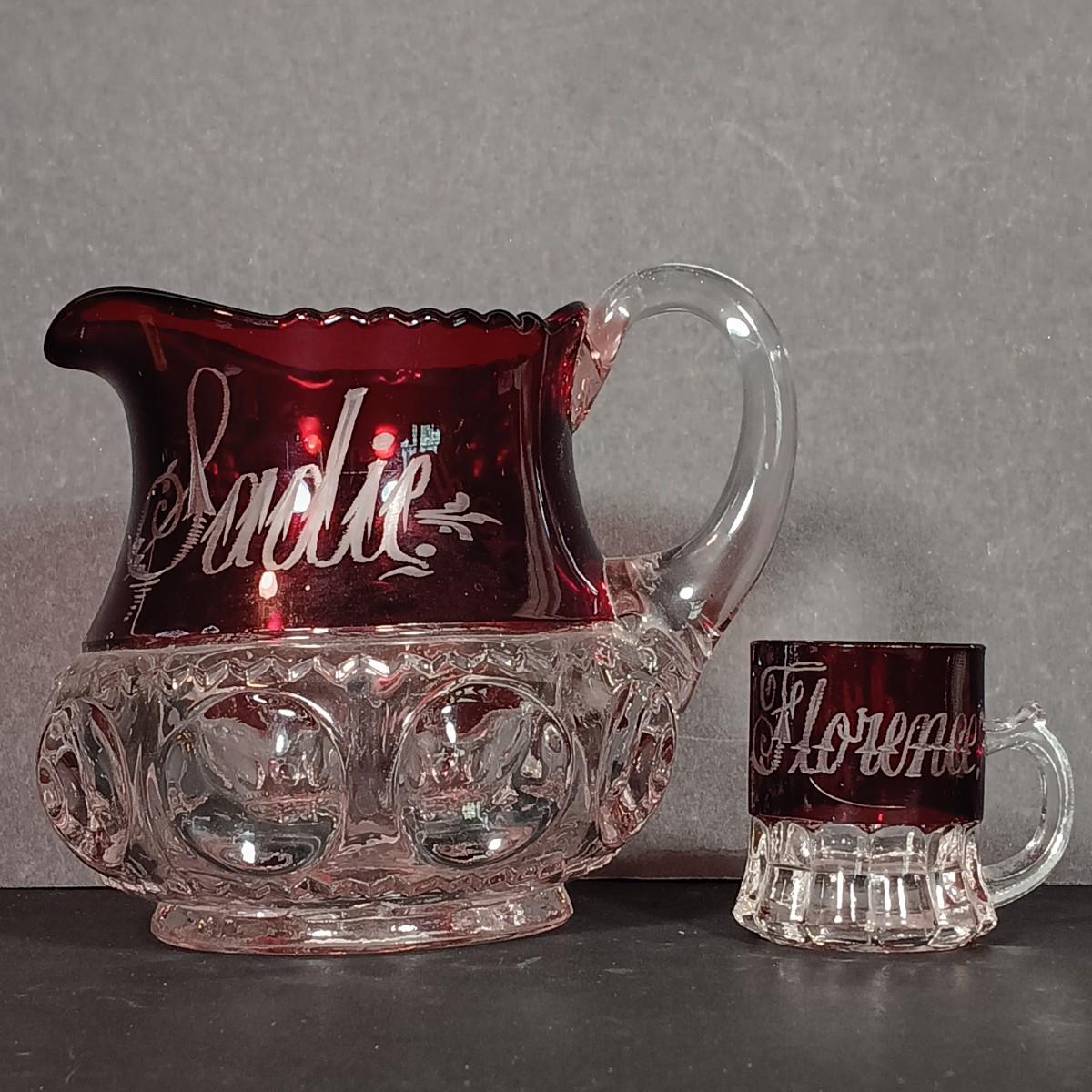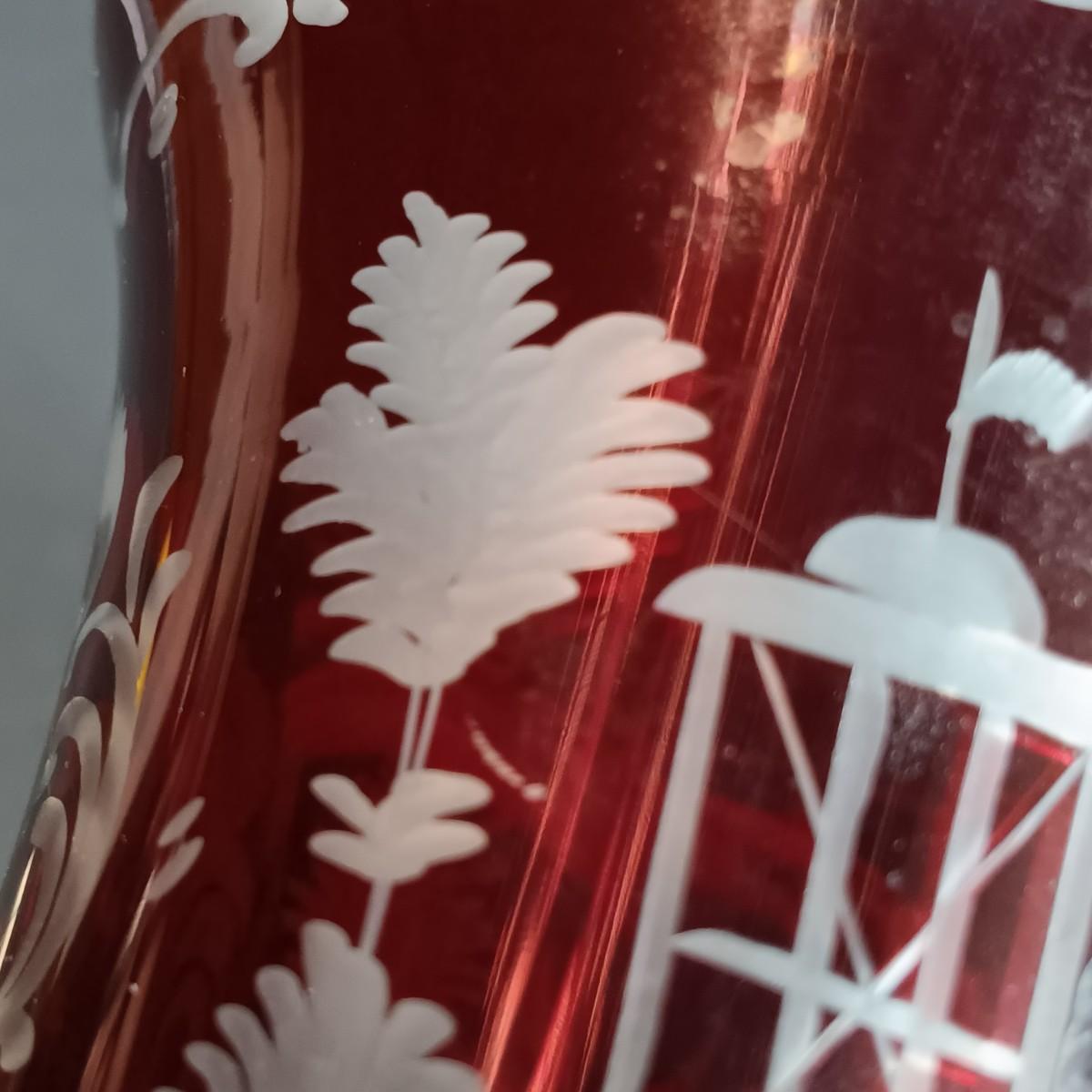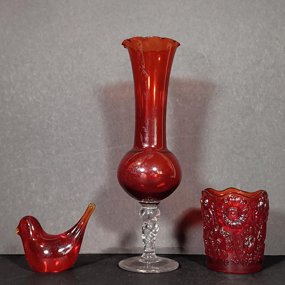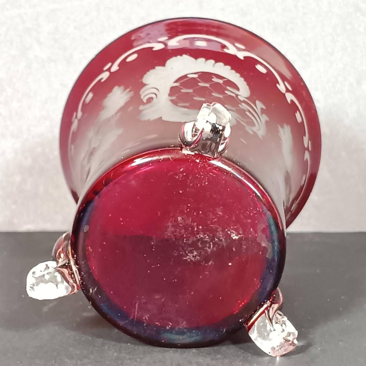 LOT 34: Vintage Ruby Red: Etched Vase, Little Bird, Vase, Atlantic City Thumbprint 1901 Souvenir Pitcher, Atlantic City 1900 Souvenir Shot Glass