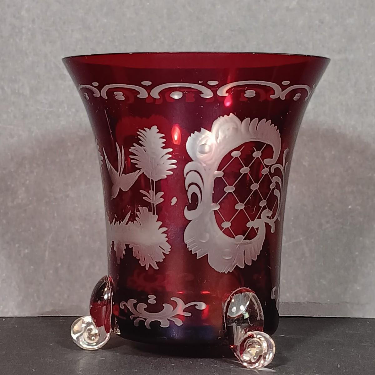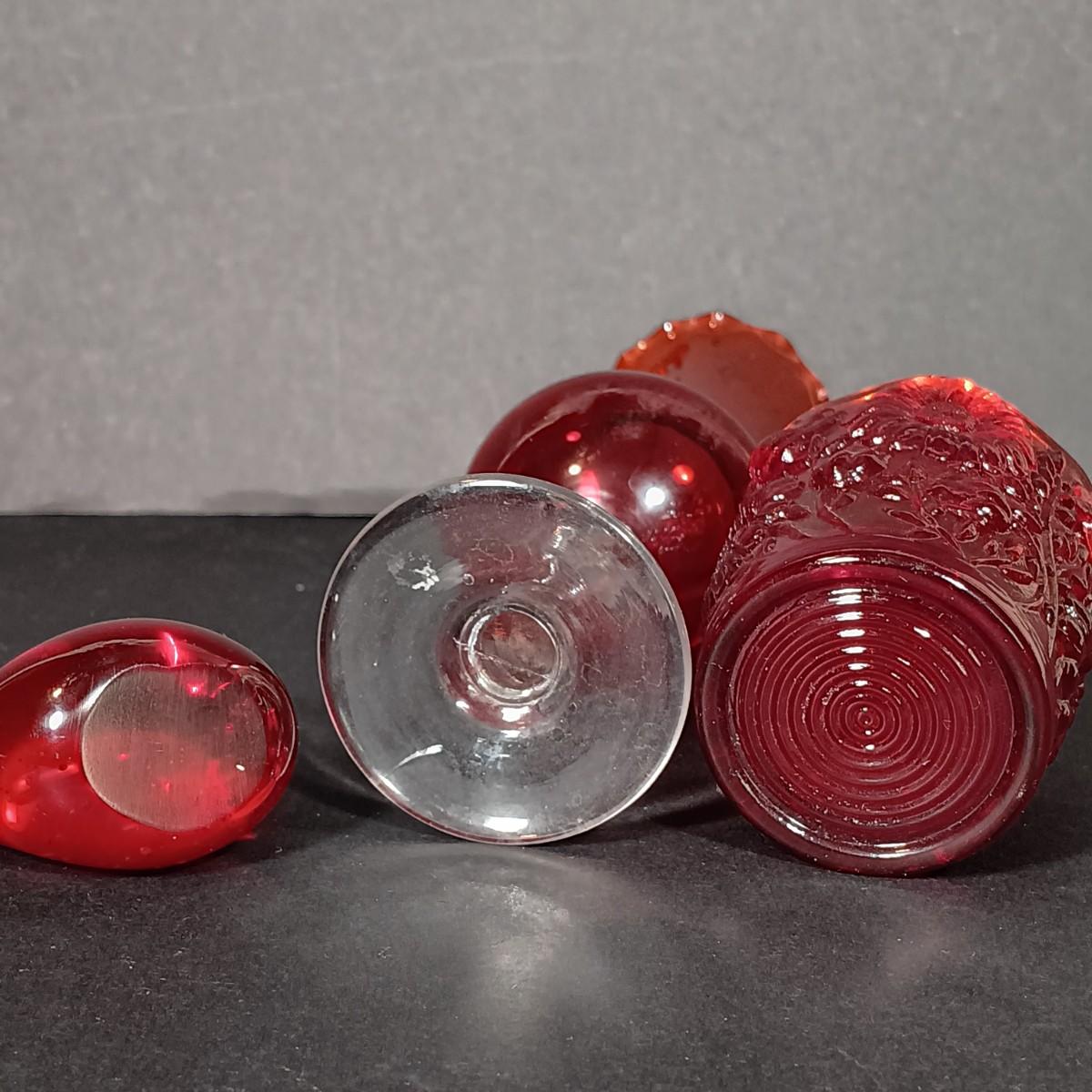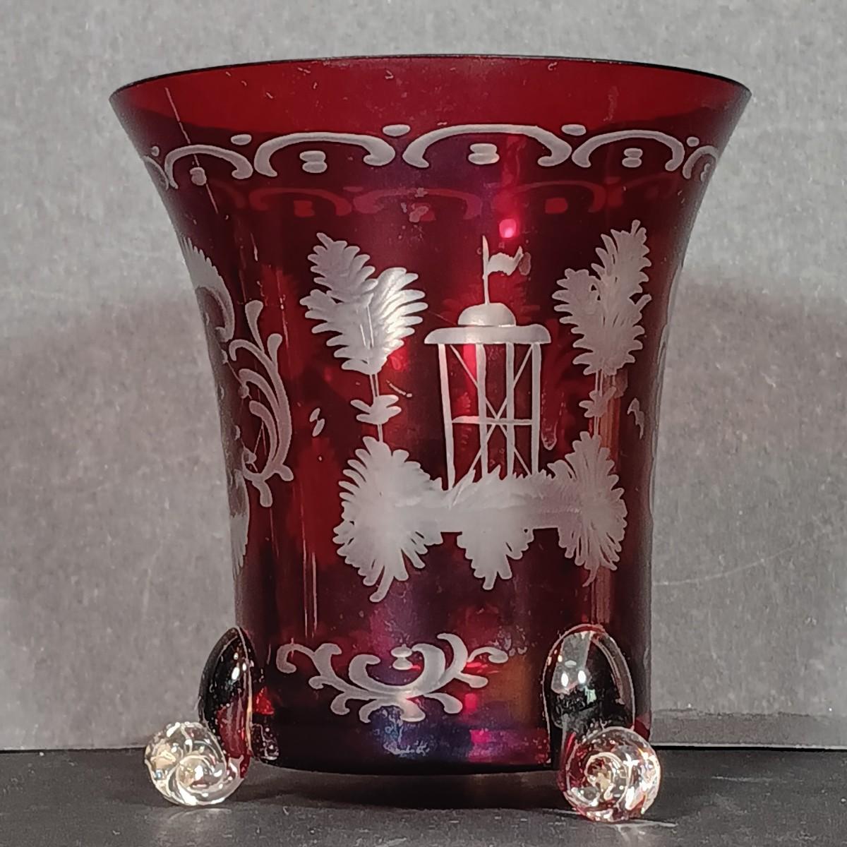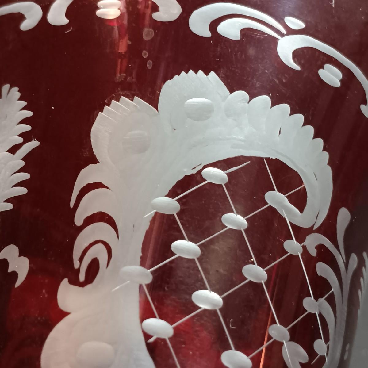 LOT 34: Vintage Ruby Red: Etched Vase, Little Bird, Vase, Atlantic City Thumbprint 1901 Souvenir Pitcher, Atlantic City 1900 Souvenir Shot Glass