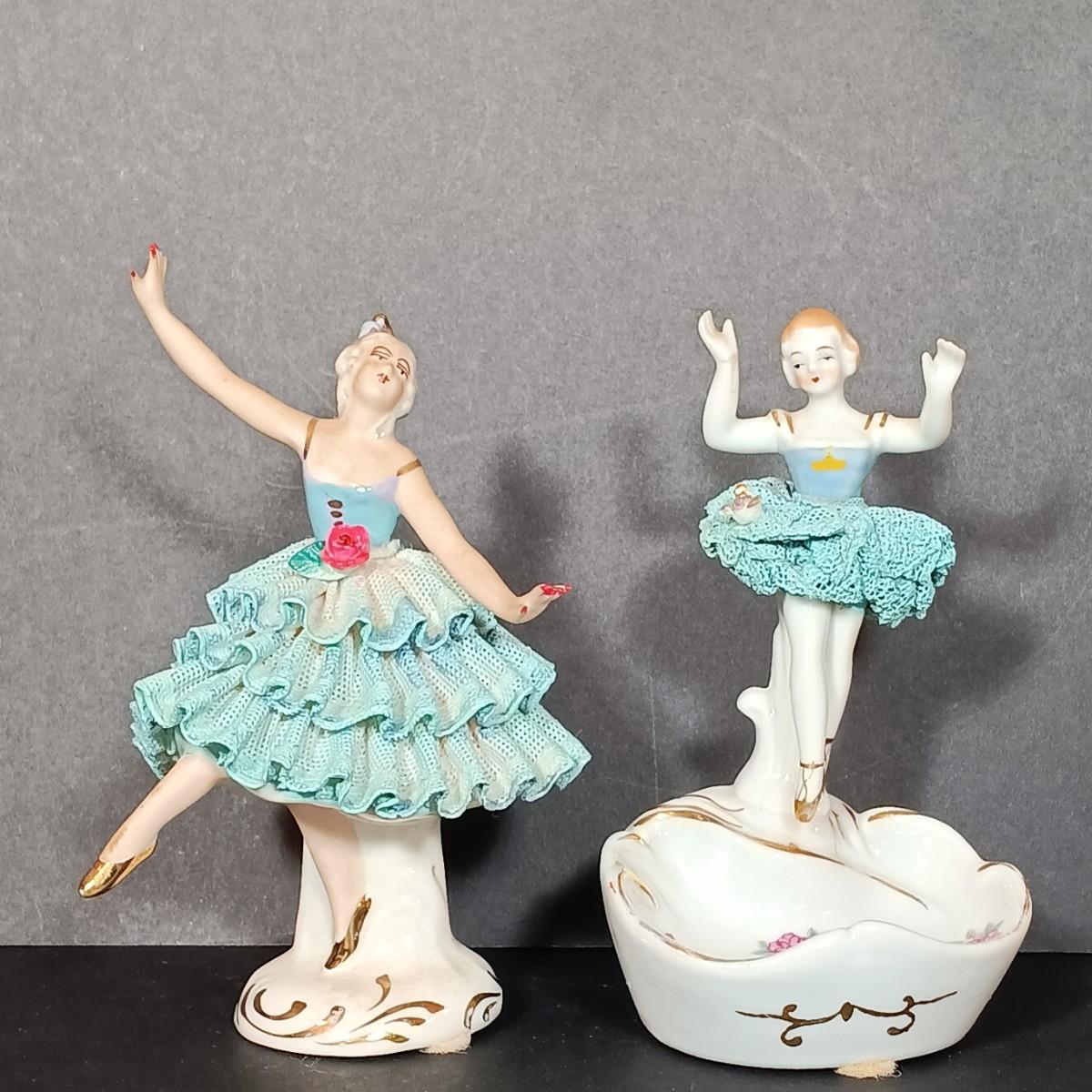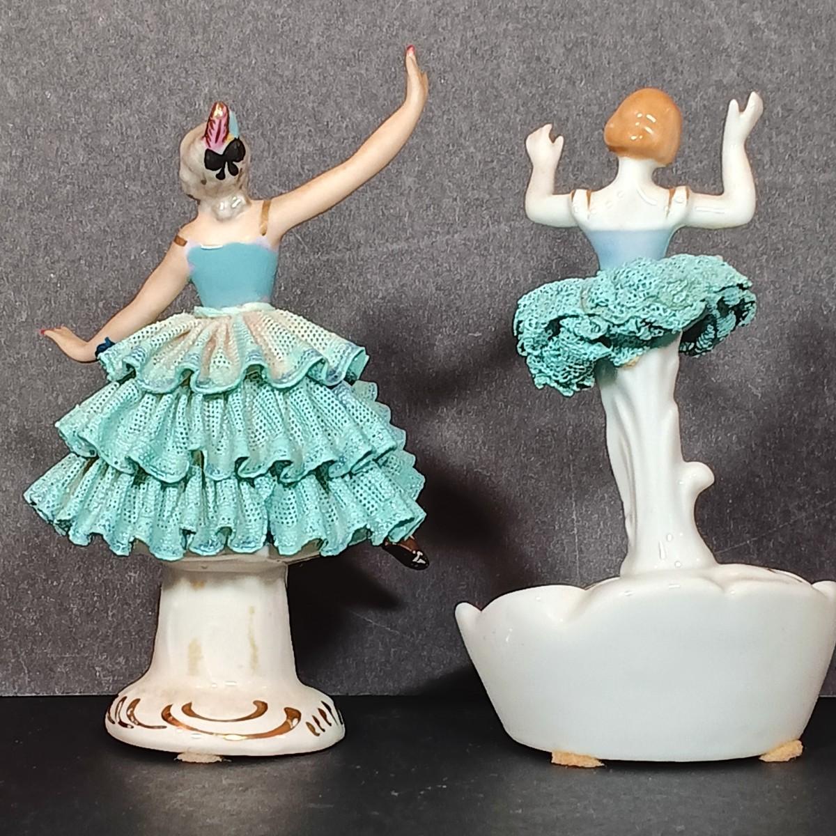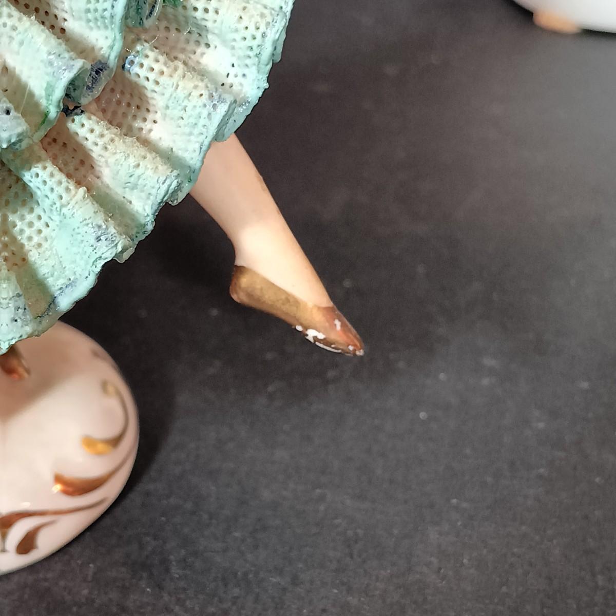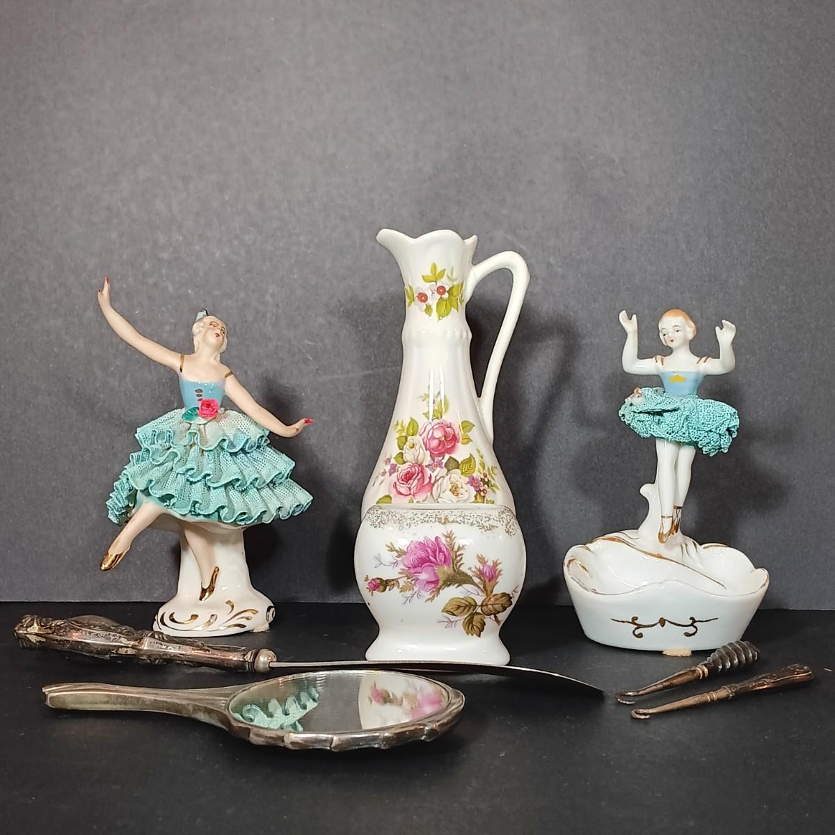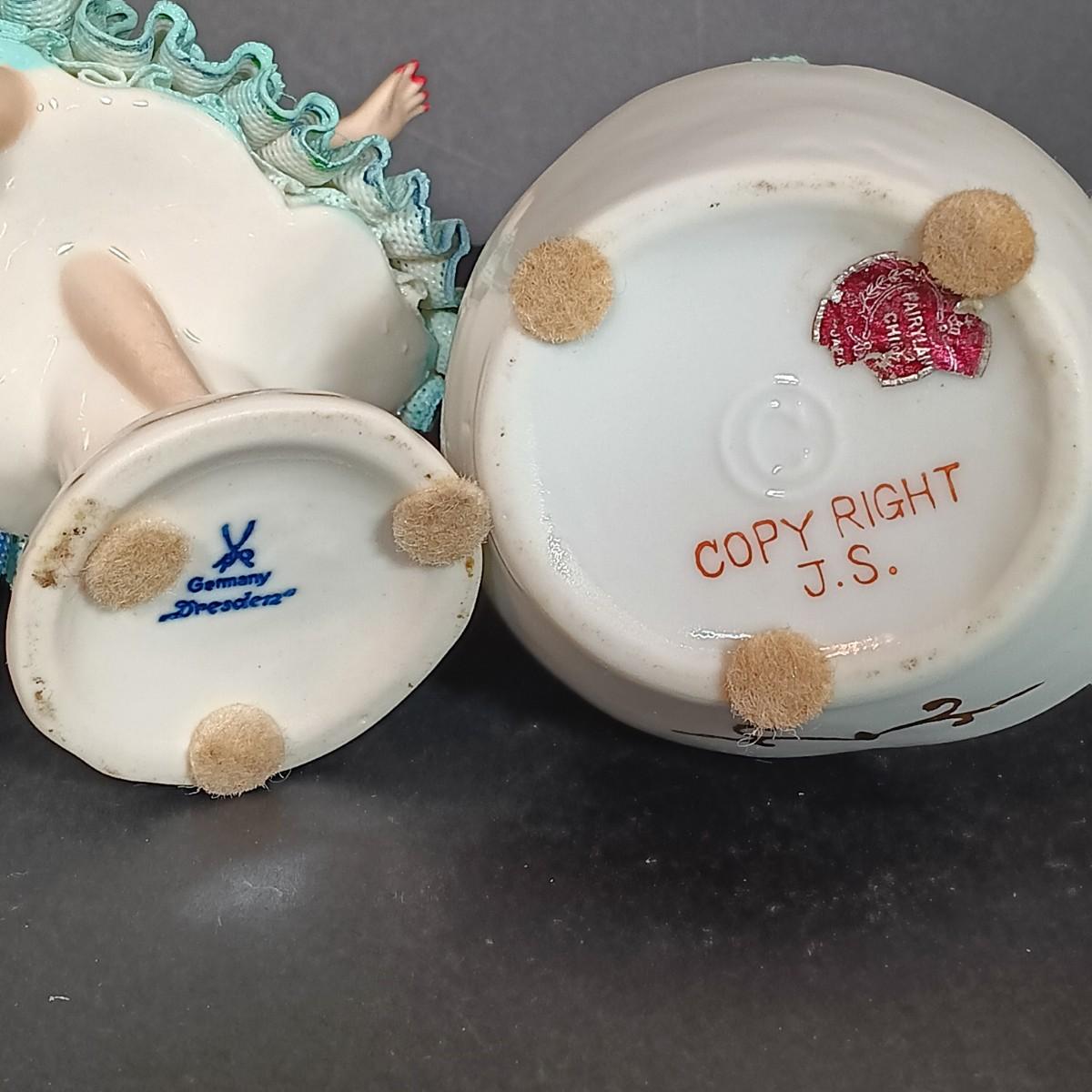 Dresden Figurines have condition issues as pictured. Porcelain Pitcher has condition issues as shown.