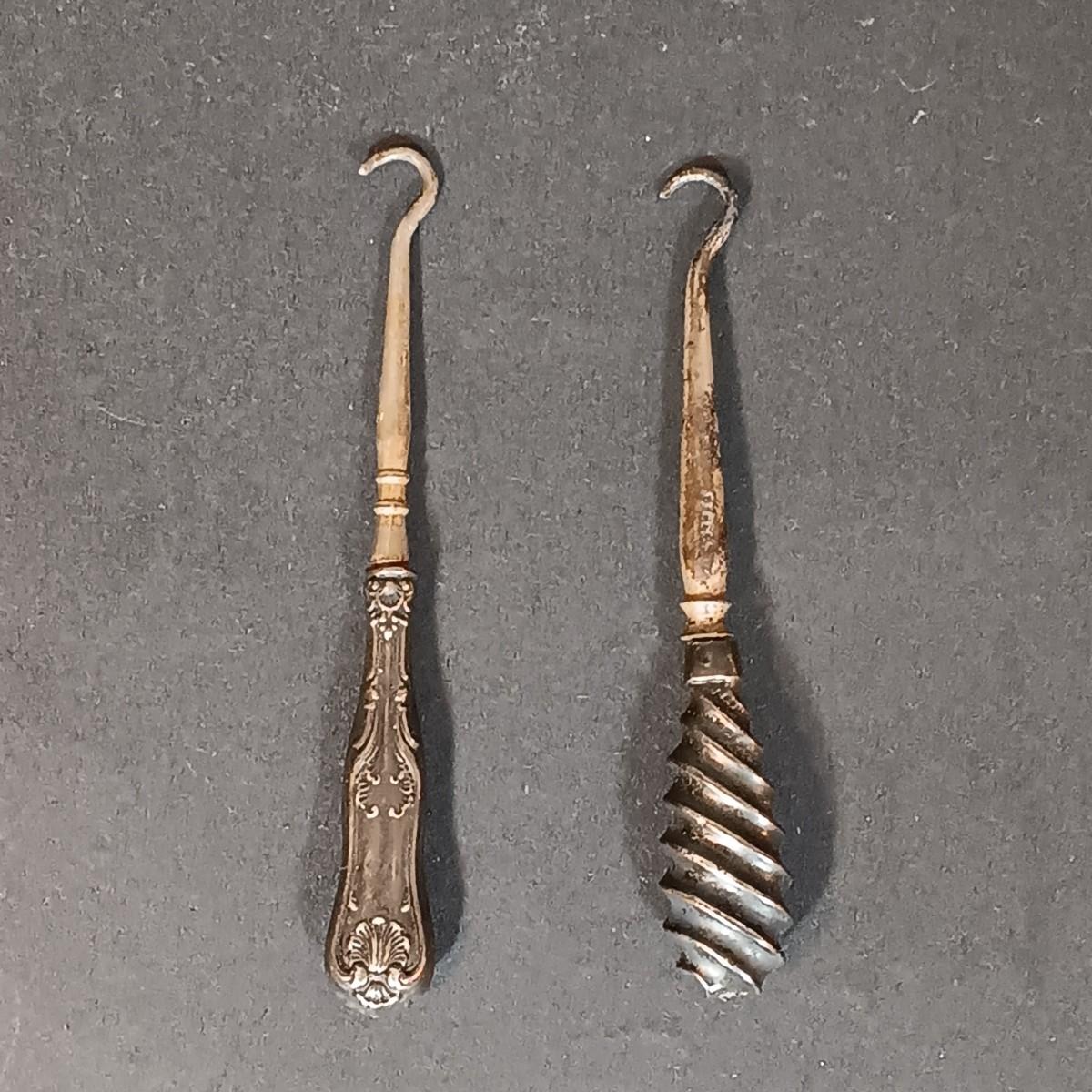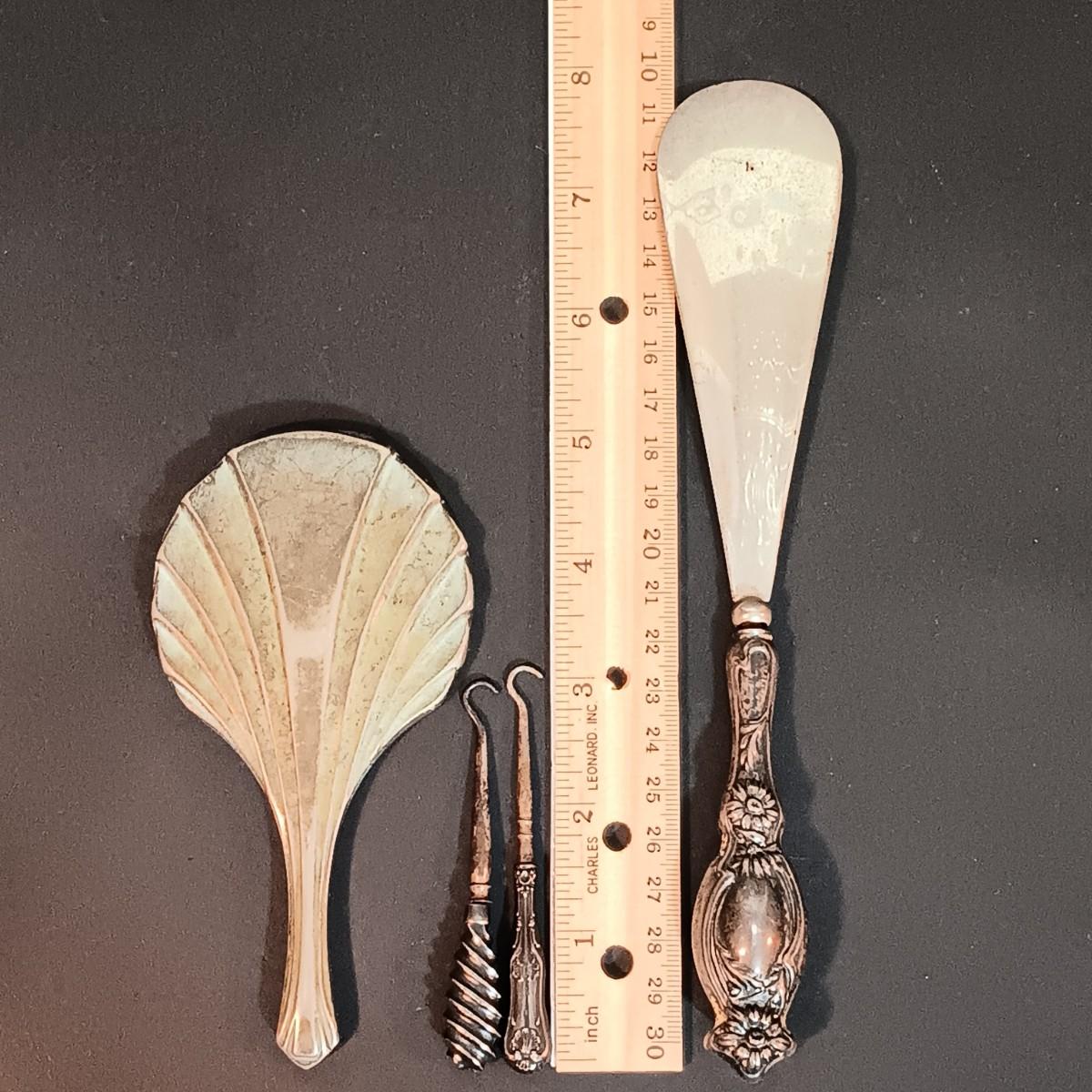 LOT 40: Sterling Silver Glove Hooks & Shoehorn, Vintage Dresden Figurines & More