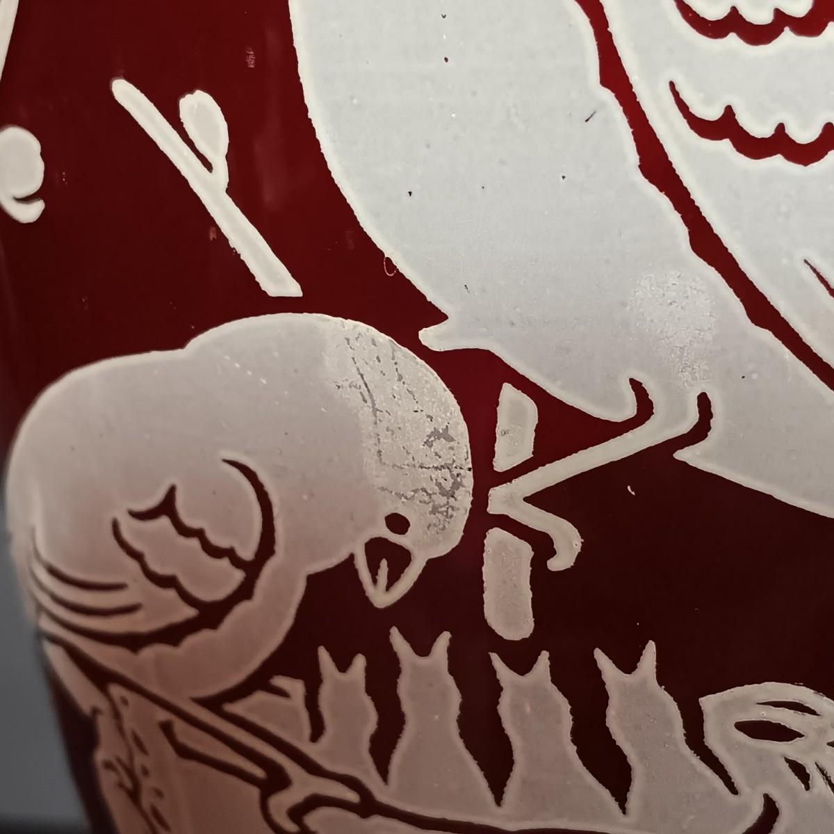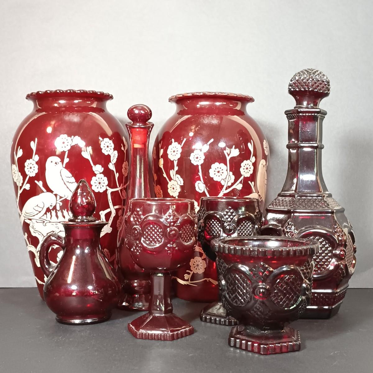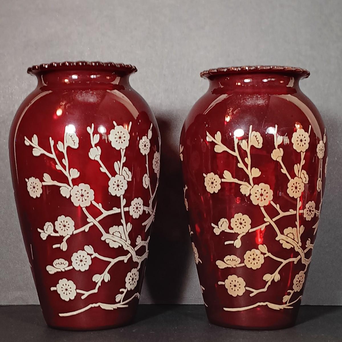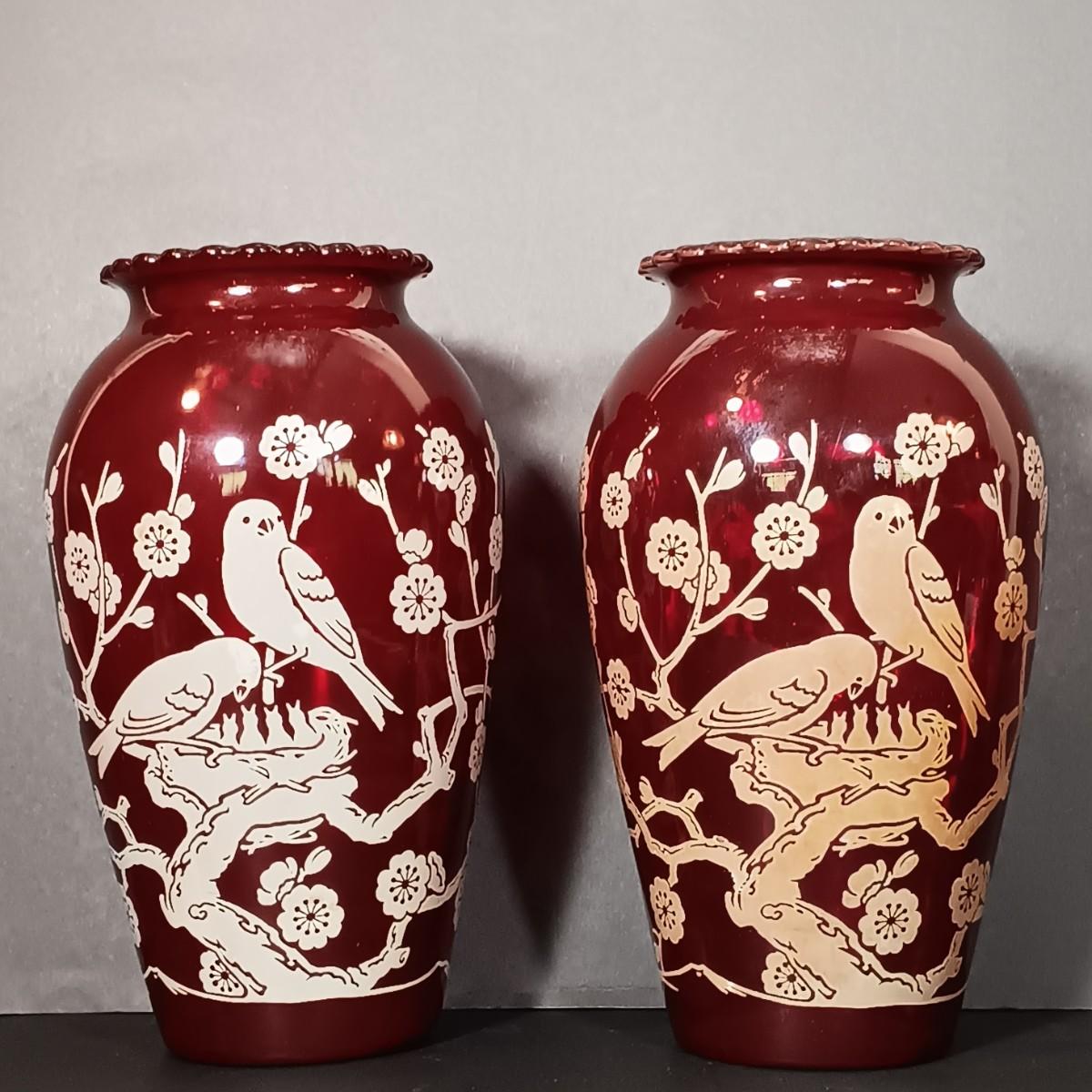 LOT 41: Pair of Vintage Mid-Century Red Ruby Glass Vases w/White Birds & Flowers & More