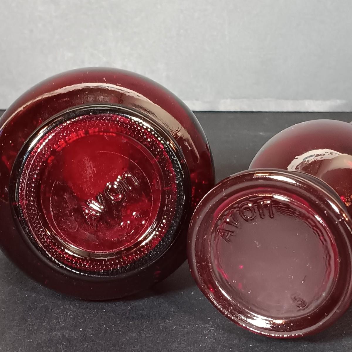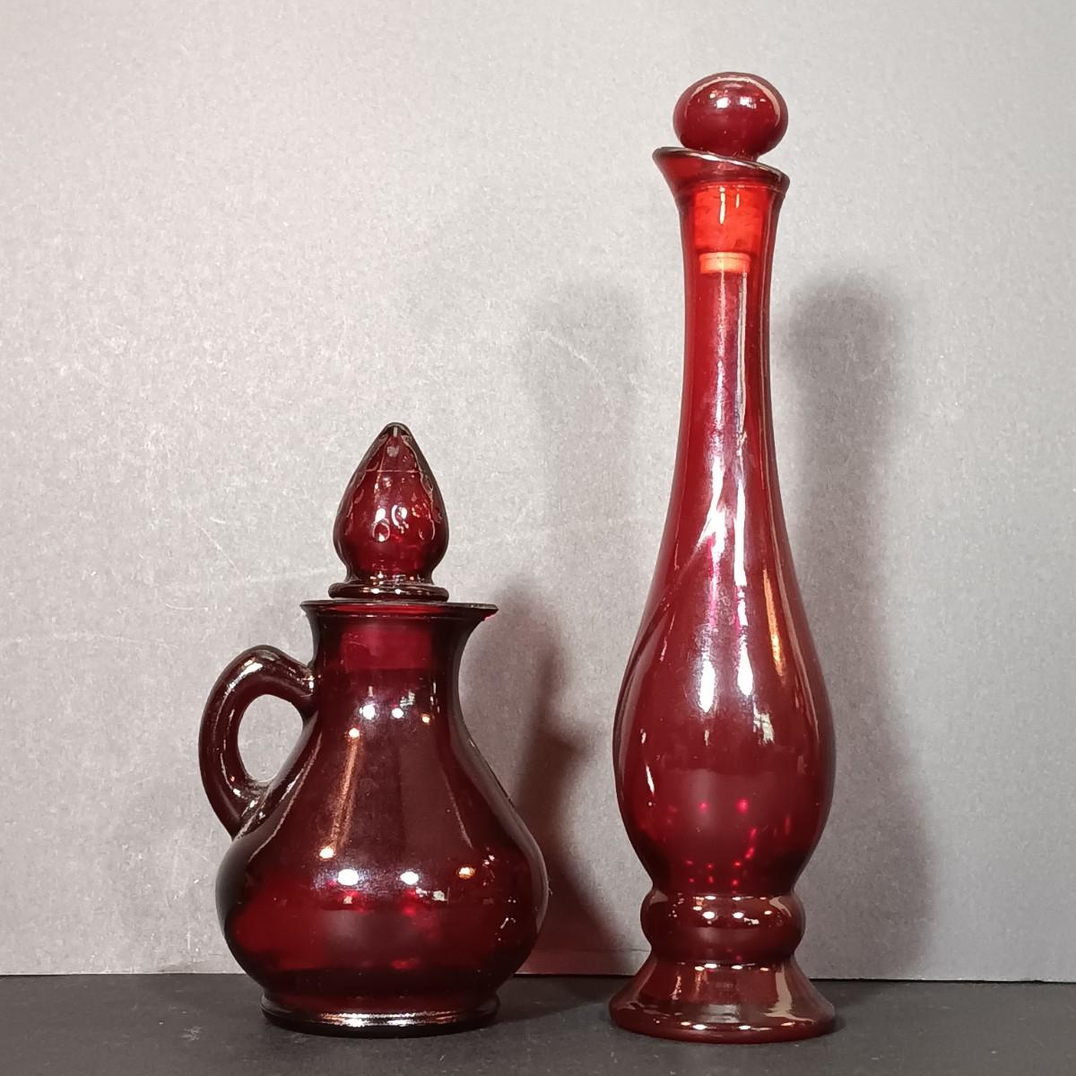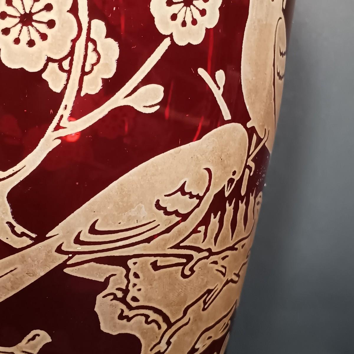 LOT 41: Pair of Vintage Mid-Century Red Ruby Glass Vases w/White Birds & Flowers & More