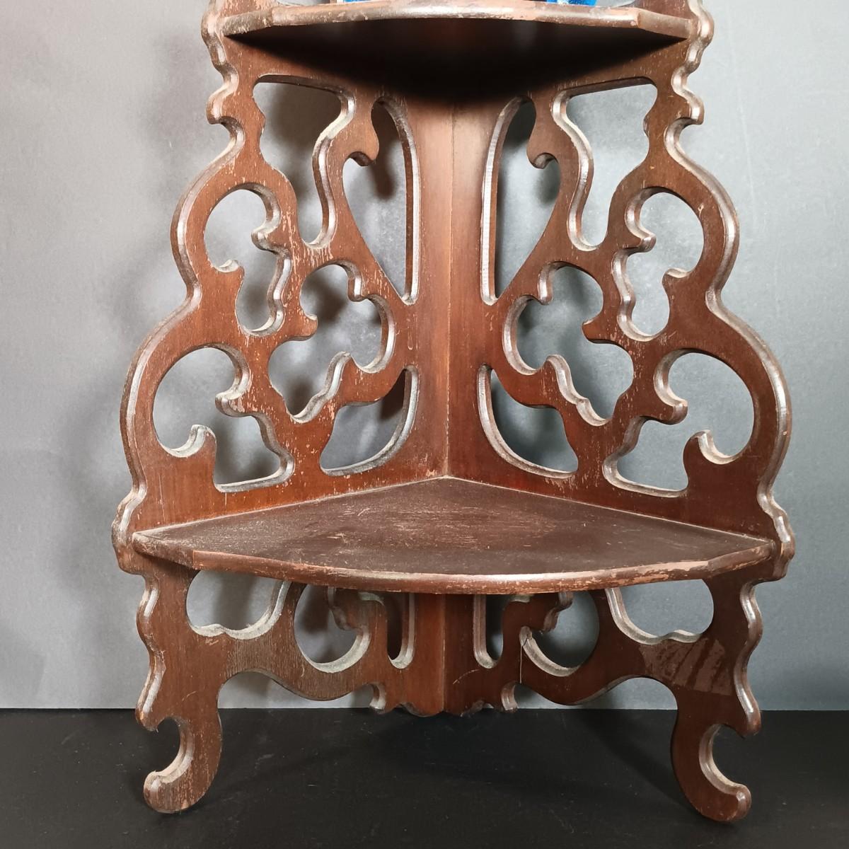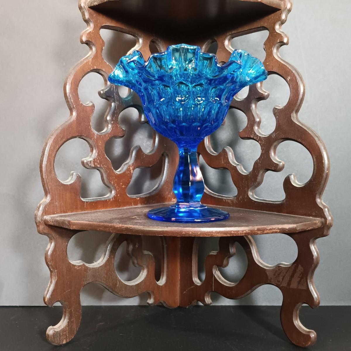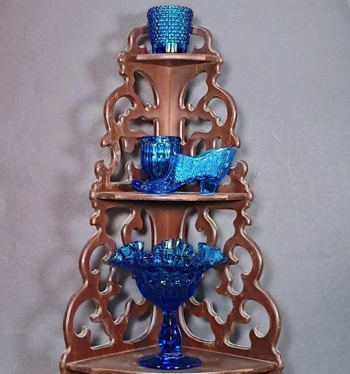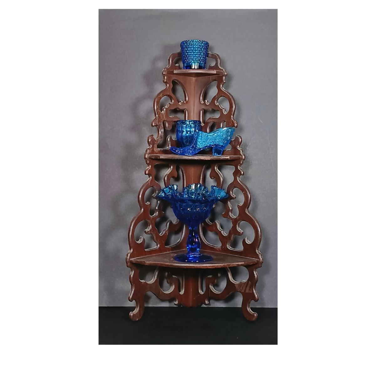LOT 54: Vintage Corner 3-Tier Shelf & Blue Glass Thumbprint Compote Dish, Shoe, Candle Holders