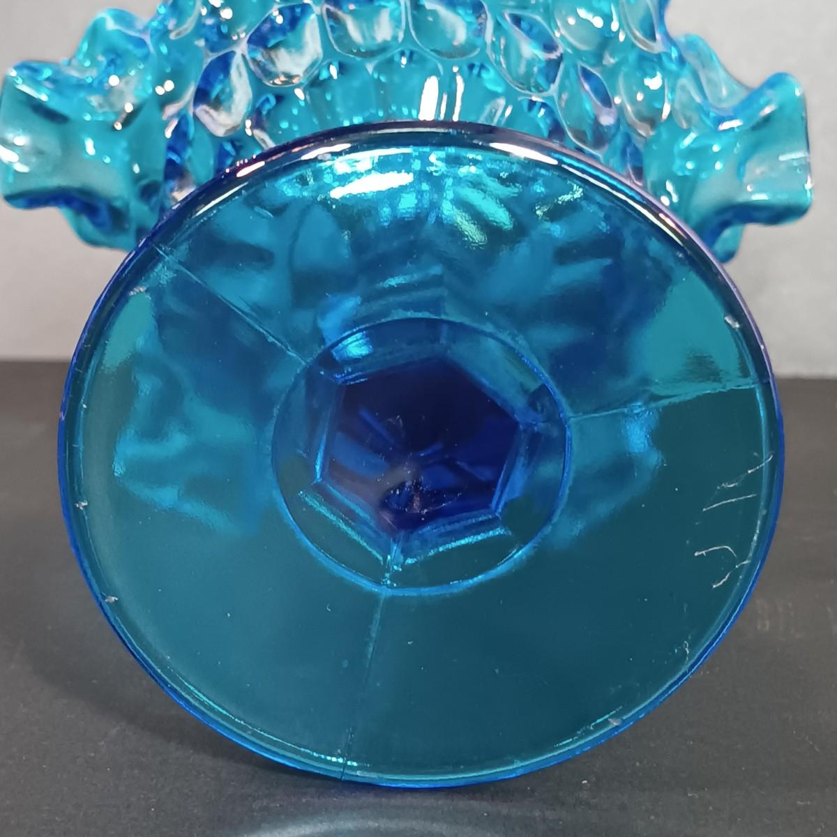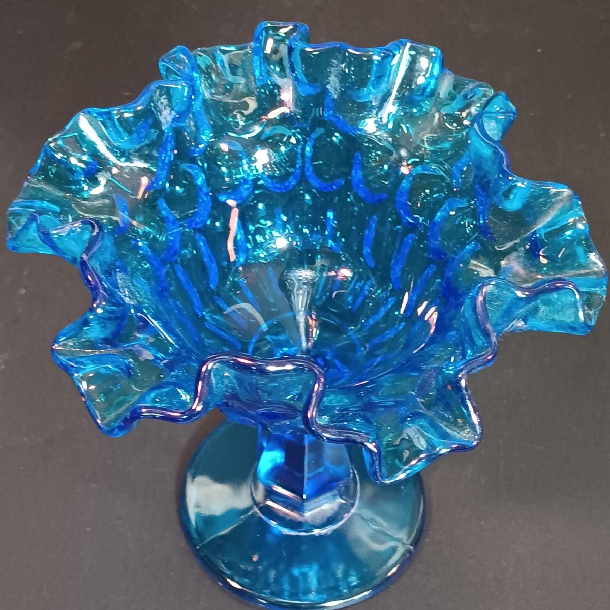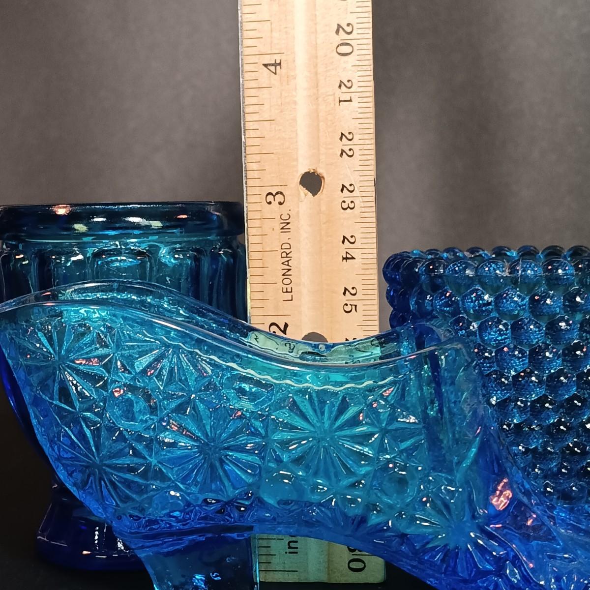 LOT 54: Vintage Corner 3-Tier Shelf & Blue Glass Thumbprint Compote Dish, Shoe, Candle Holders