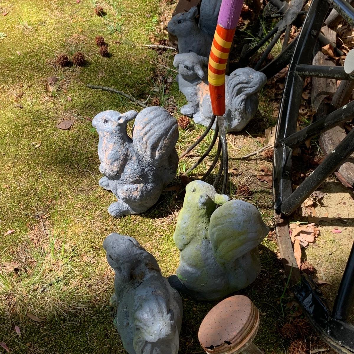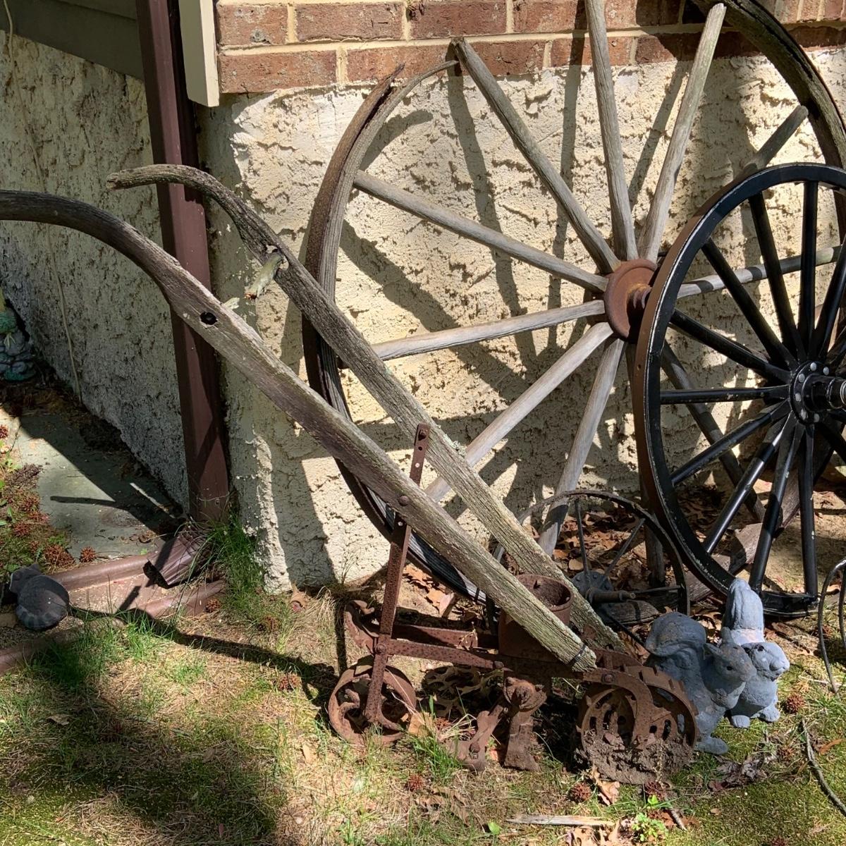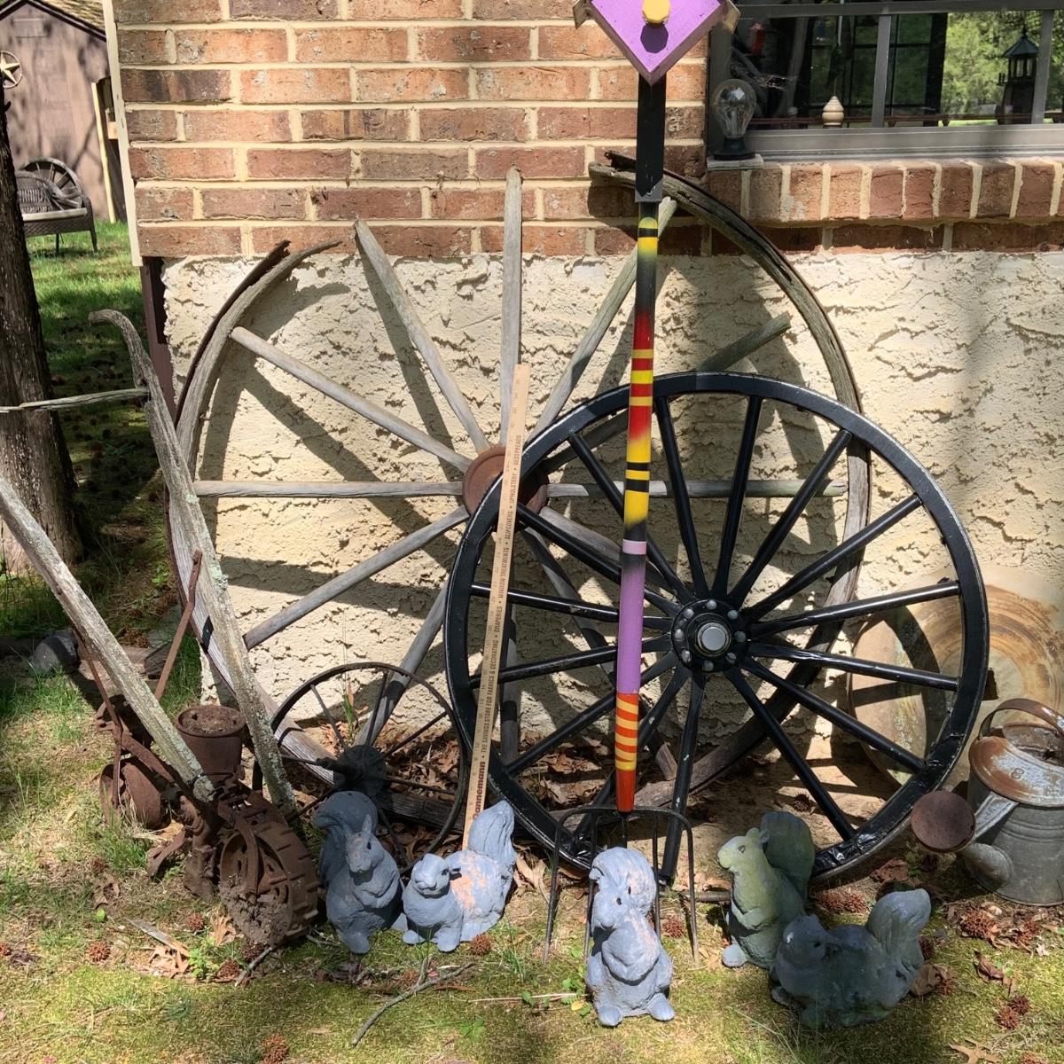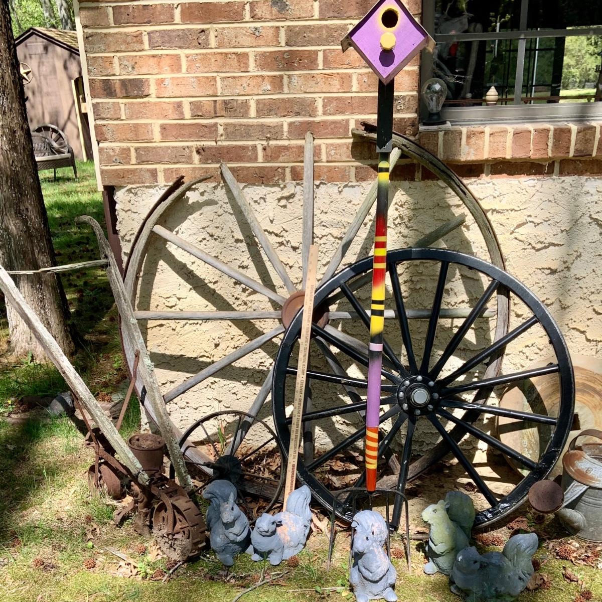 LOT:63: Yard Art Collection of Resin Squirrels, Antique/Vintage Wagon Wheels Stone Wheel and Other Garding Tools