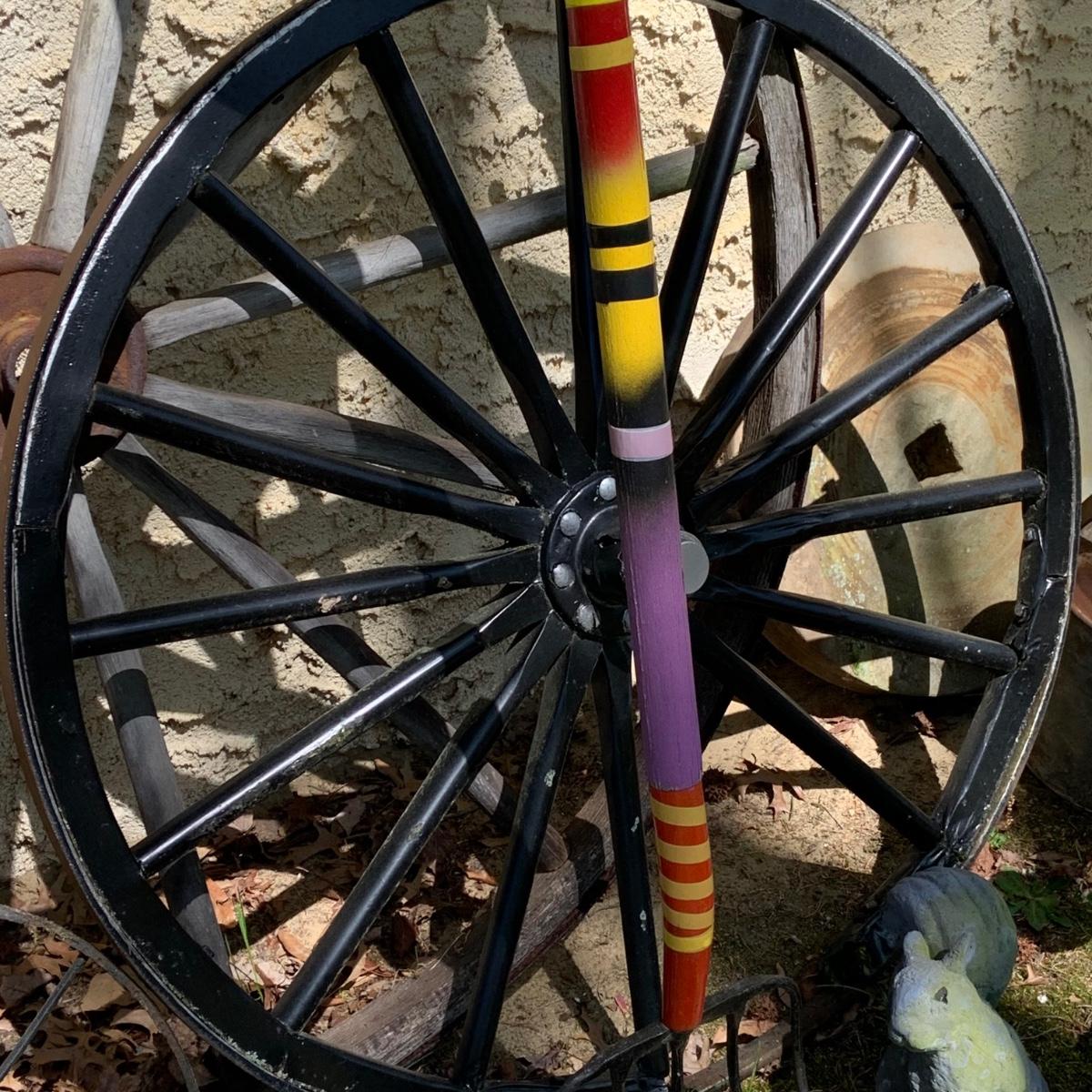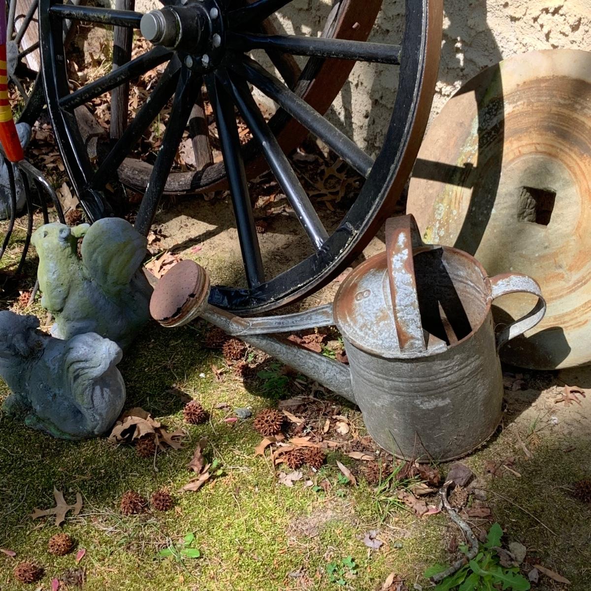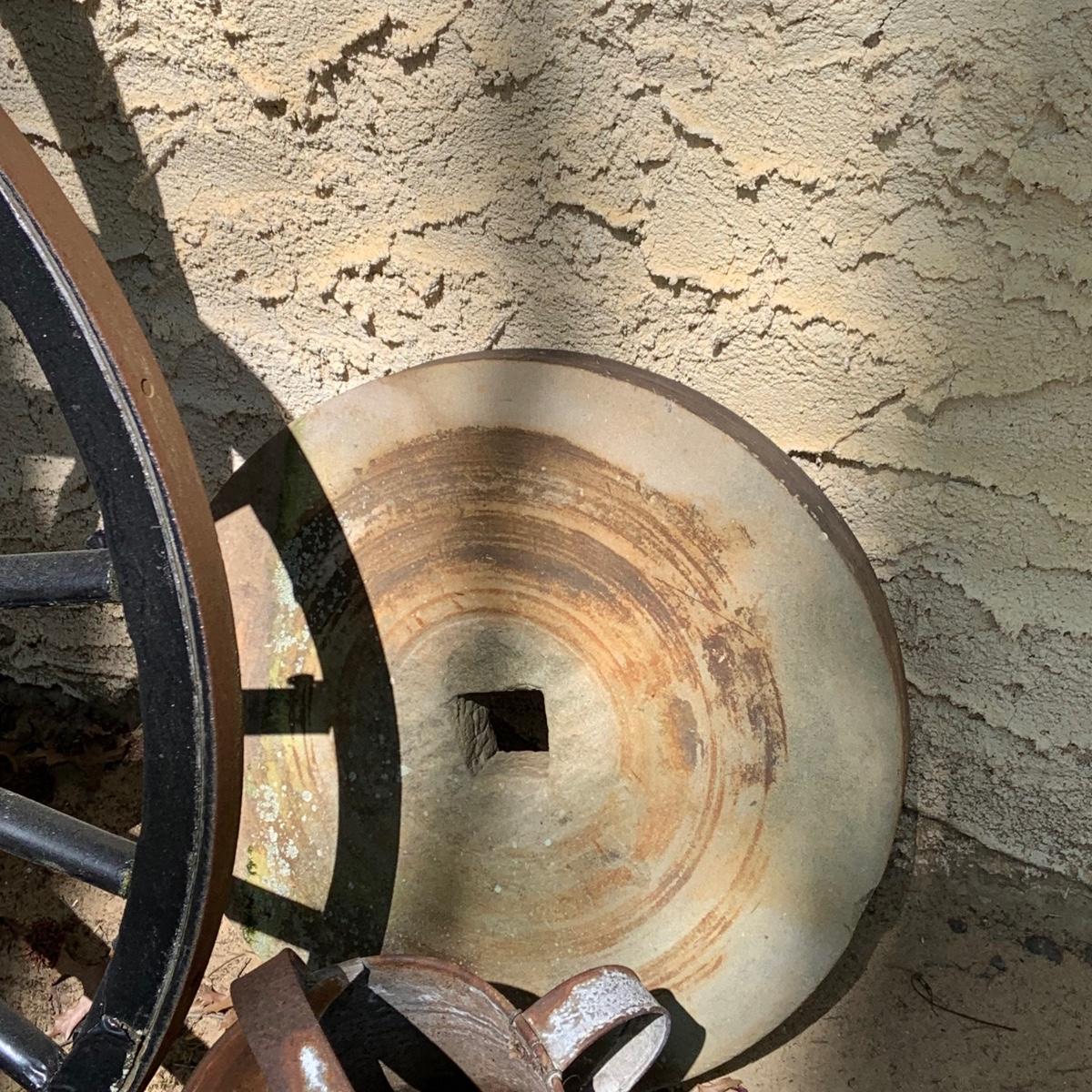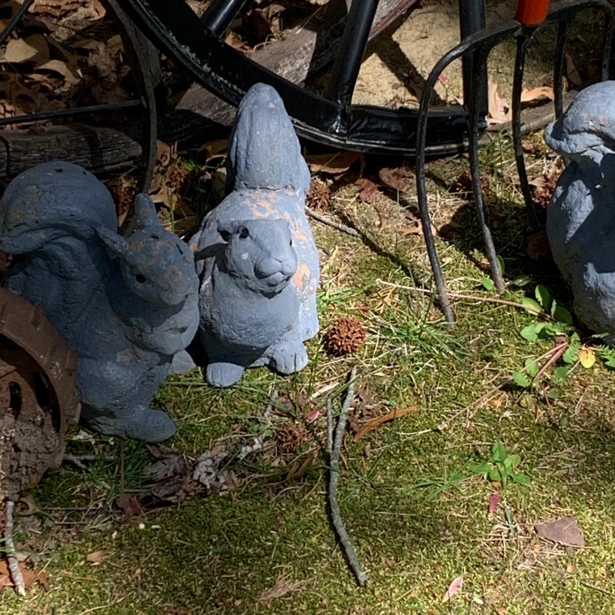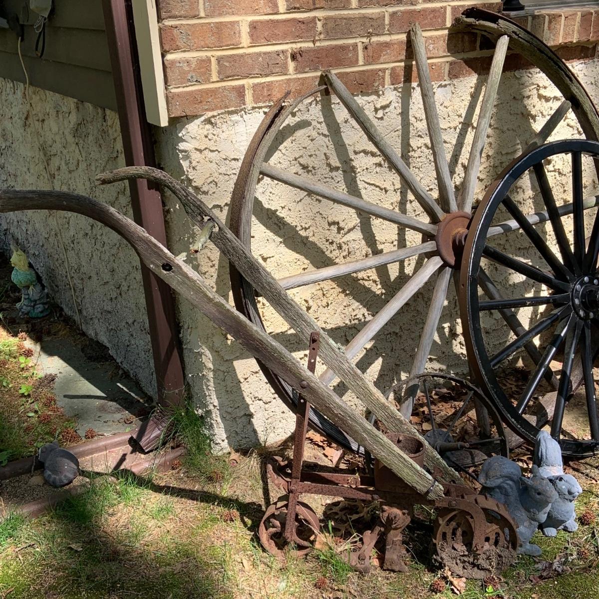 LOT:63: Yard Art Collection of Resin Squirrels, Antique/Vintage Wagon Wheels Stone Wheel and Other Garding Tools