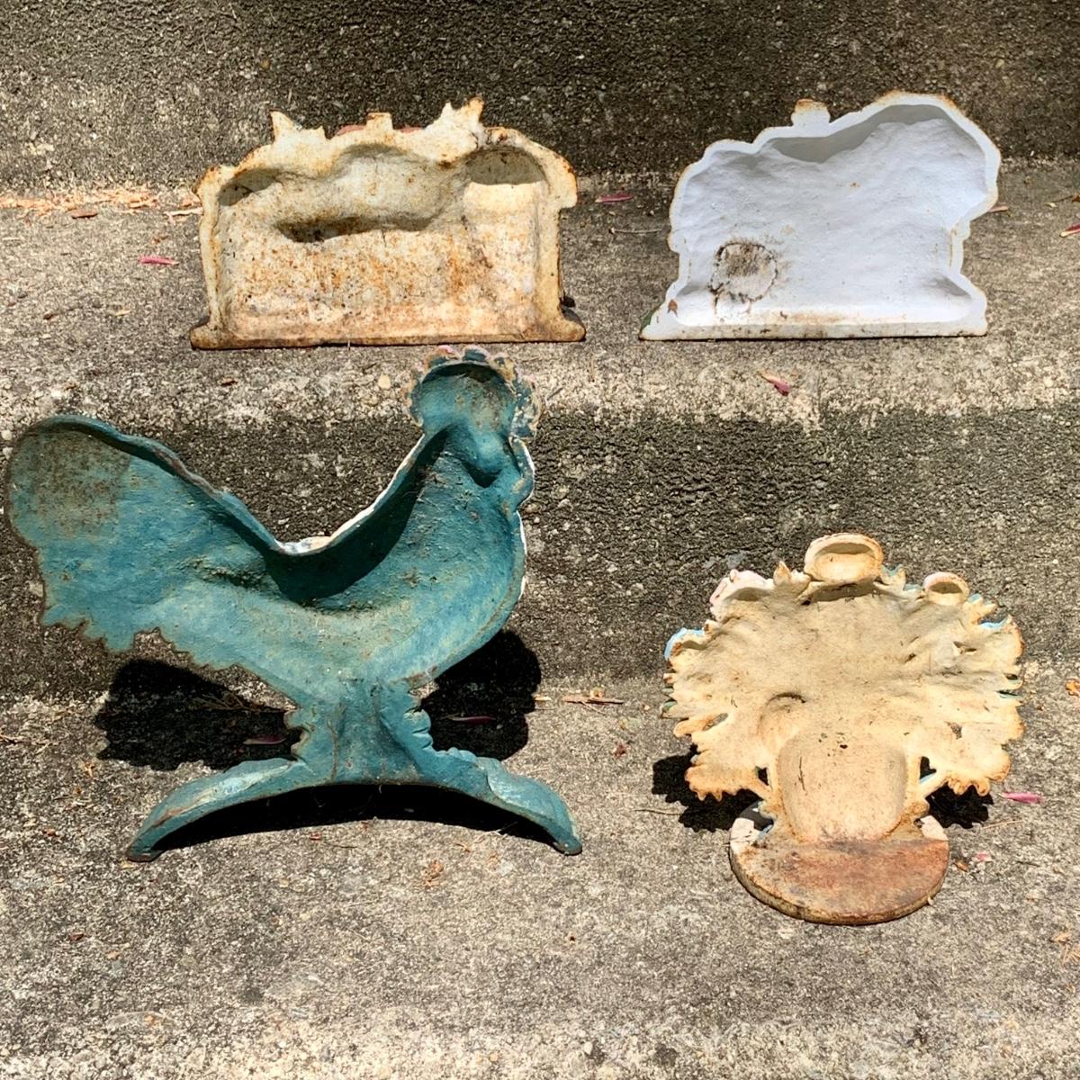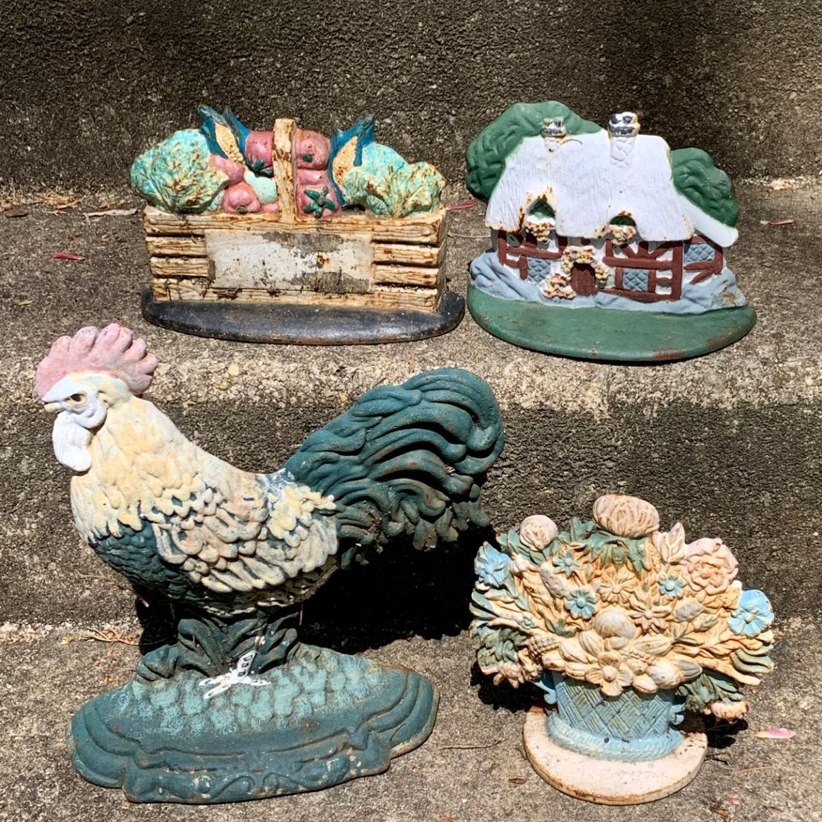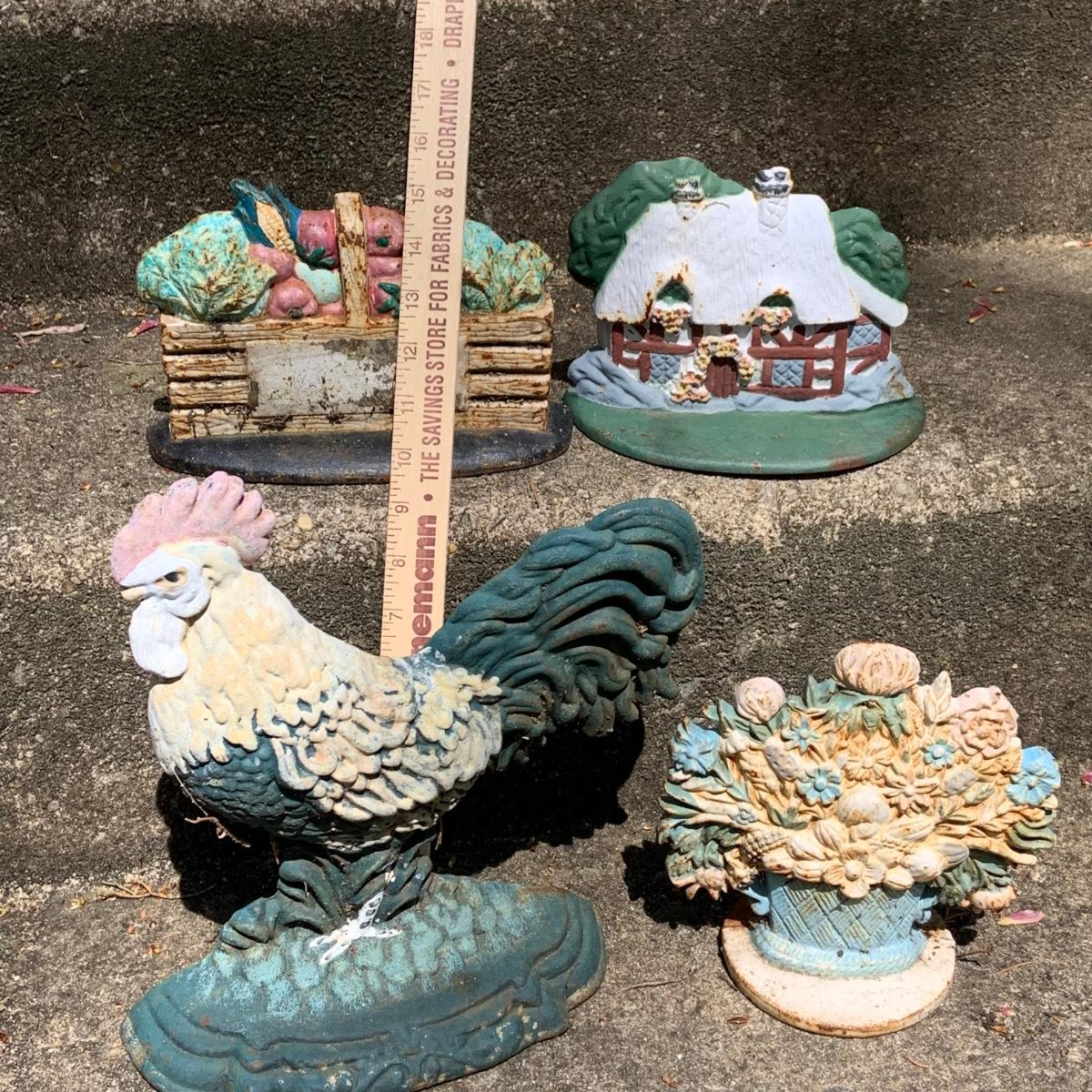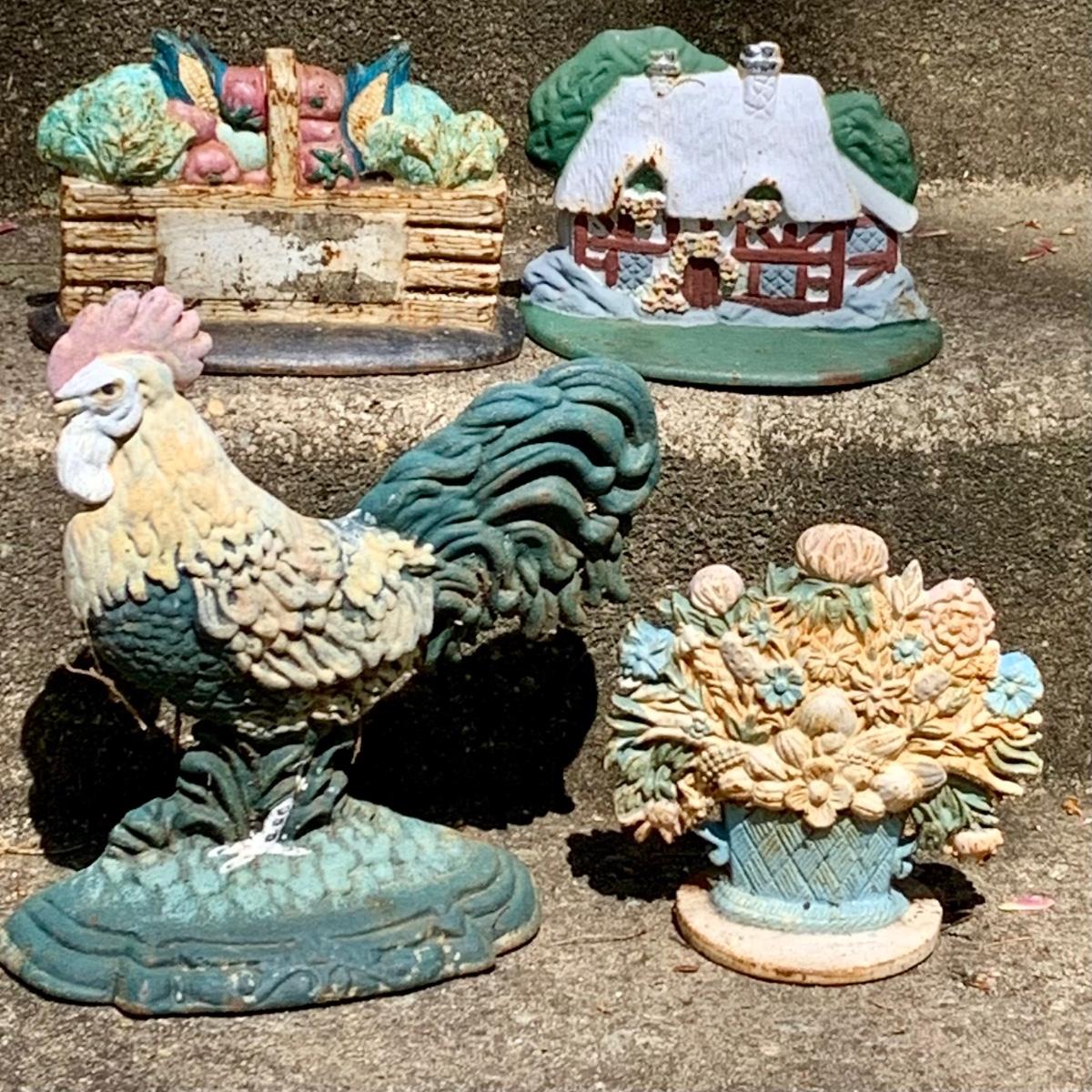 LOT:64: Vintage Painted Cast Iron Door Stops - Rooster, Flowers, Vegetable Basket, and Winter Cottage