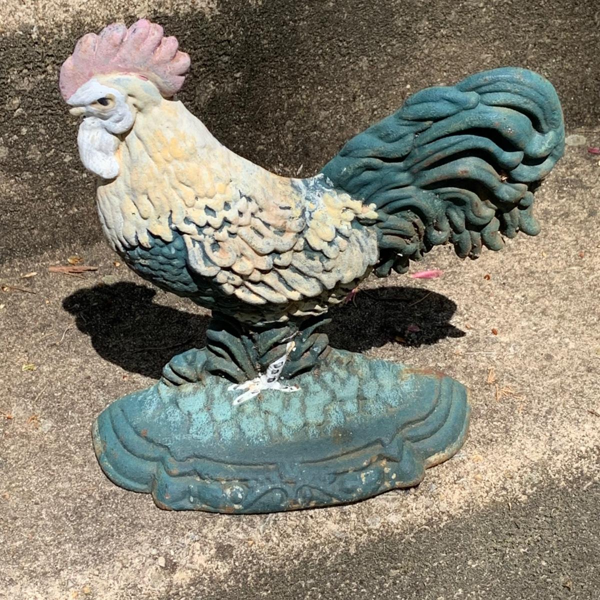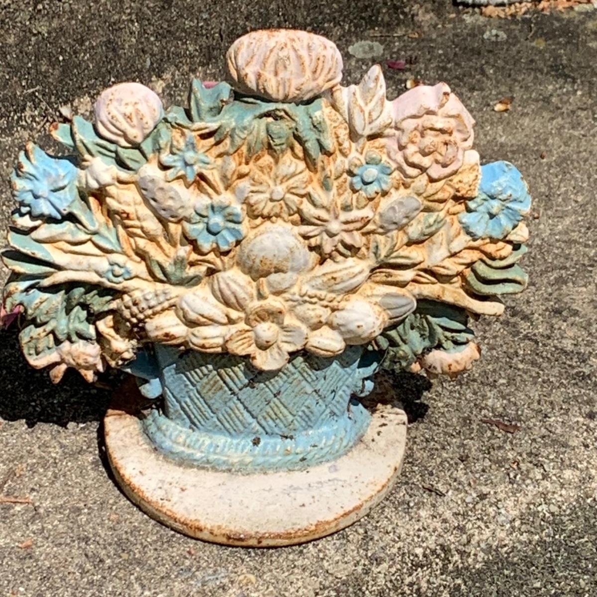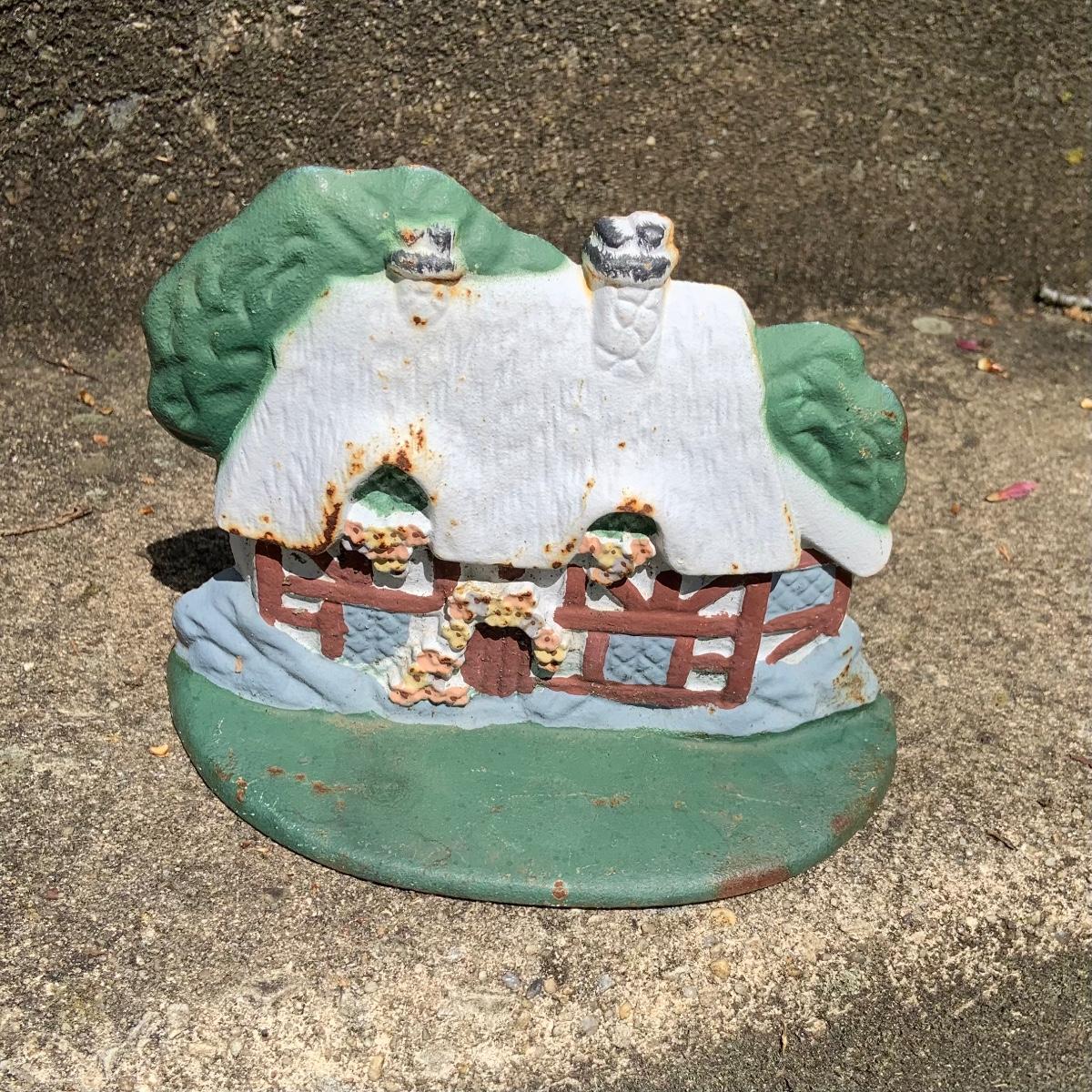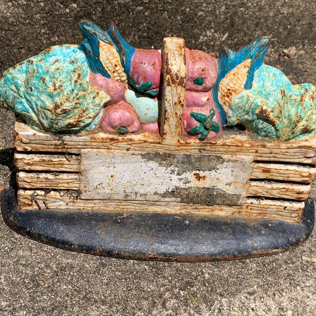 LOT:64: Vintage Painted Cast Iron Door Stops - Rooster, Flowers, Vegetable Basket, and Winter Cottage