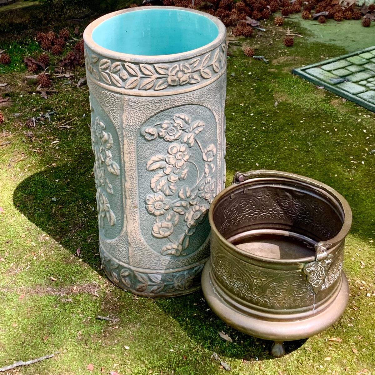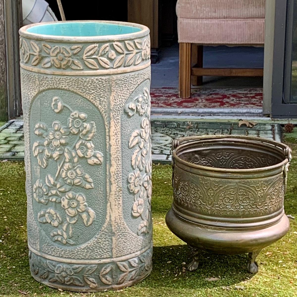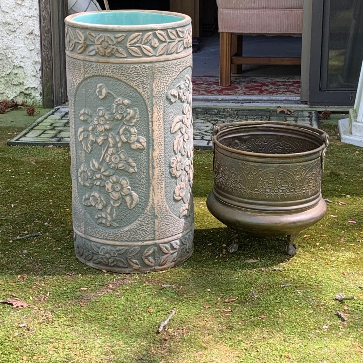 LOT 72: Robinson Ransbottom Pottery Style Umbrella Stand and Brass/Cooper Footed Pot with Handle