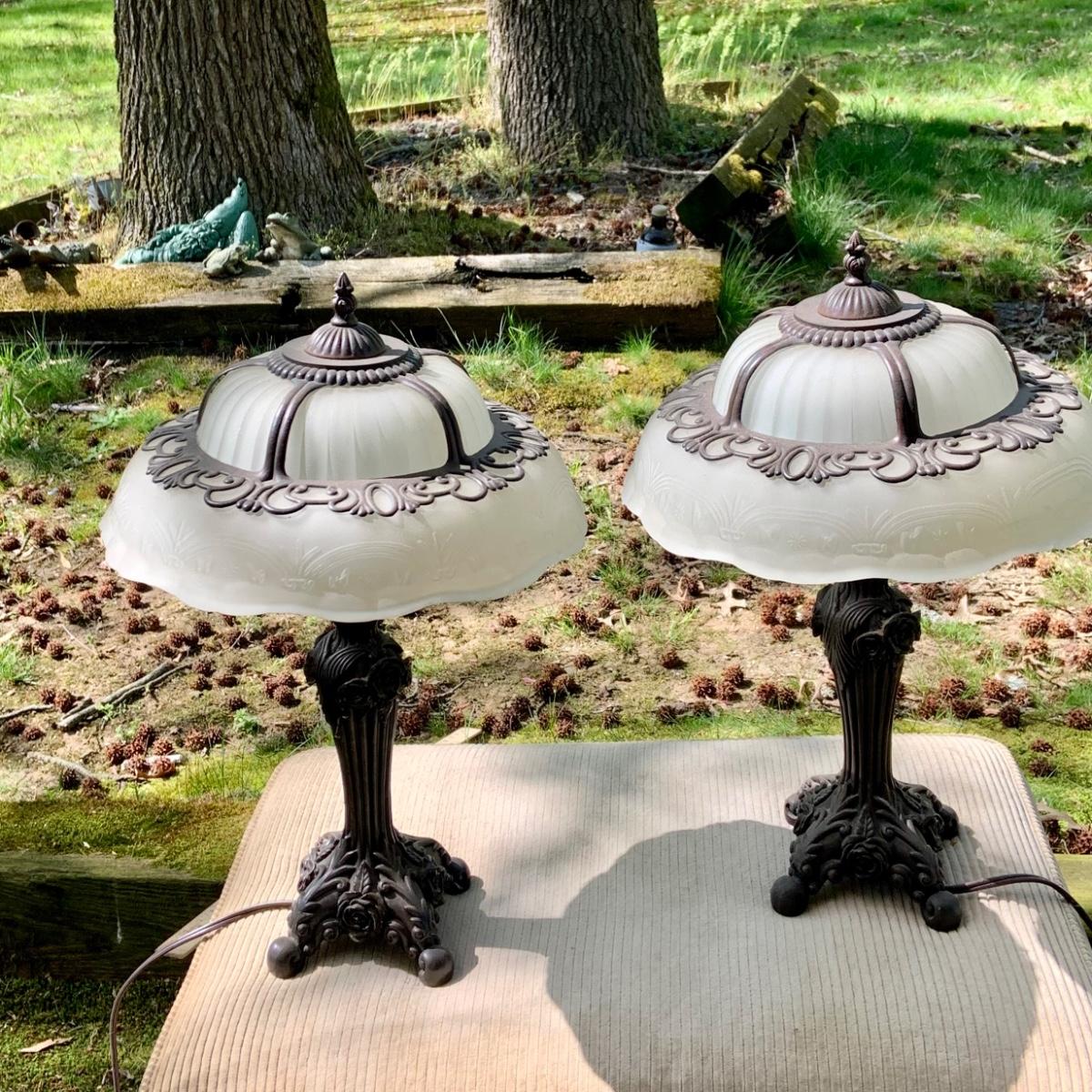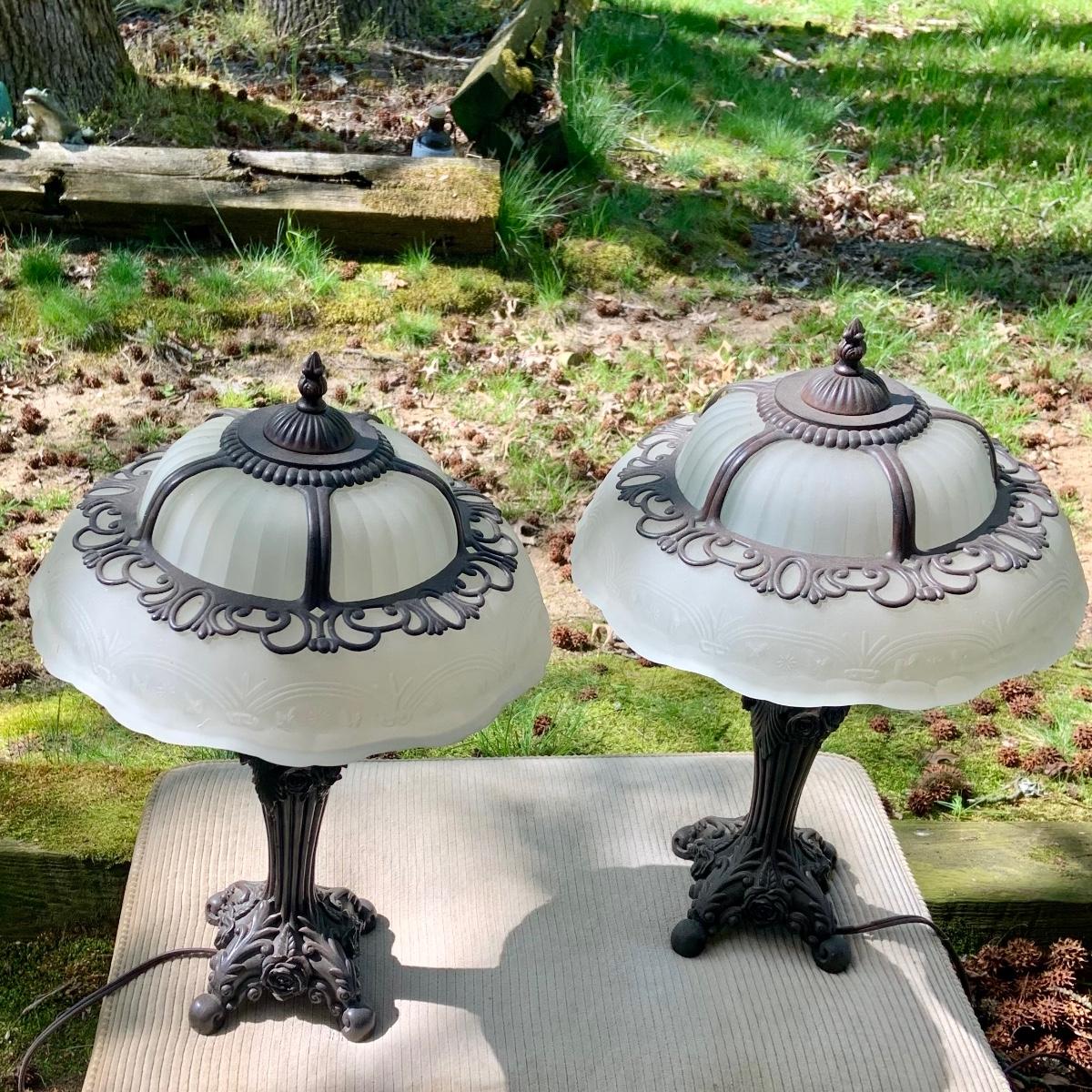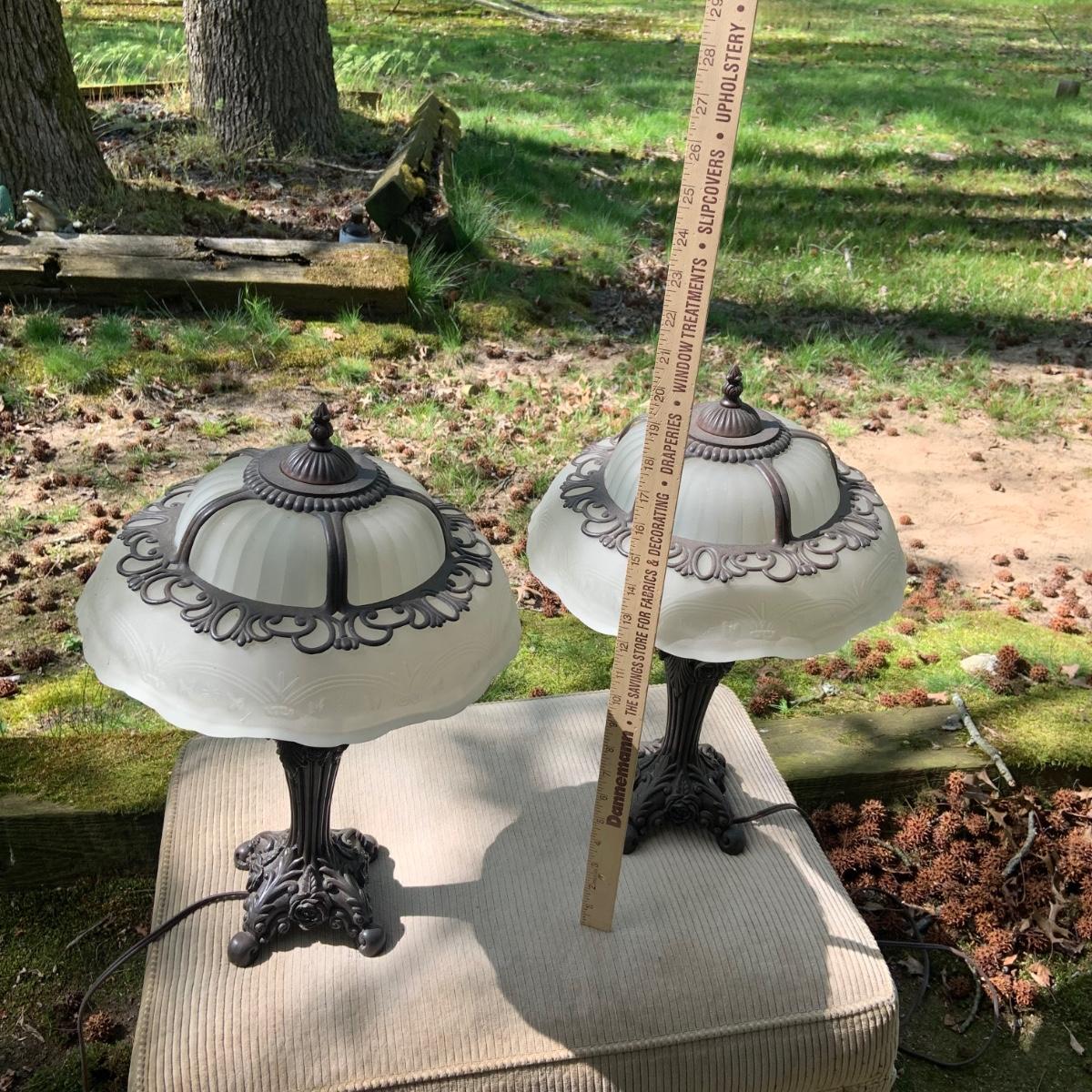 LOT 75: Set of 2 Art Nouveau Tiffany Style Reproduction Table Lamps with Frosted Glass Shades and Bronze Finish