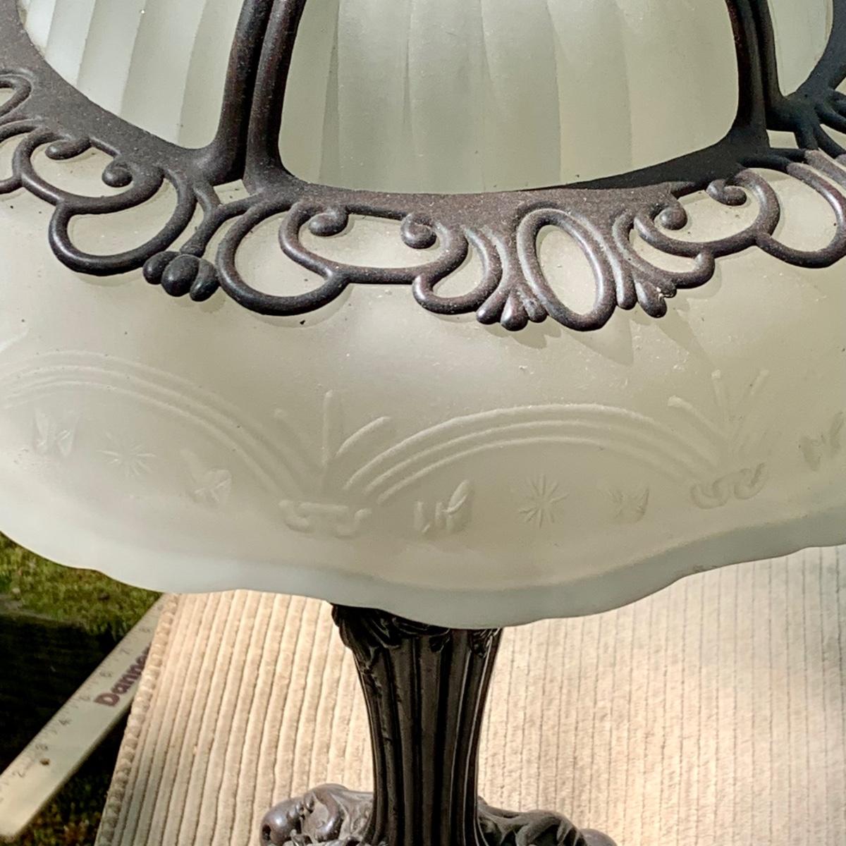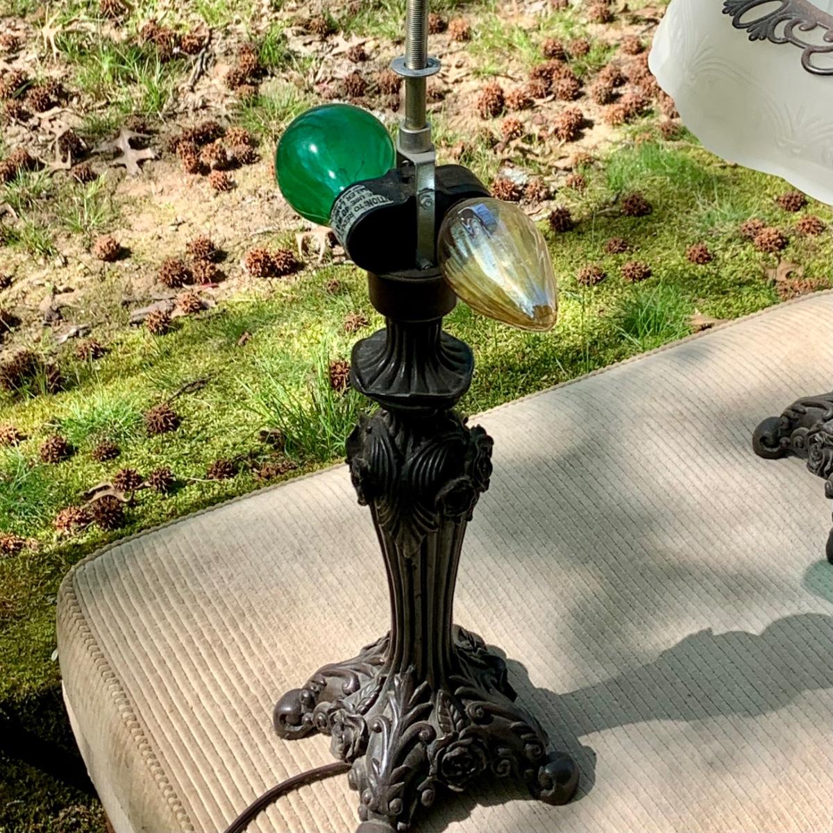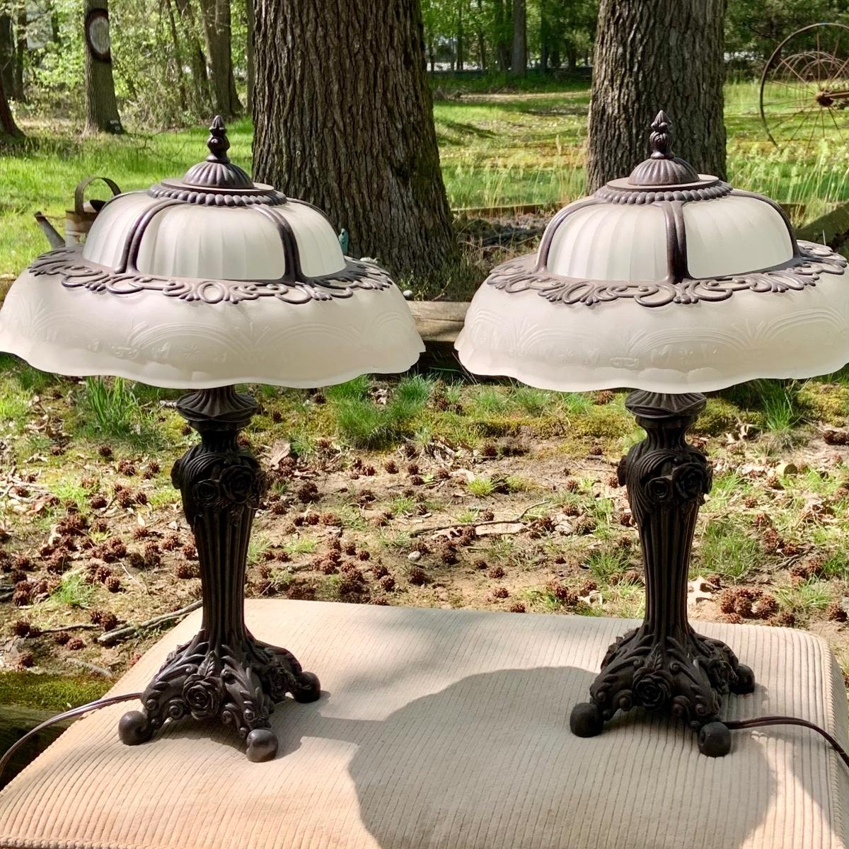 LOT 75: Set of 2 Art Nouveau Tiffany Style Reproduction Table Lamps with Frosted Glass Shades and Bronze Finish