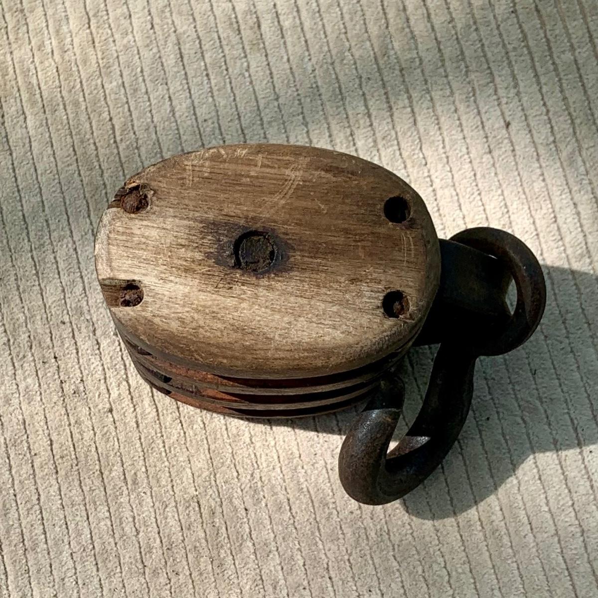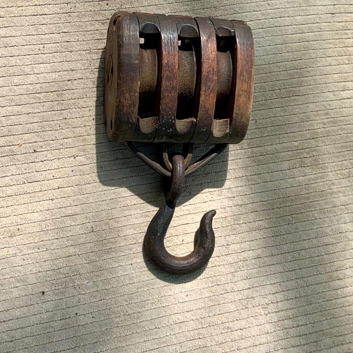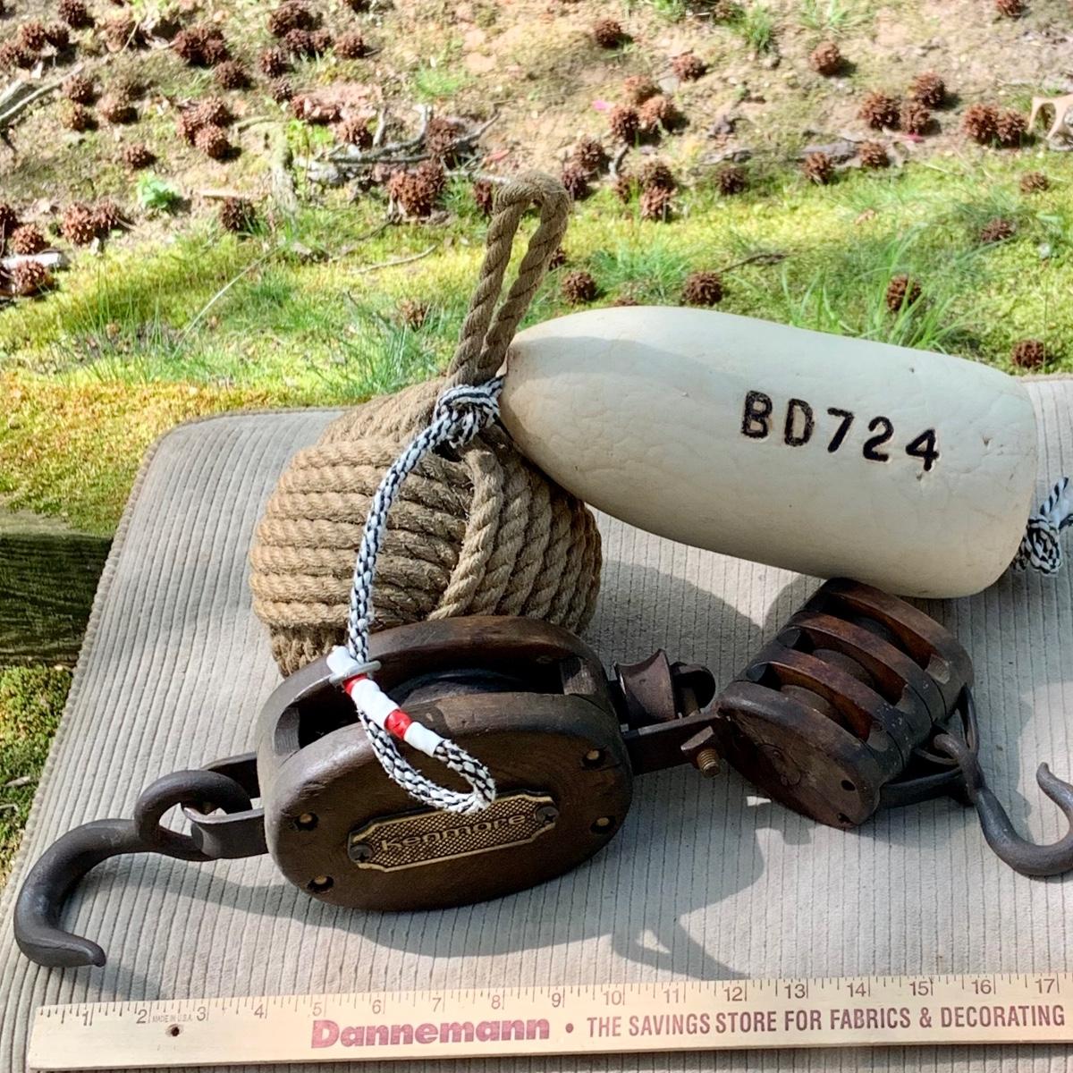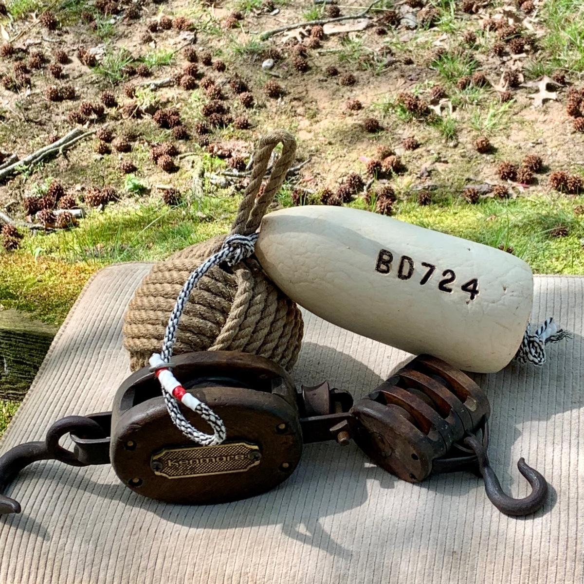 LOT 76: Nautical Collection Including Vintage/Antique Pulleys, a Buoy and Knotted Rope