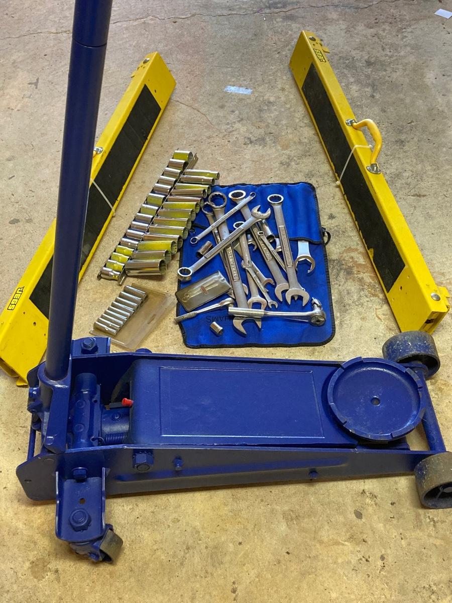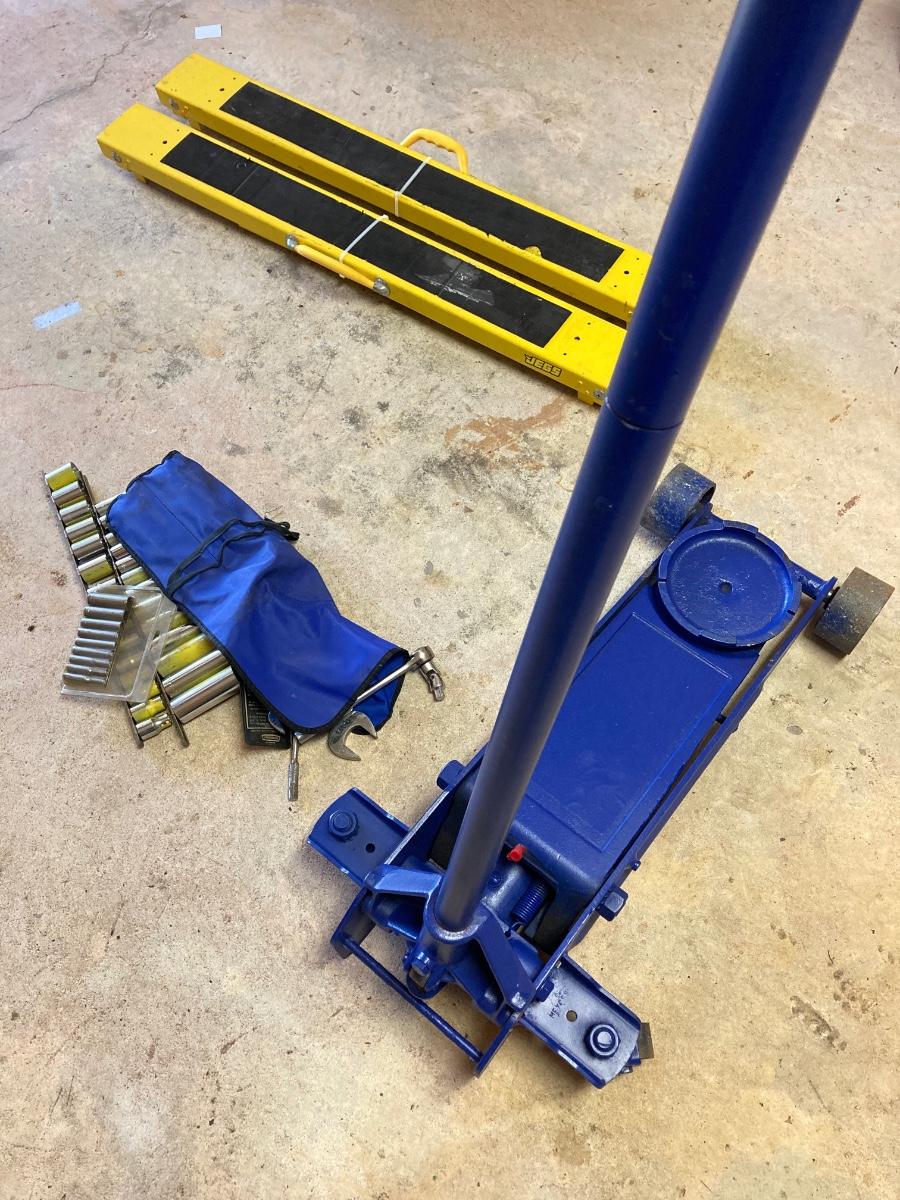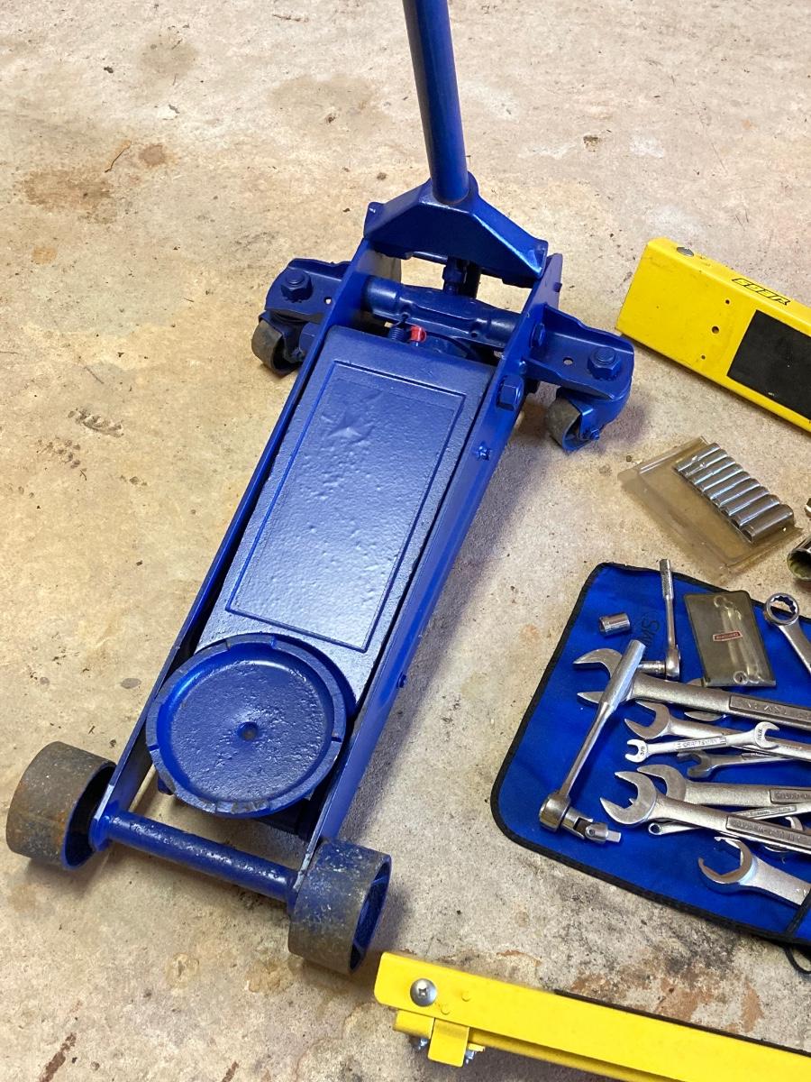 LOT 104: Hydraulic Jack, Jegs Folding Metal Work Stands and Tools