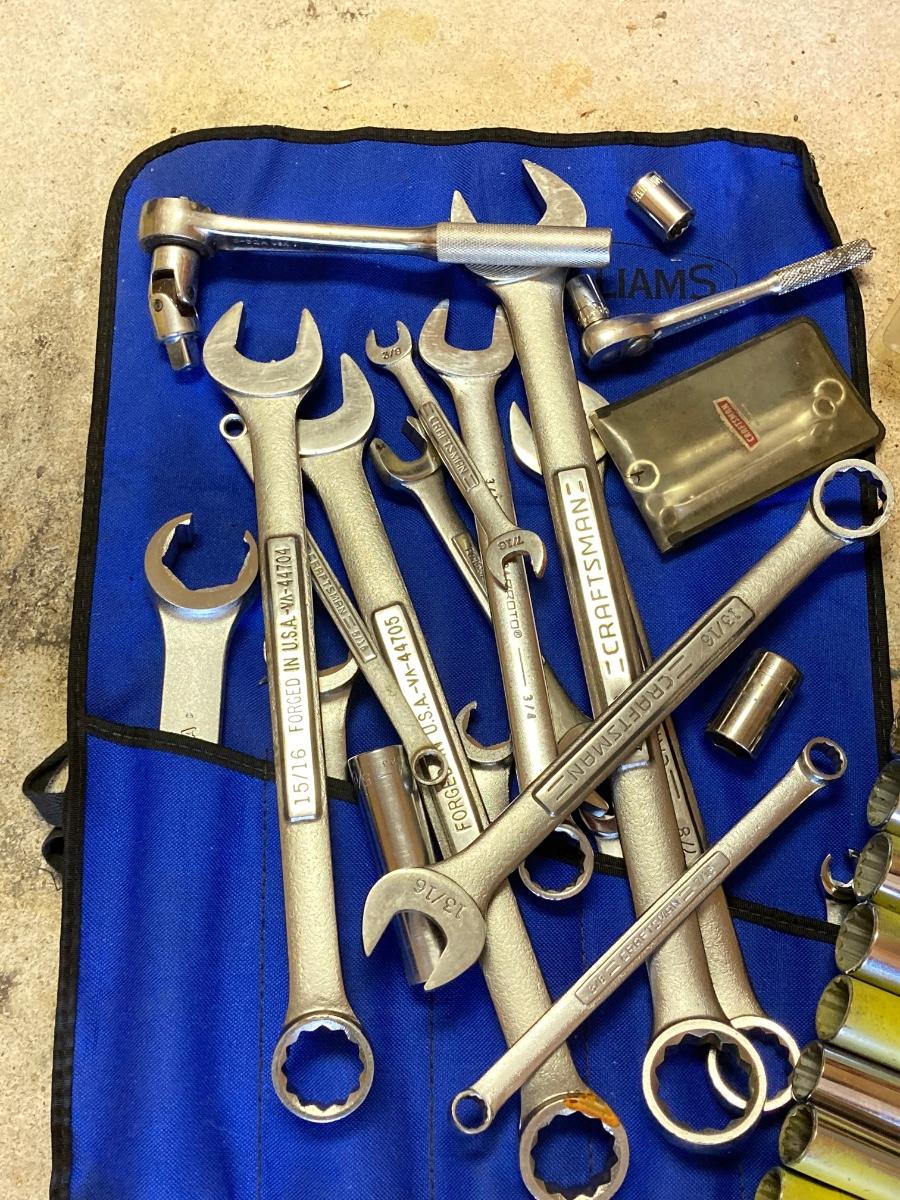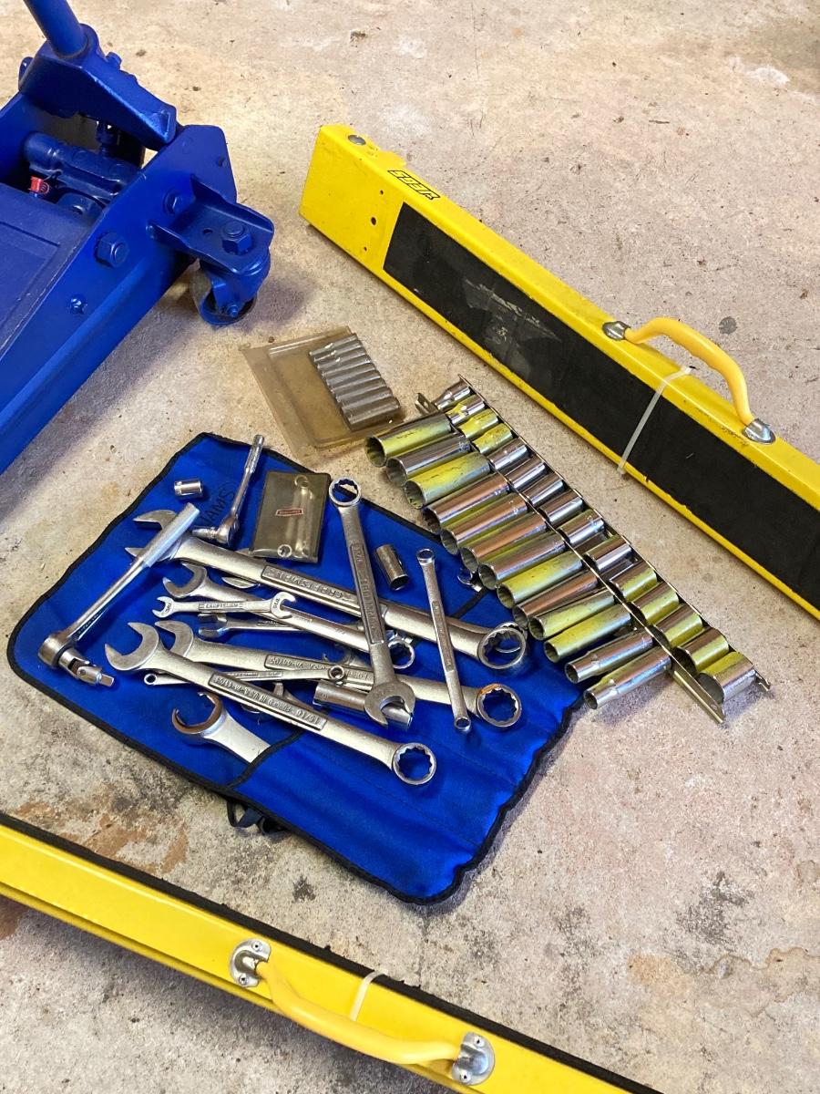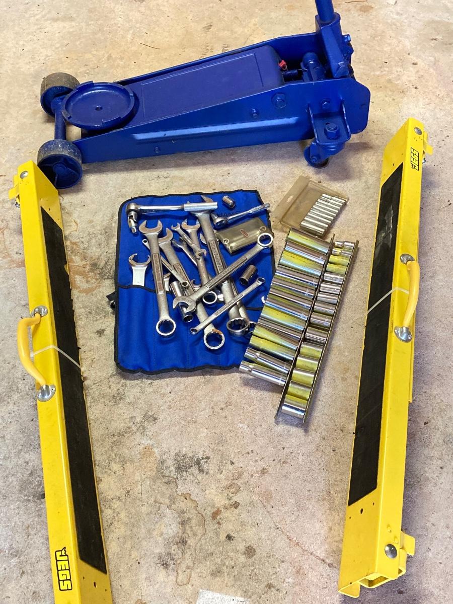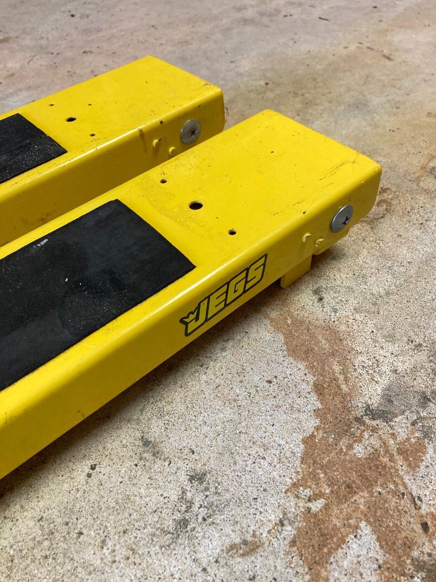LOT 104: Hydraulic Jack, Jegs Folding Metal Work Stands and Tools