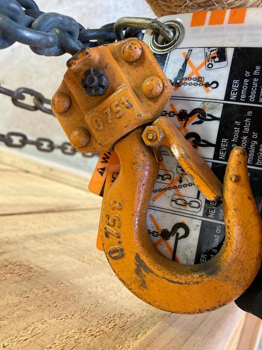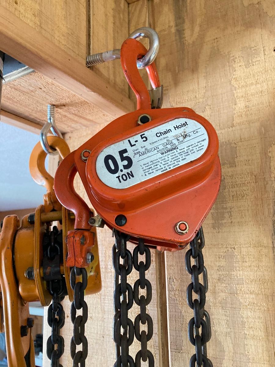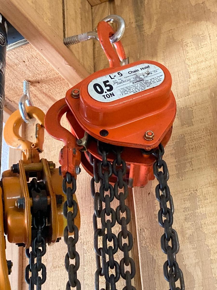 LOT 105: Chain Hoists - 0.5 Ton American Gage and Harrington 3/4 Ton with Chains