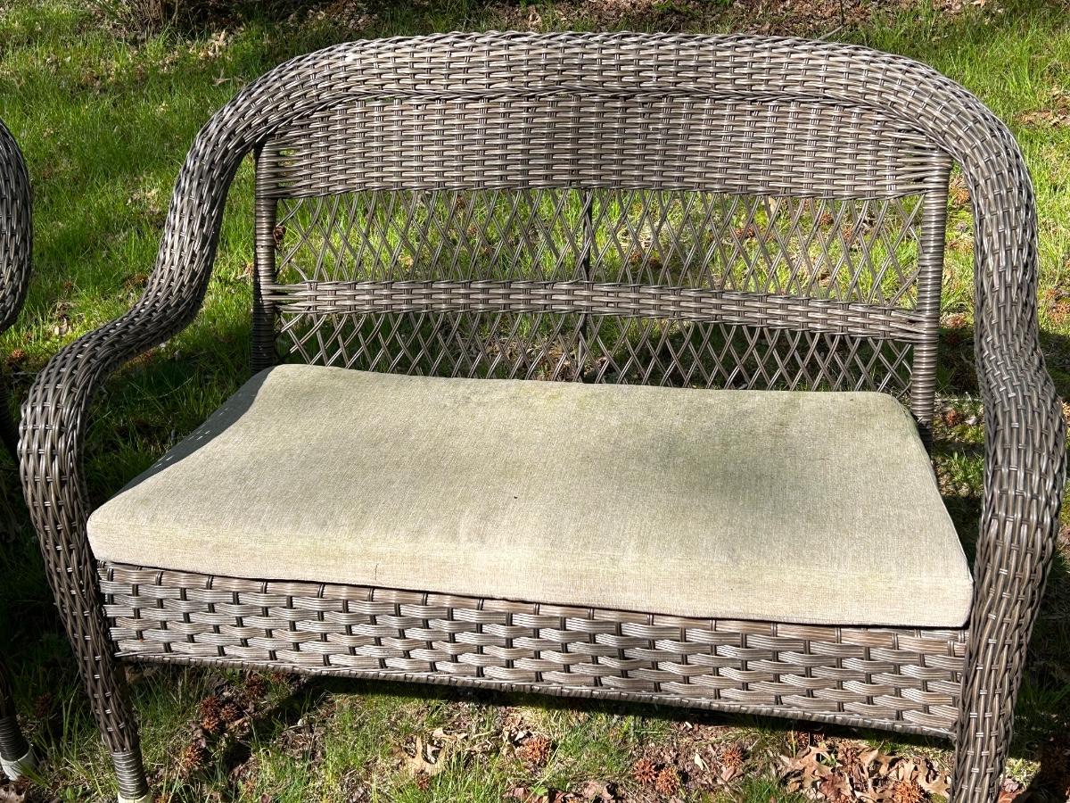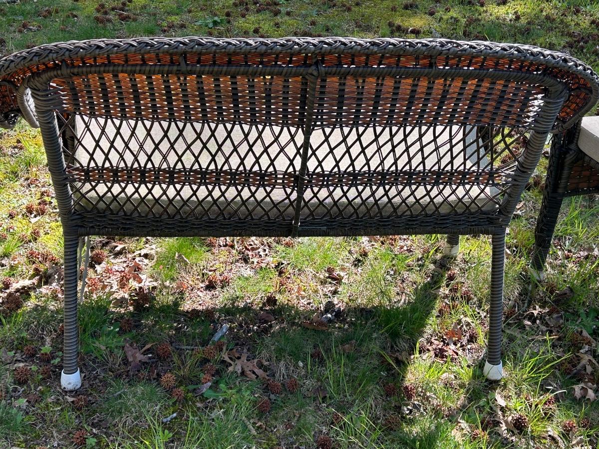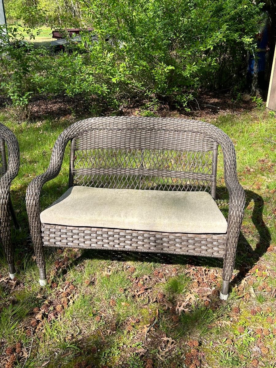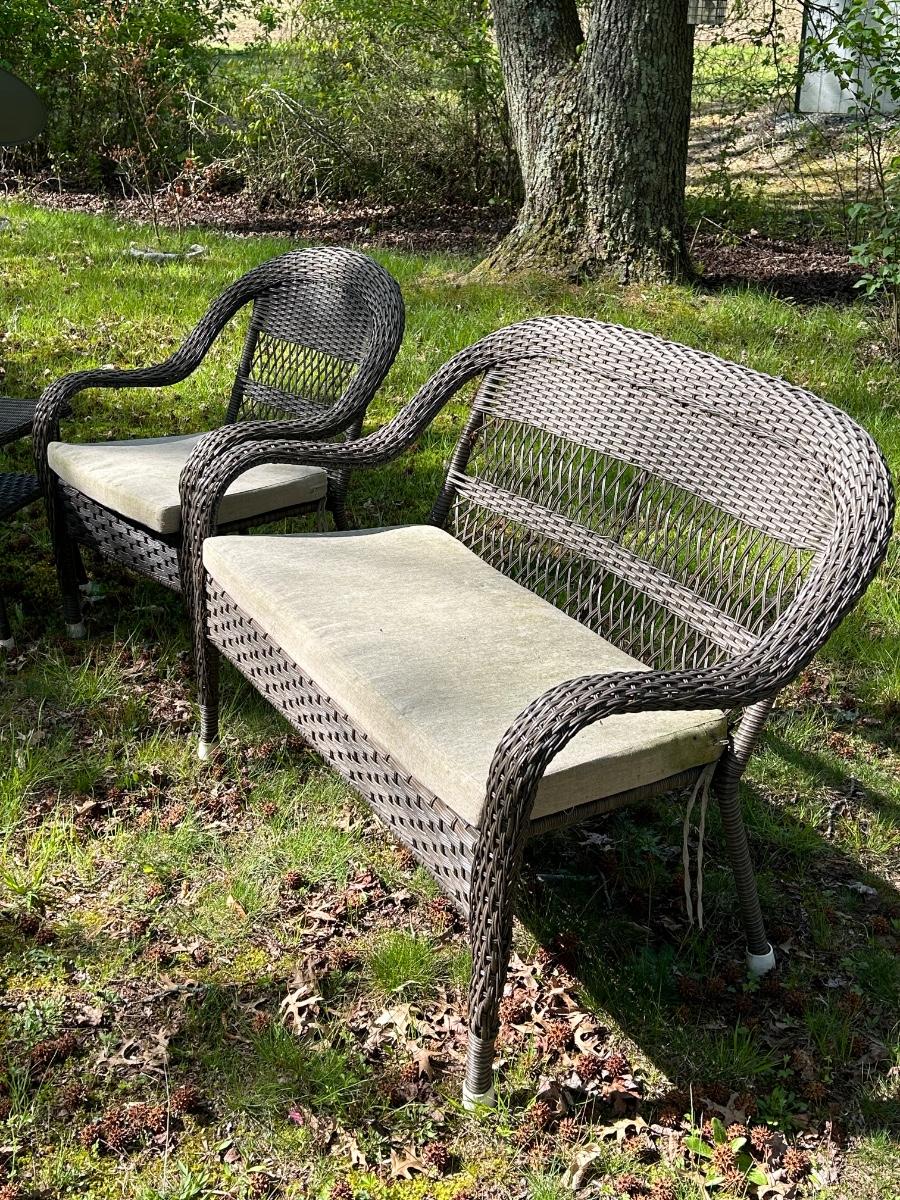 Brown plastic set with beige cushions. Set is in used but sturdy condition.