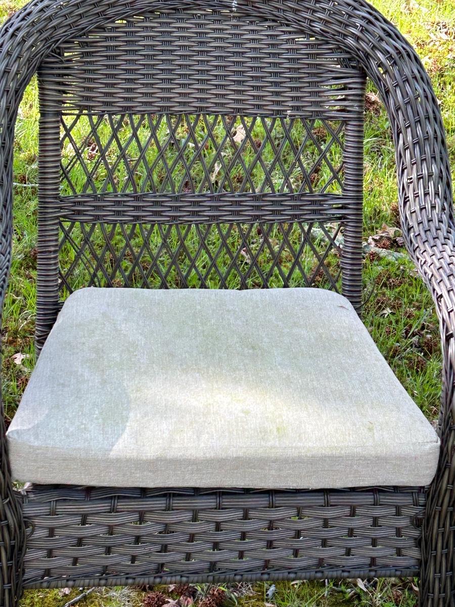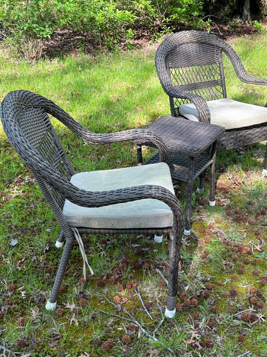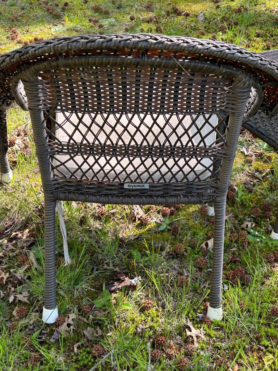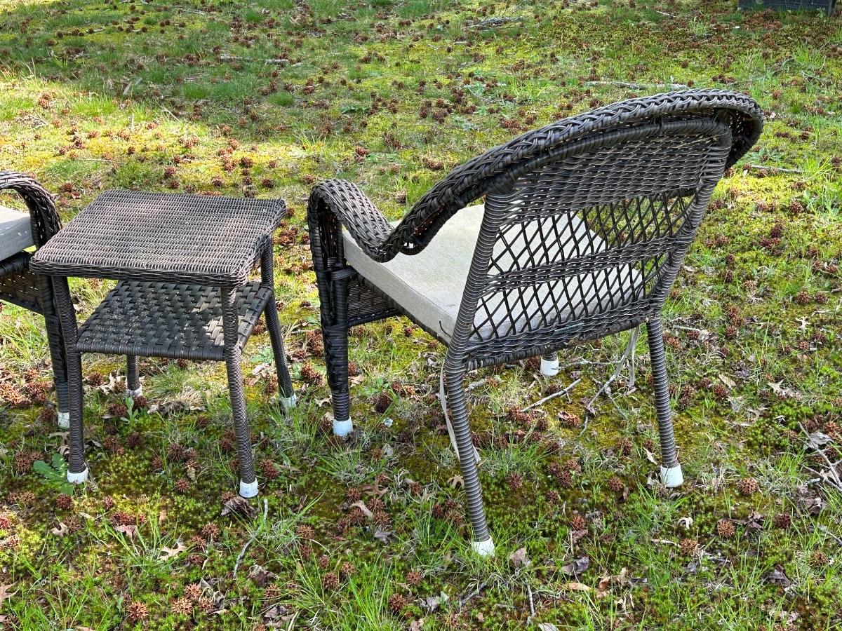 Brown plastic set with beige cushions. Set is in used but sturdy condition.