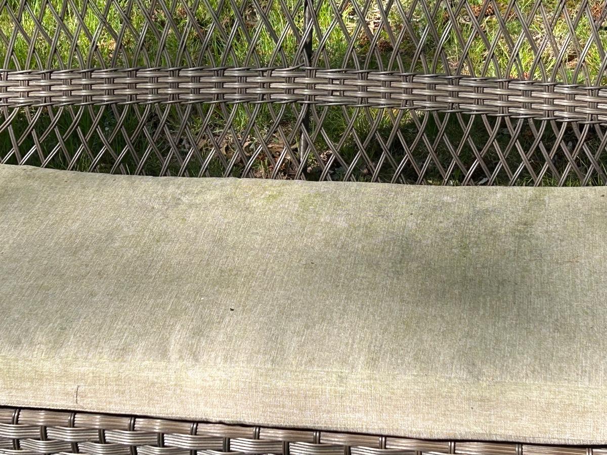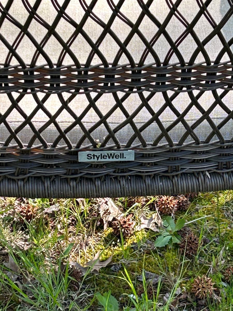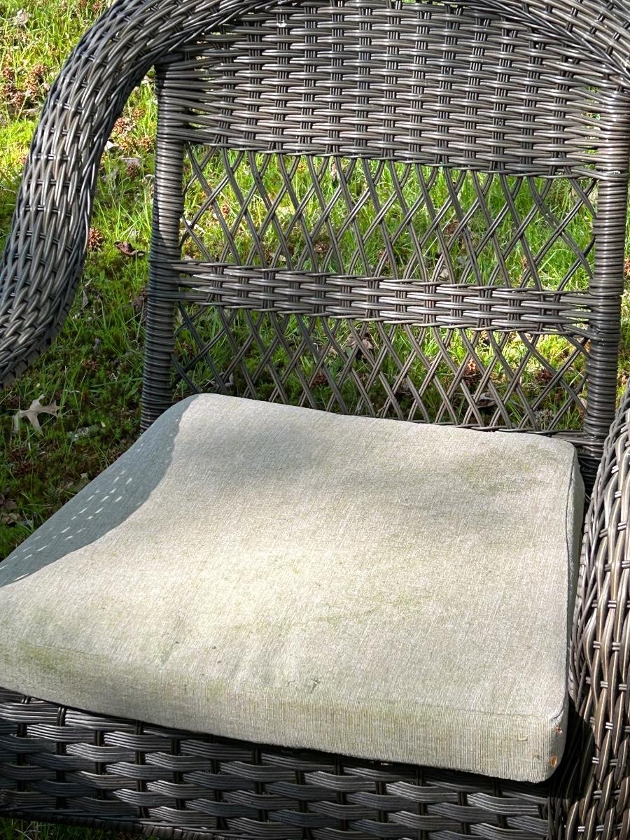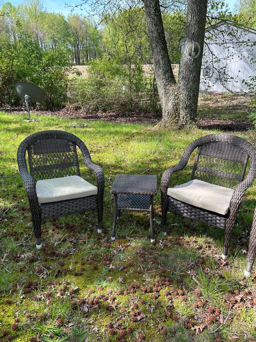 Brown plastic set with beige cushions. Set is in used but sturdy condition.