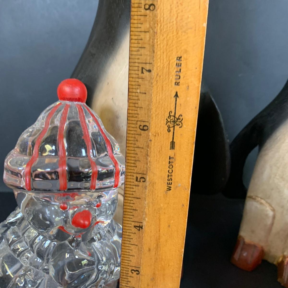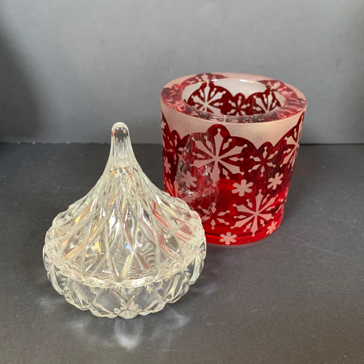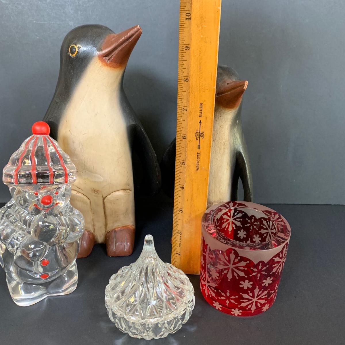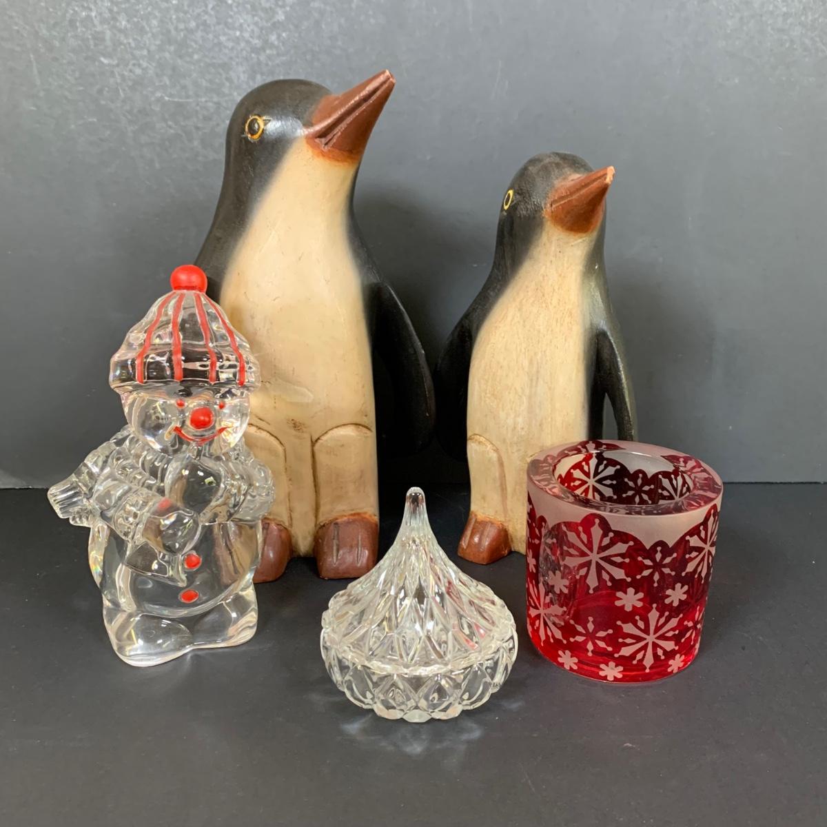 LOT 139: Carved Wooden Penguins, Party Lite Votive Candle Holder, Crystal Hershey Kiss & Glass Snowman