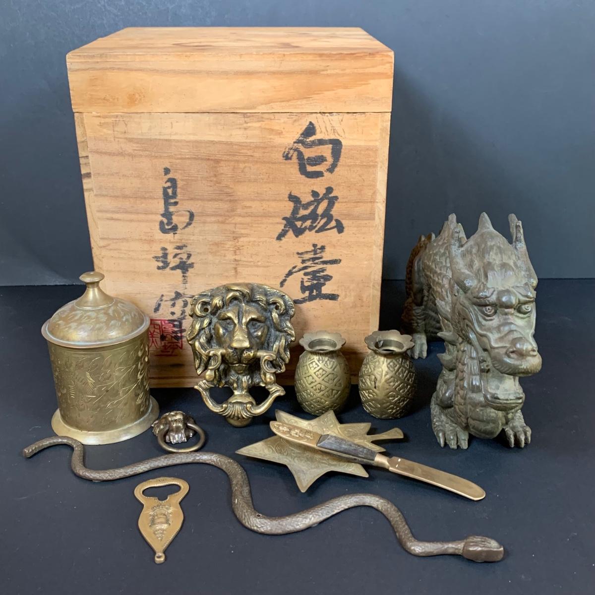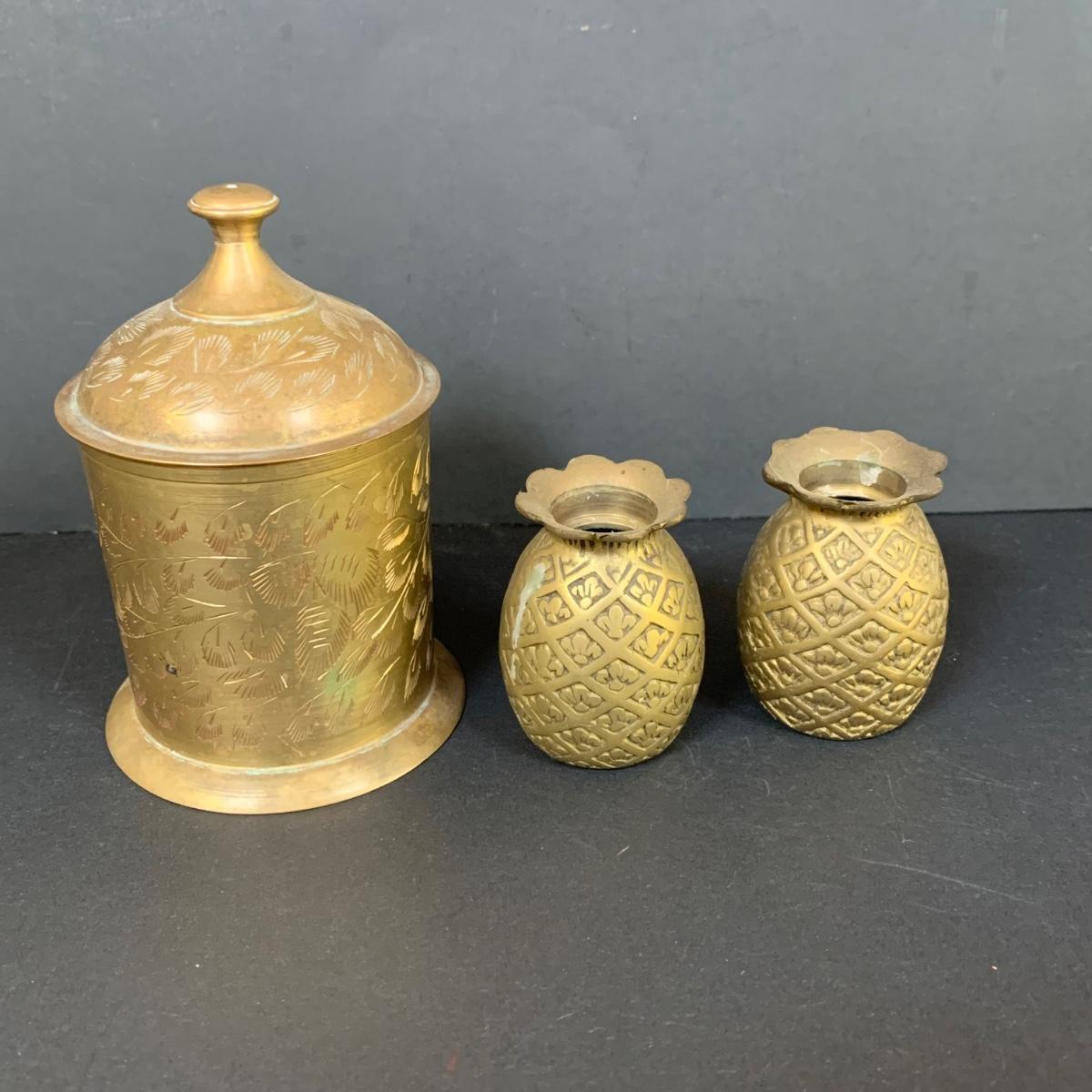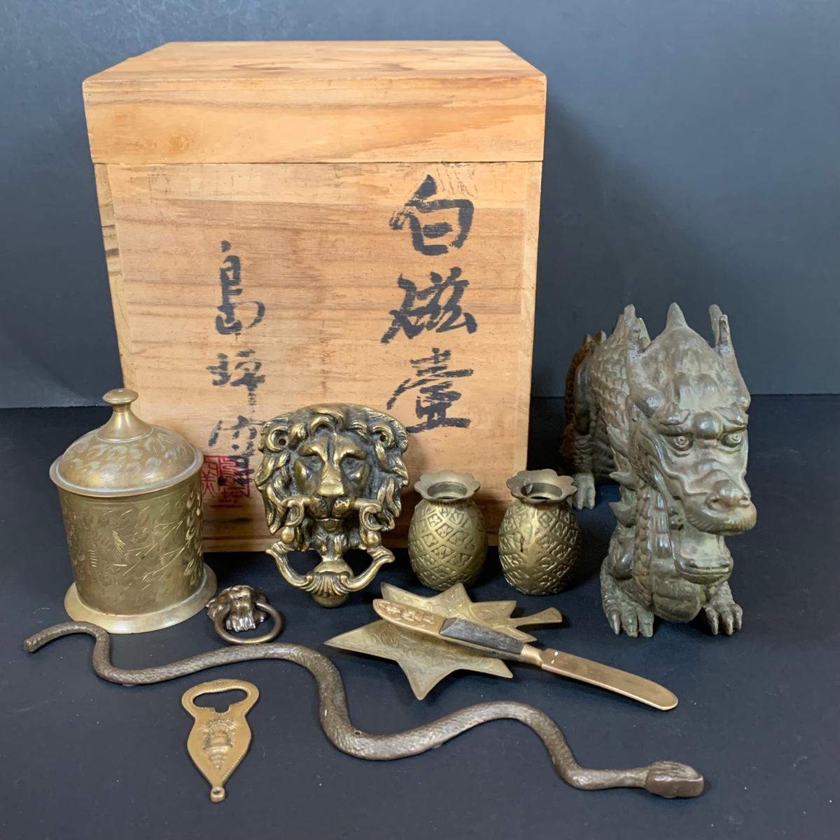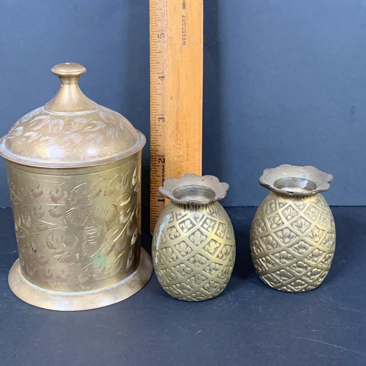 LOT 143: Etched Brass Container Jar w/Lid, Brass Pineapple Candle Holders, Resin Dragon, Lion Hardware & More