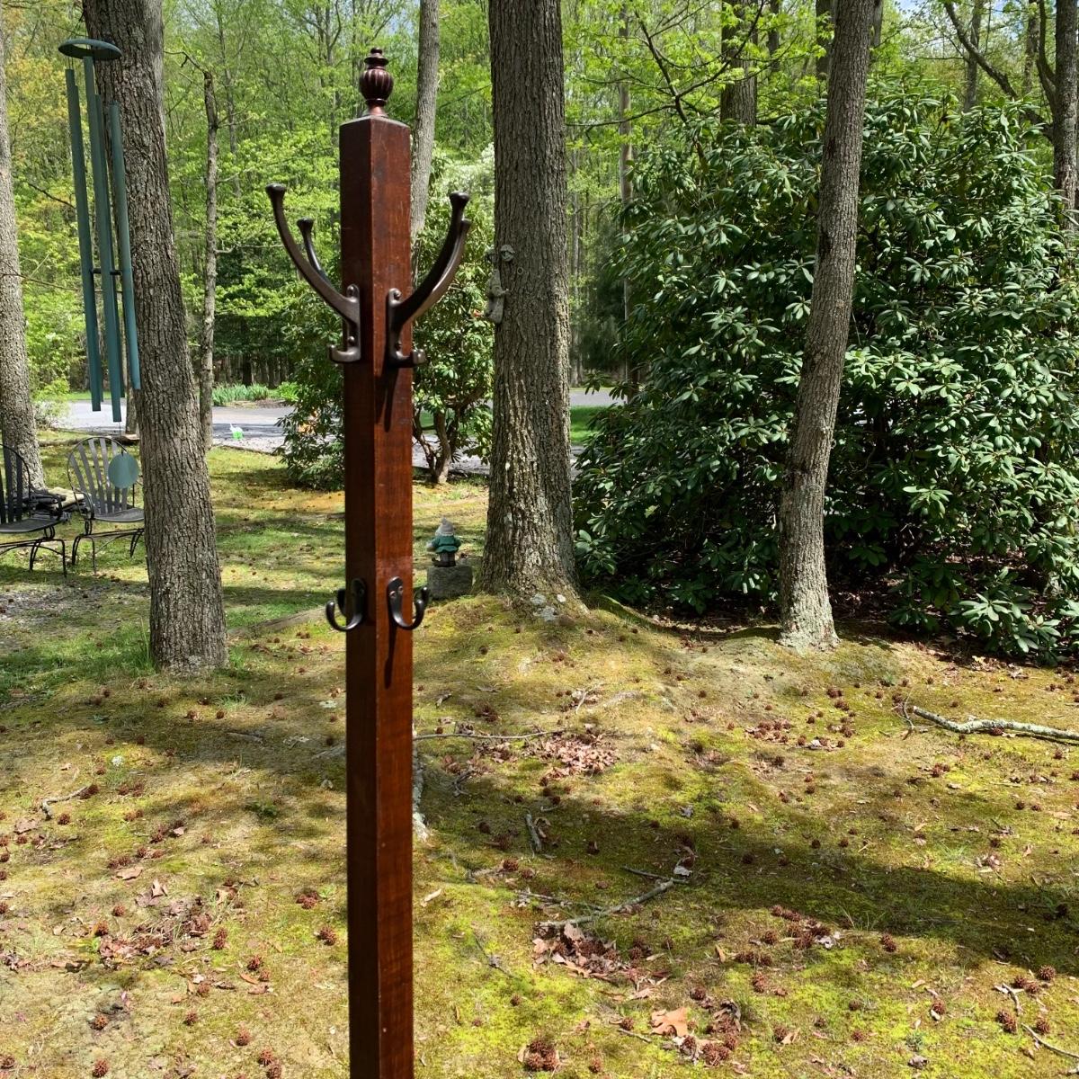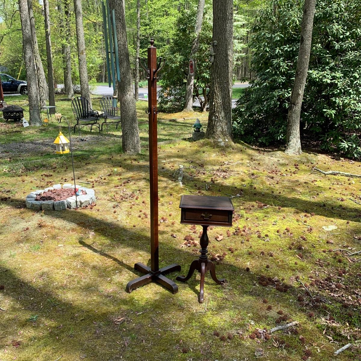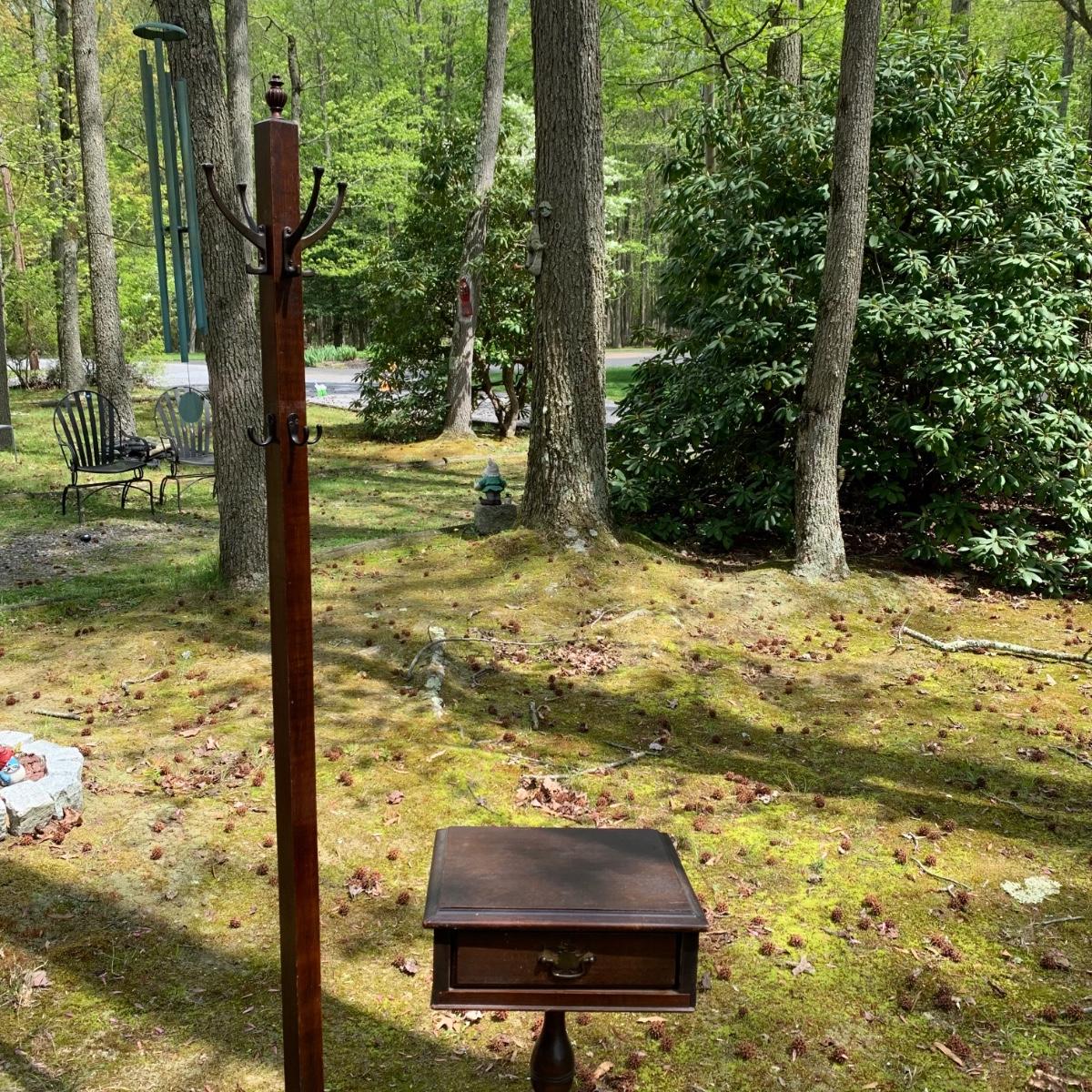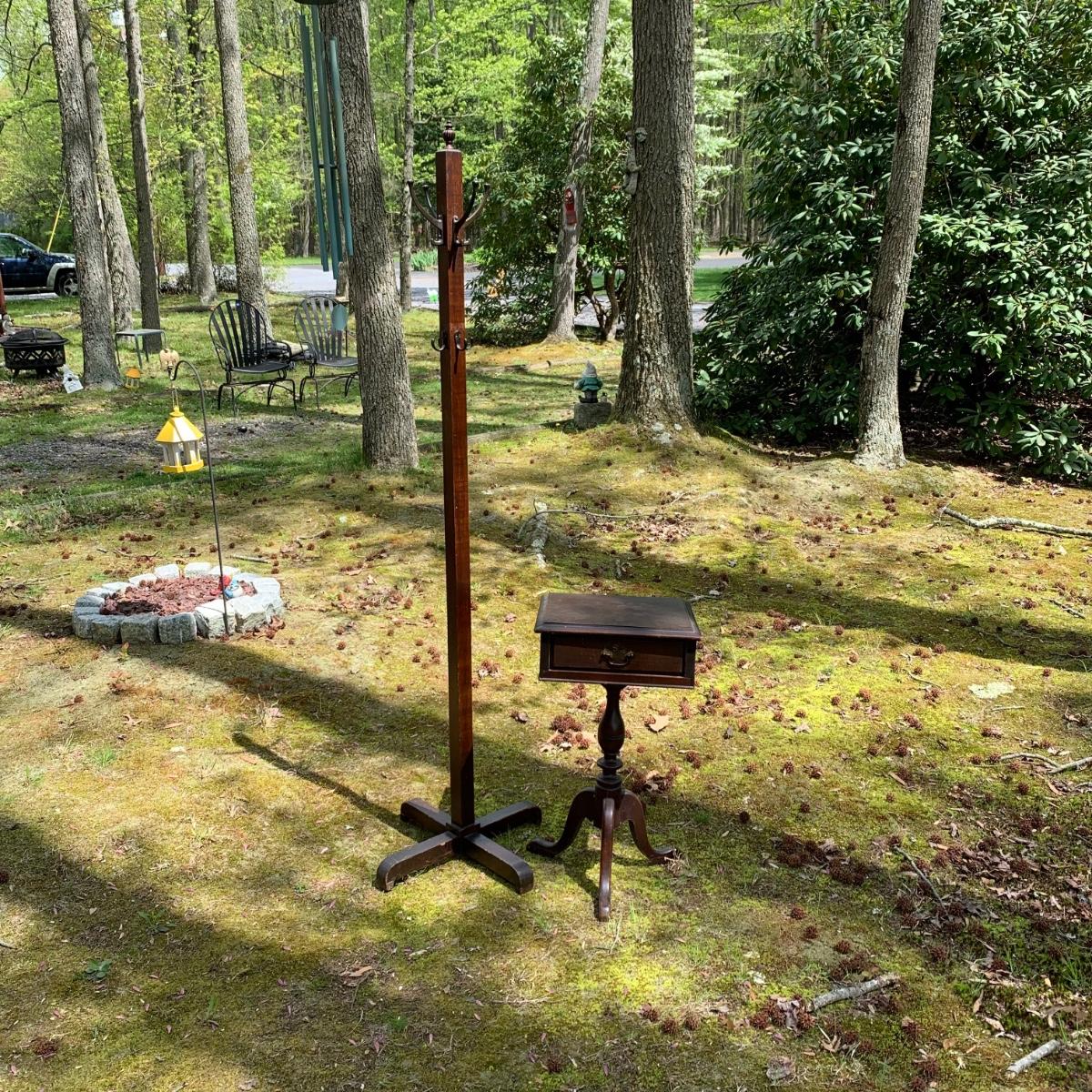 LOT 155: Vintage Wooden Standing Coatrack & Antique John Wanamaker Side Table