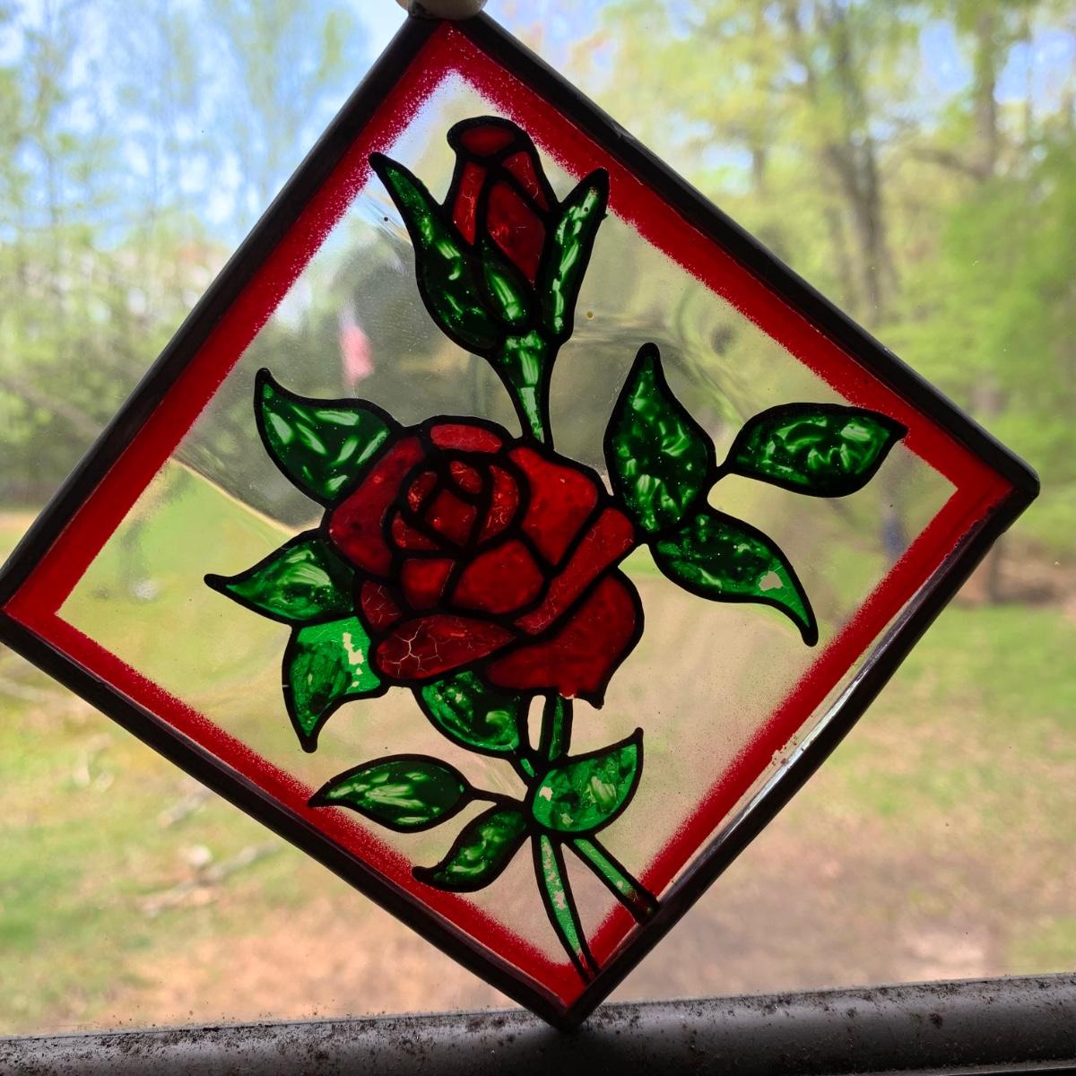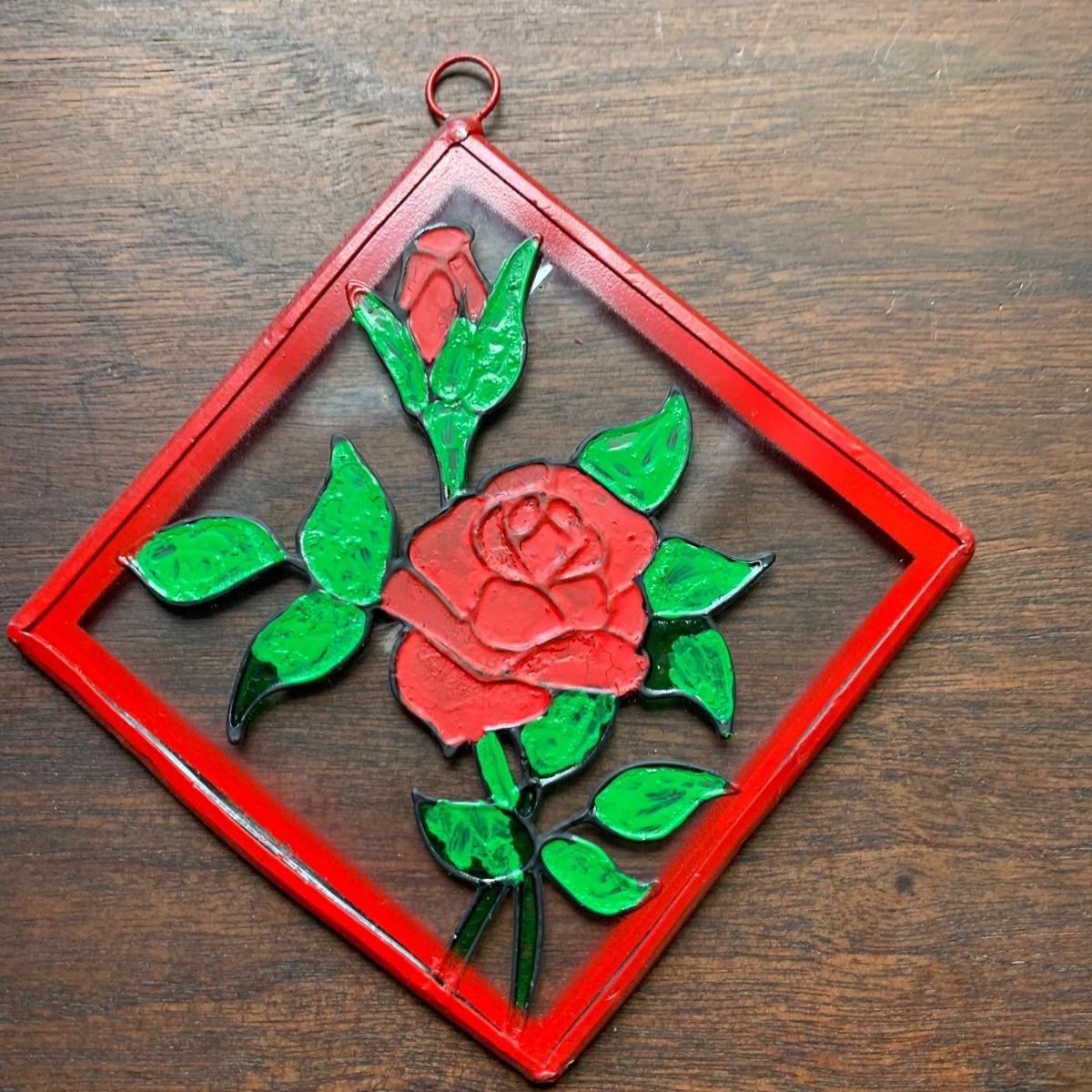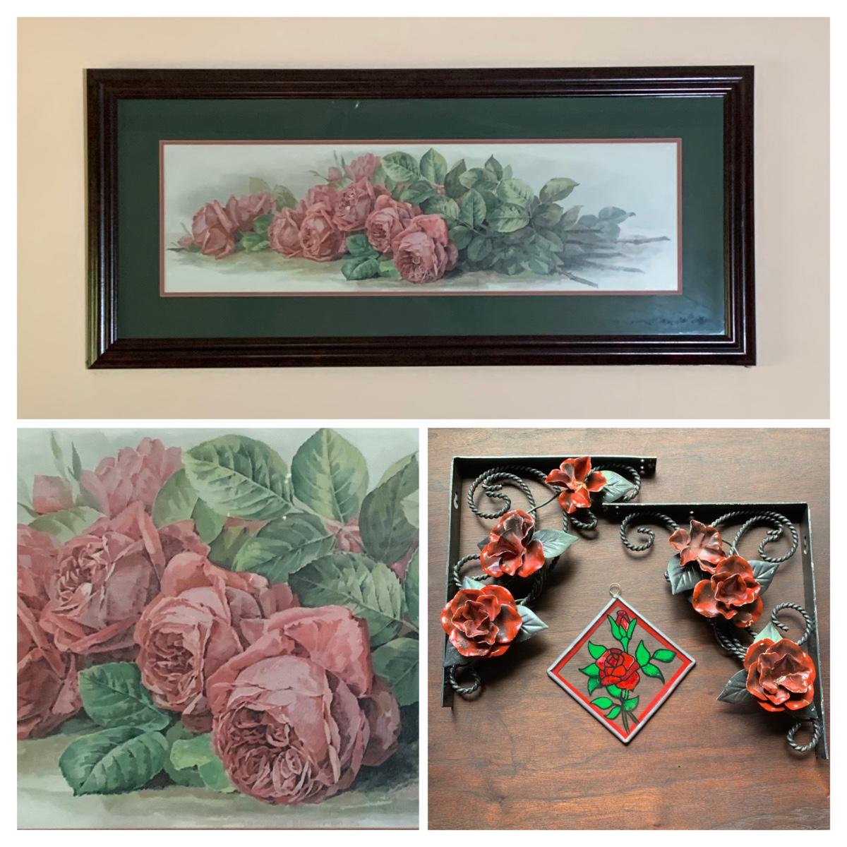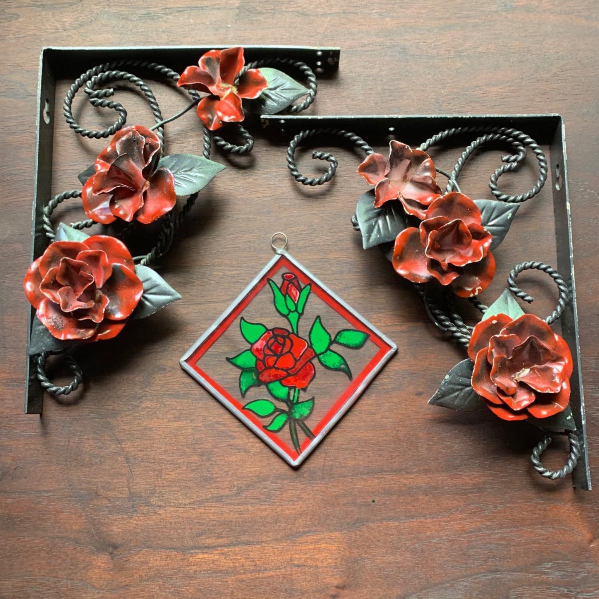 LOT 157: Signed Home Decor Print: Roses & Floral Painted Shelf Brackets & Painted Stained Glass Rose