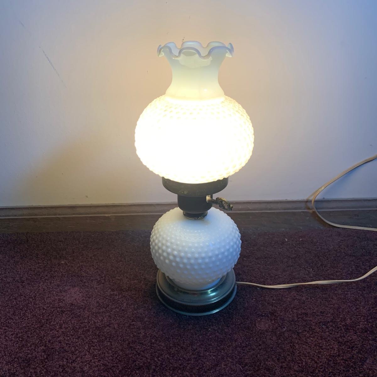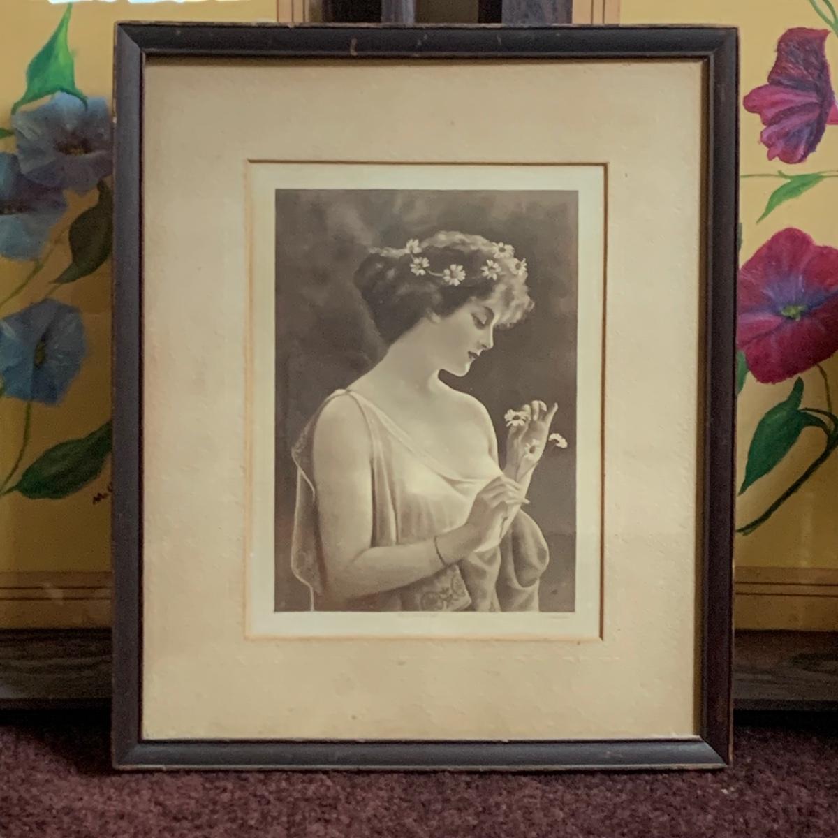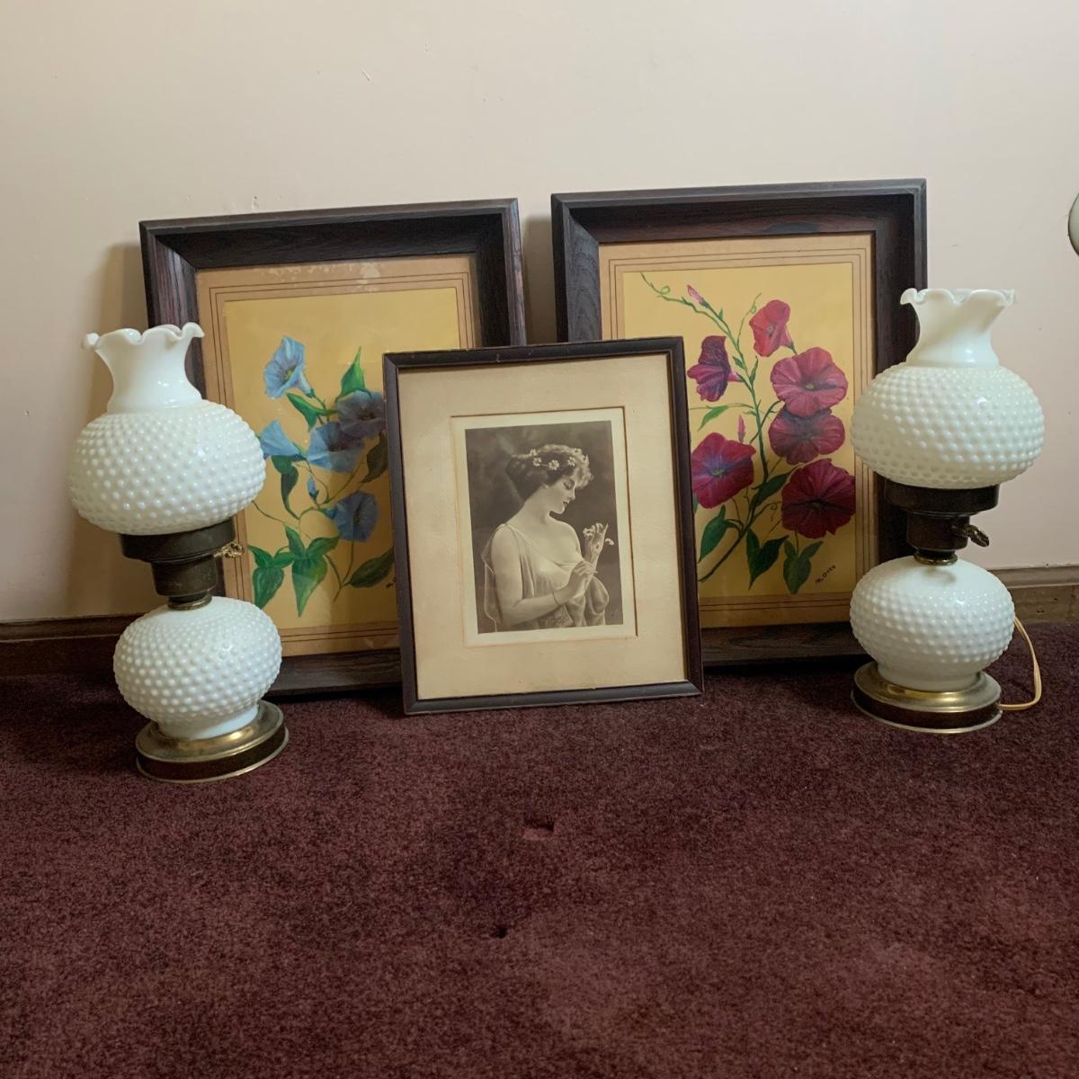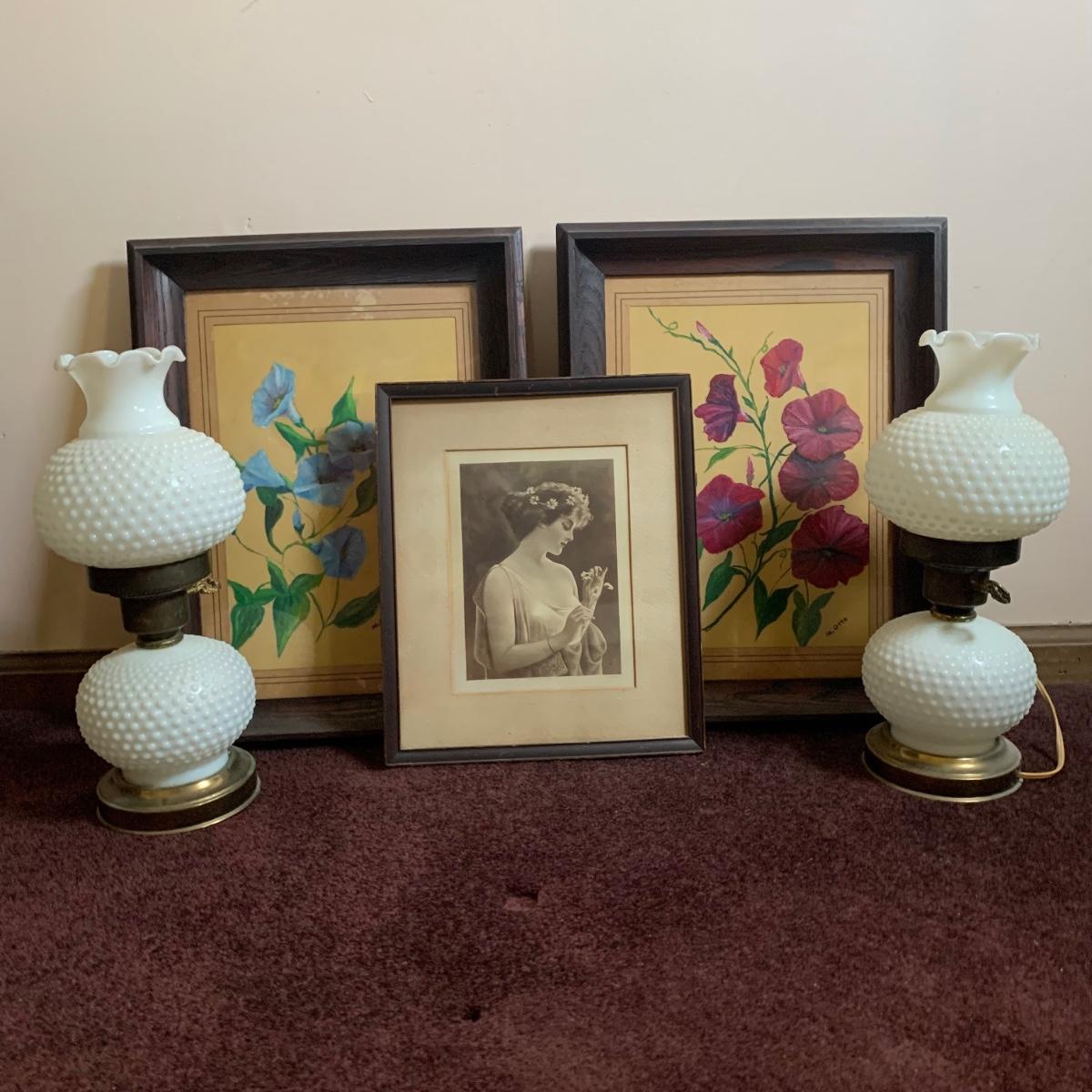 LOT 159: Hobnail Milk Glass Lamps, Portrait of Women Historical Art Print & Signed "Morning Glory" Painting, M. Otto