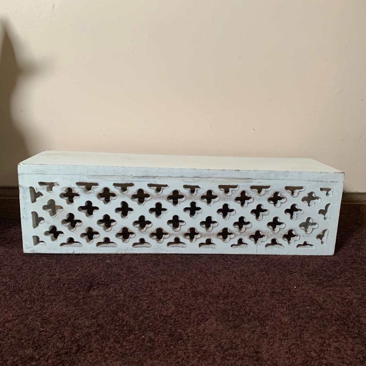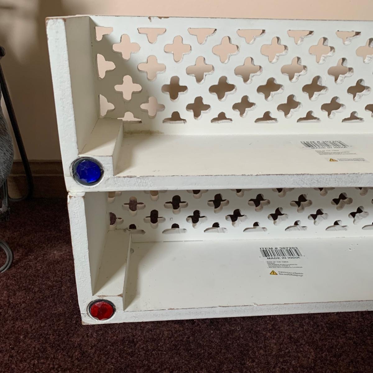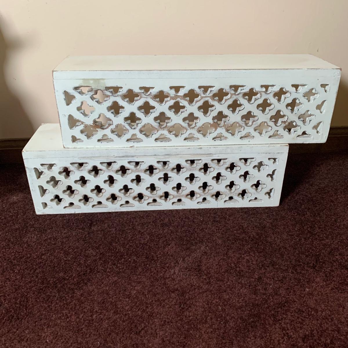 LOT 162: Home Decor: Resin Jackalope, Farmhouse Corbels, White Farmhouse Shelves, Metal Book Stand