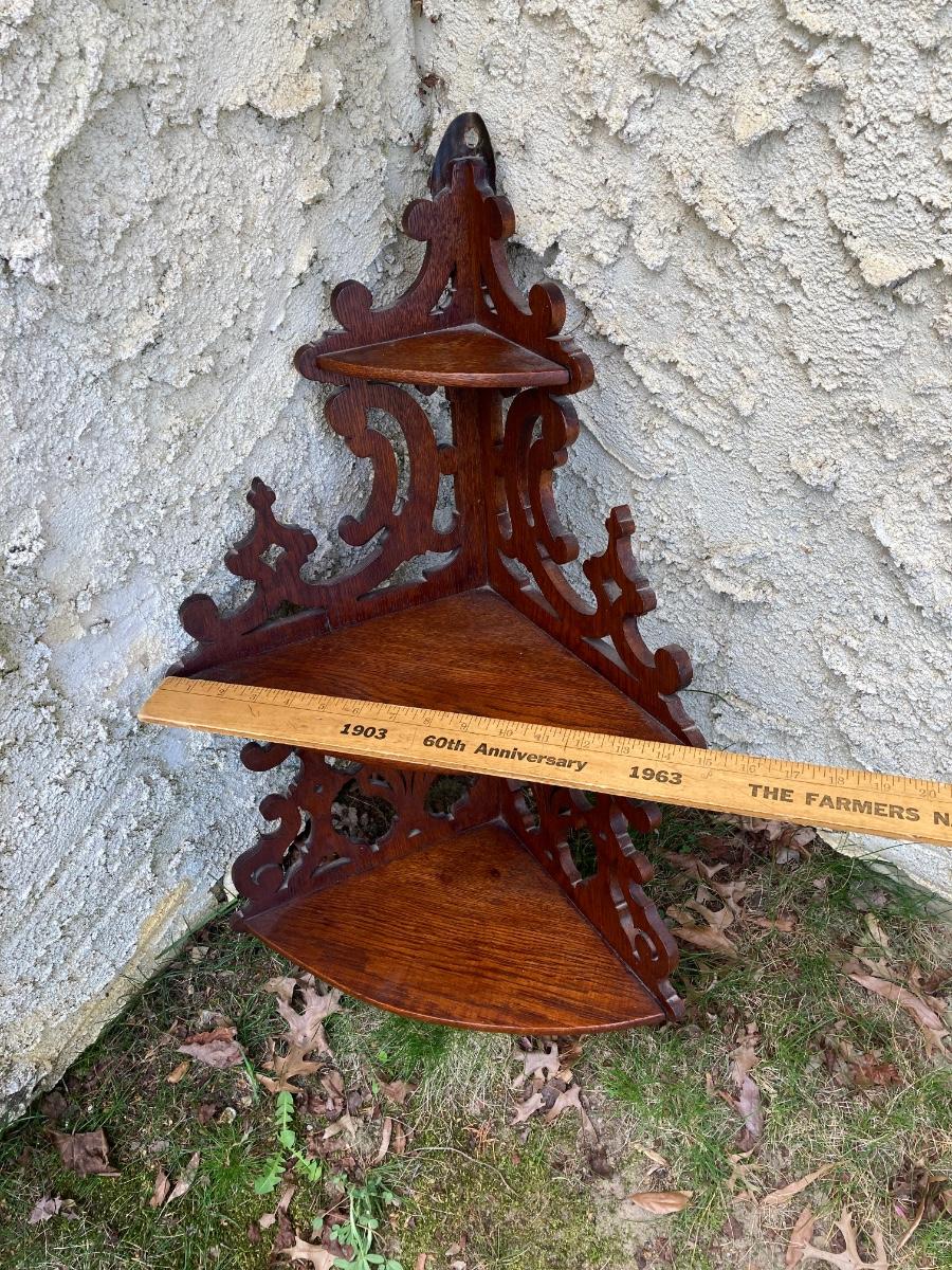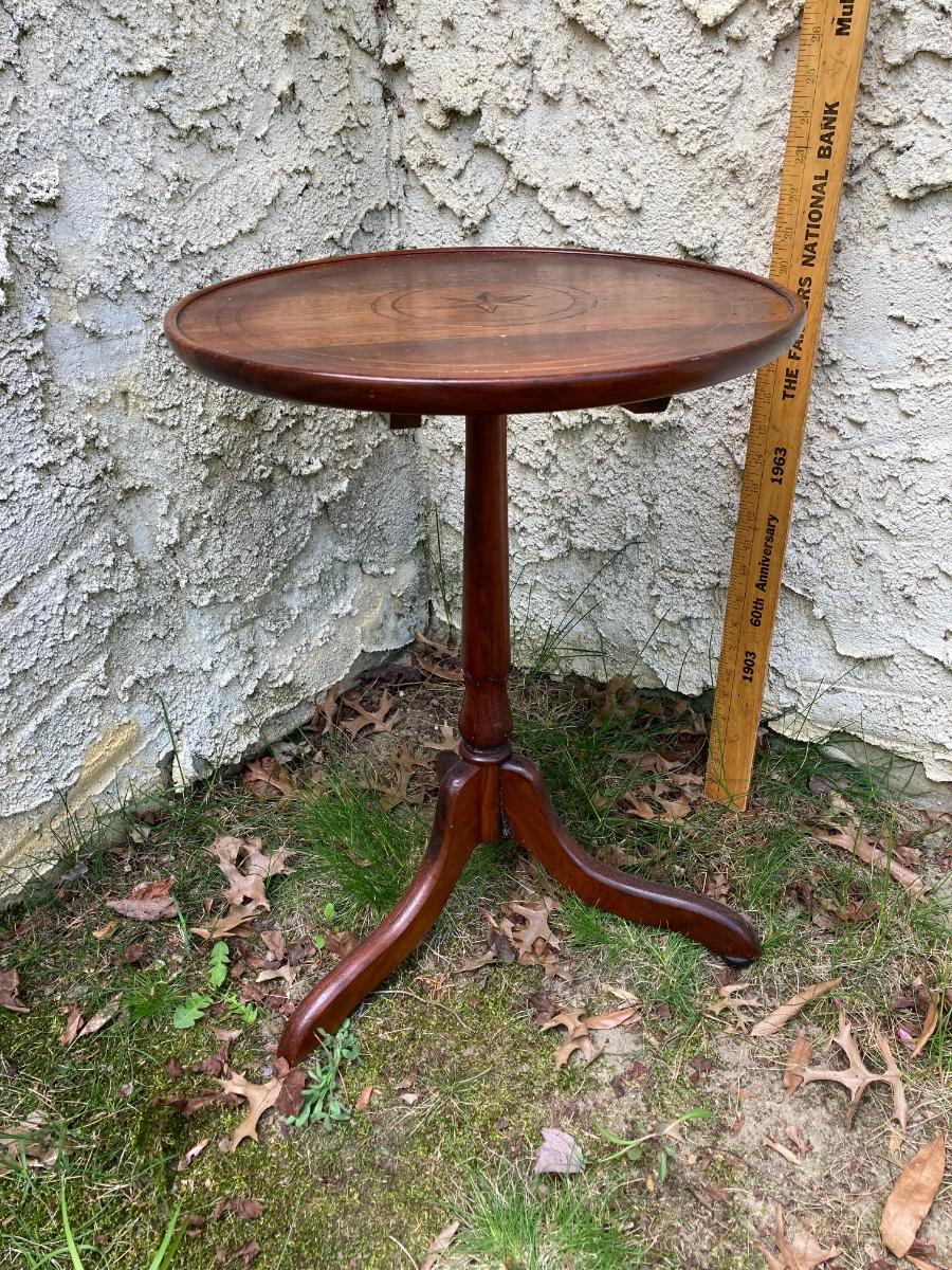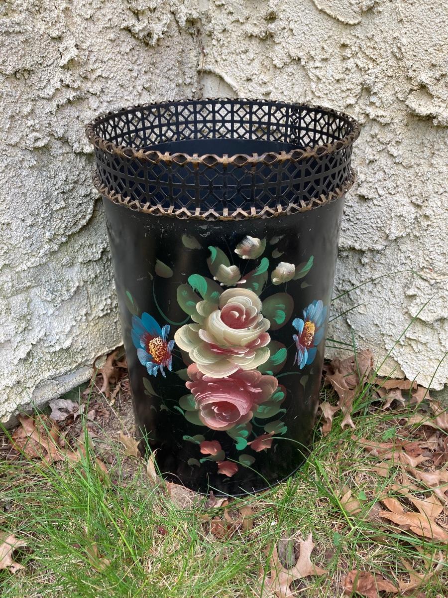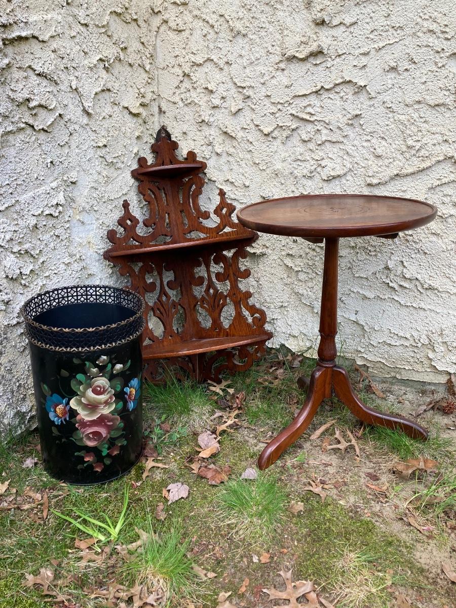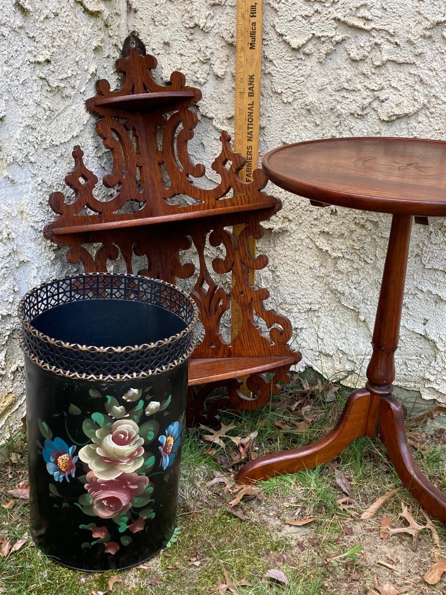 LOT 177: Vintage Floral Hand Painted Wastebasket, Wood Round Table and Wood Corner Shelf
