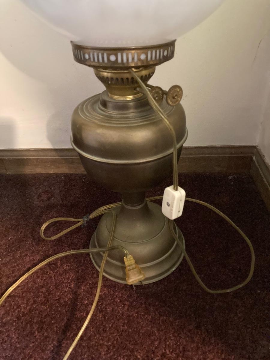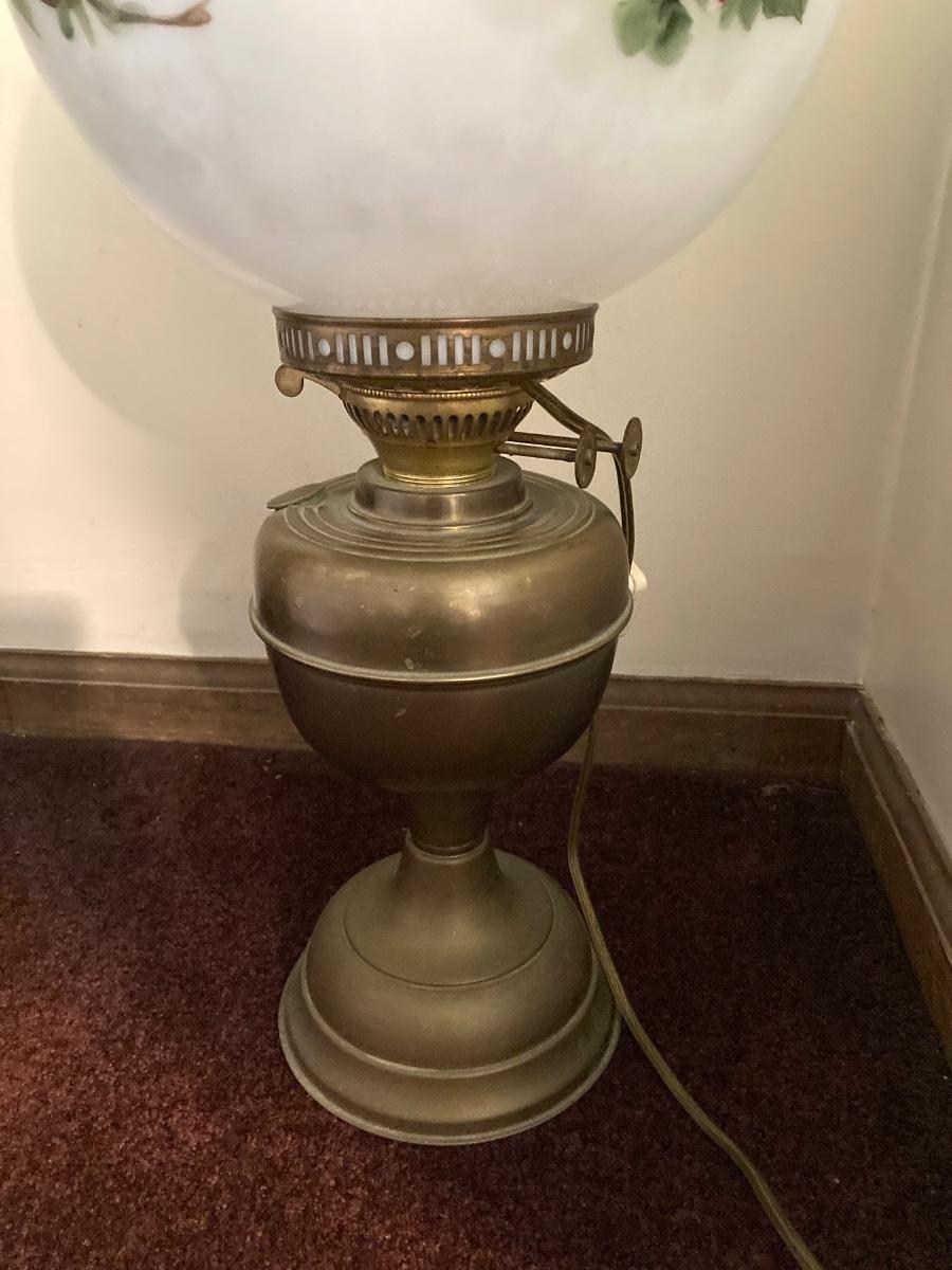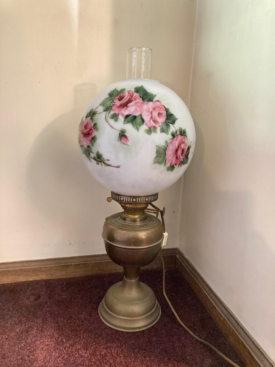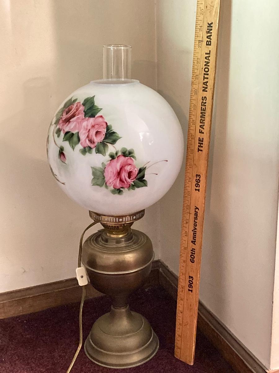 LOT 179: Vintage Floral Globe Shade Electrified Brass Oil Lamp