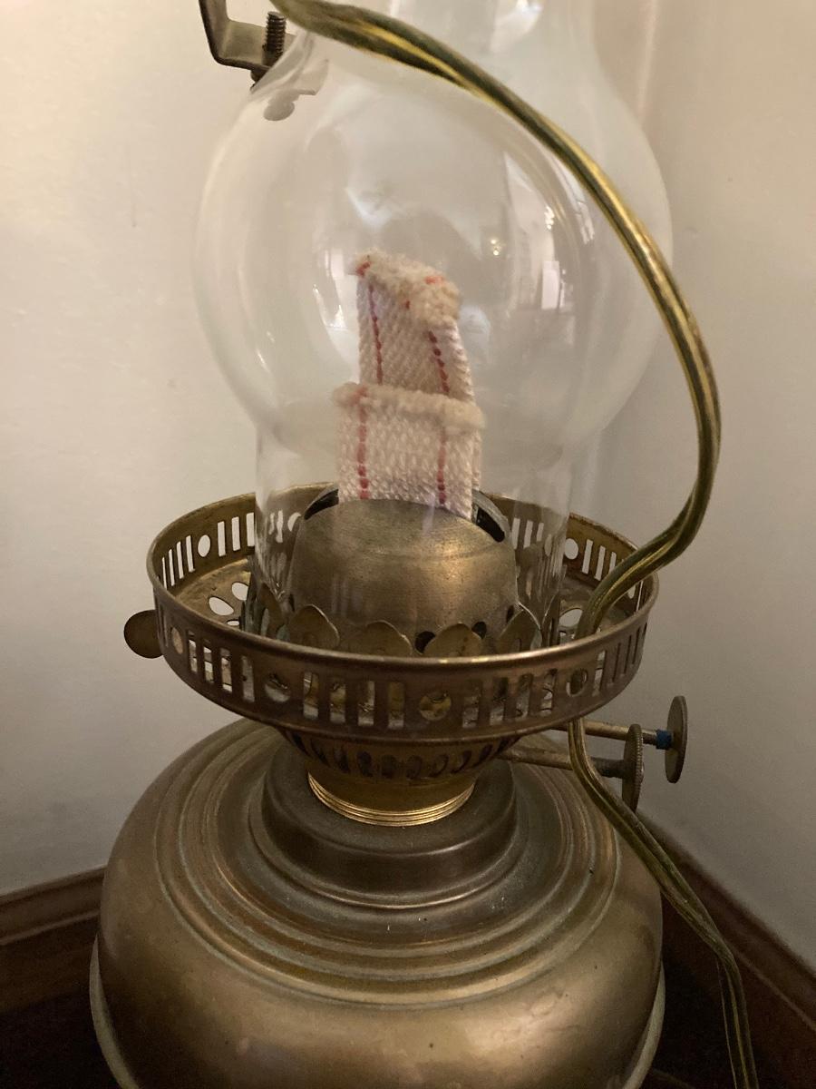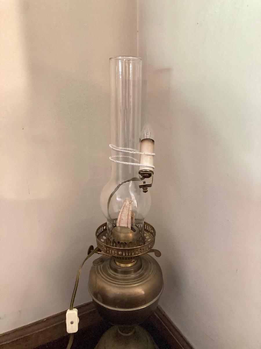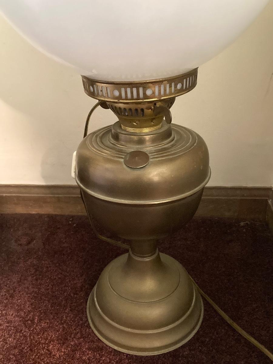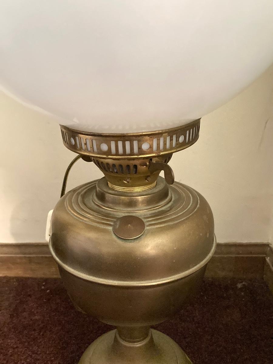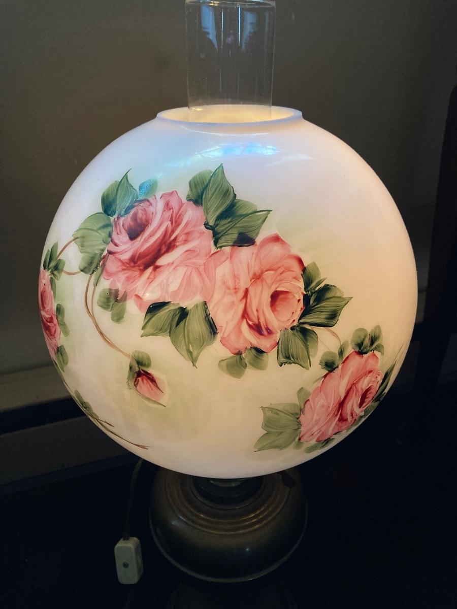 LOT 179: Vintage Floral Globe Shade Electrified Brass Oil Lamp