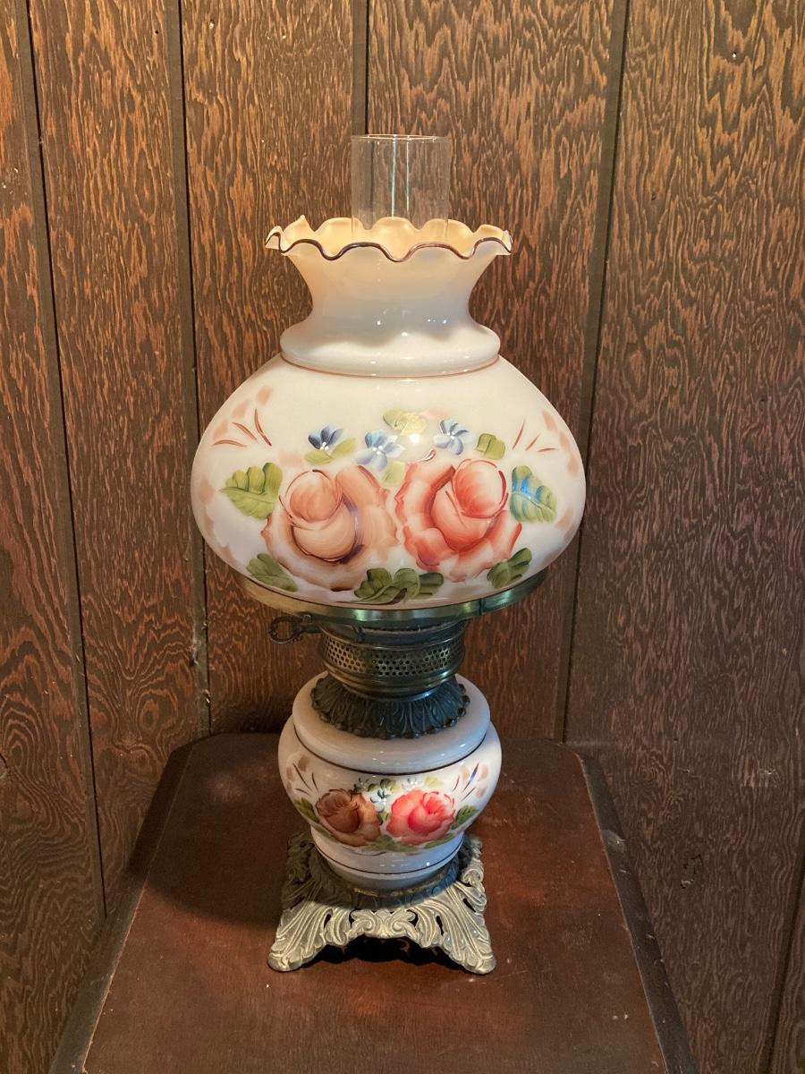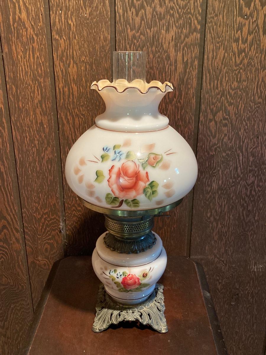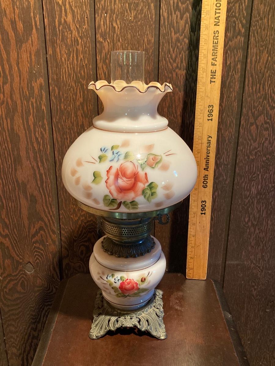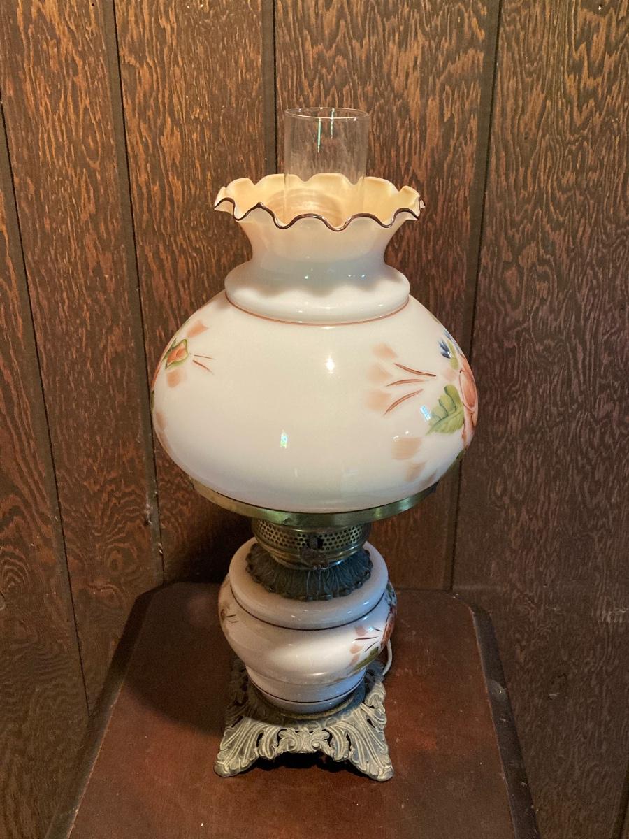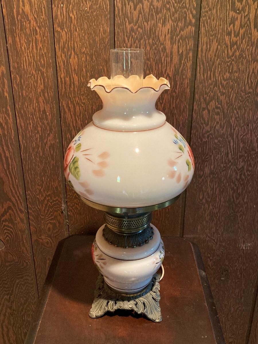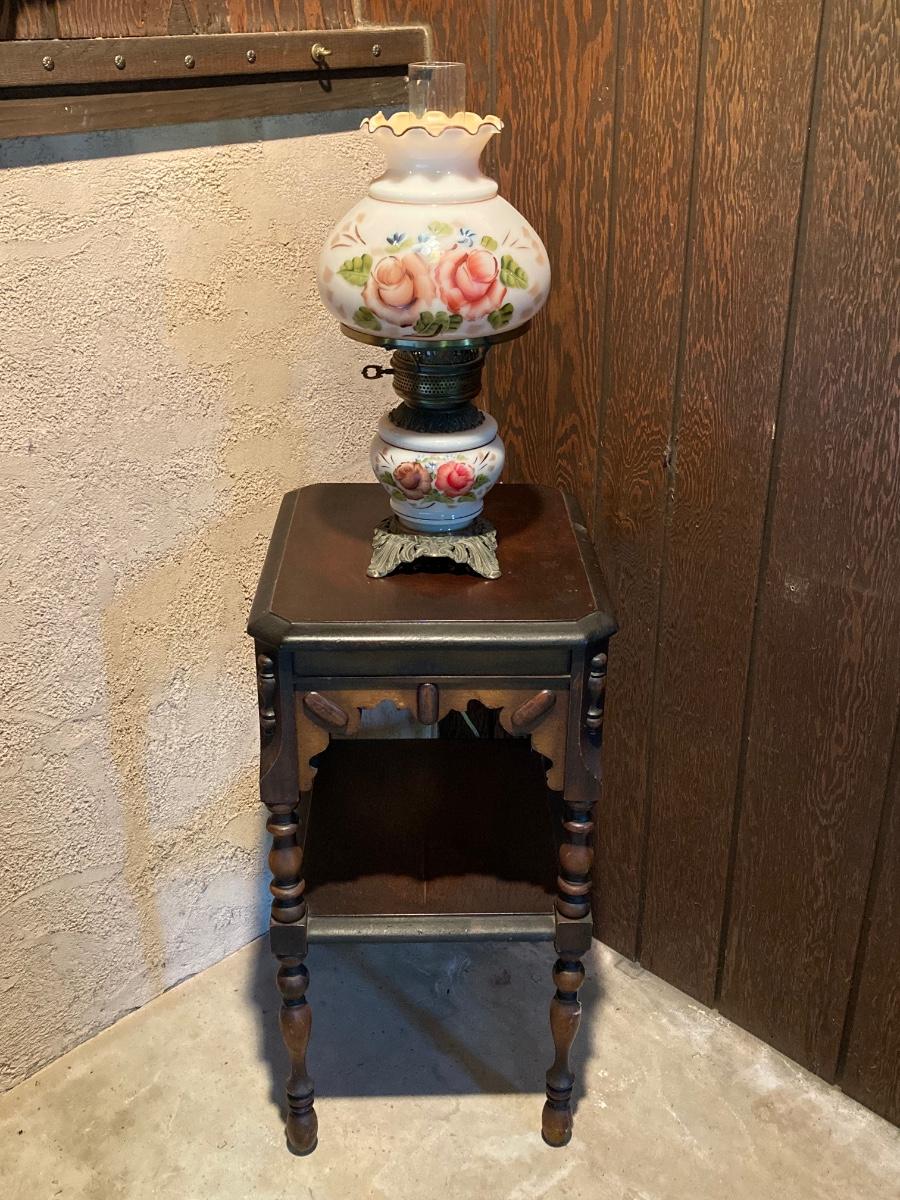 LOT 180: Vintage Hurricane Lamp and Wooden Side Table