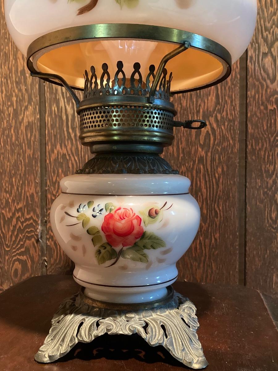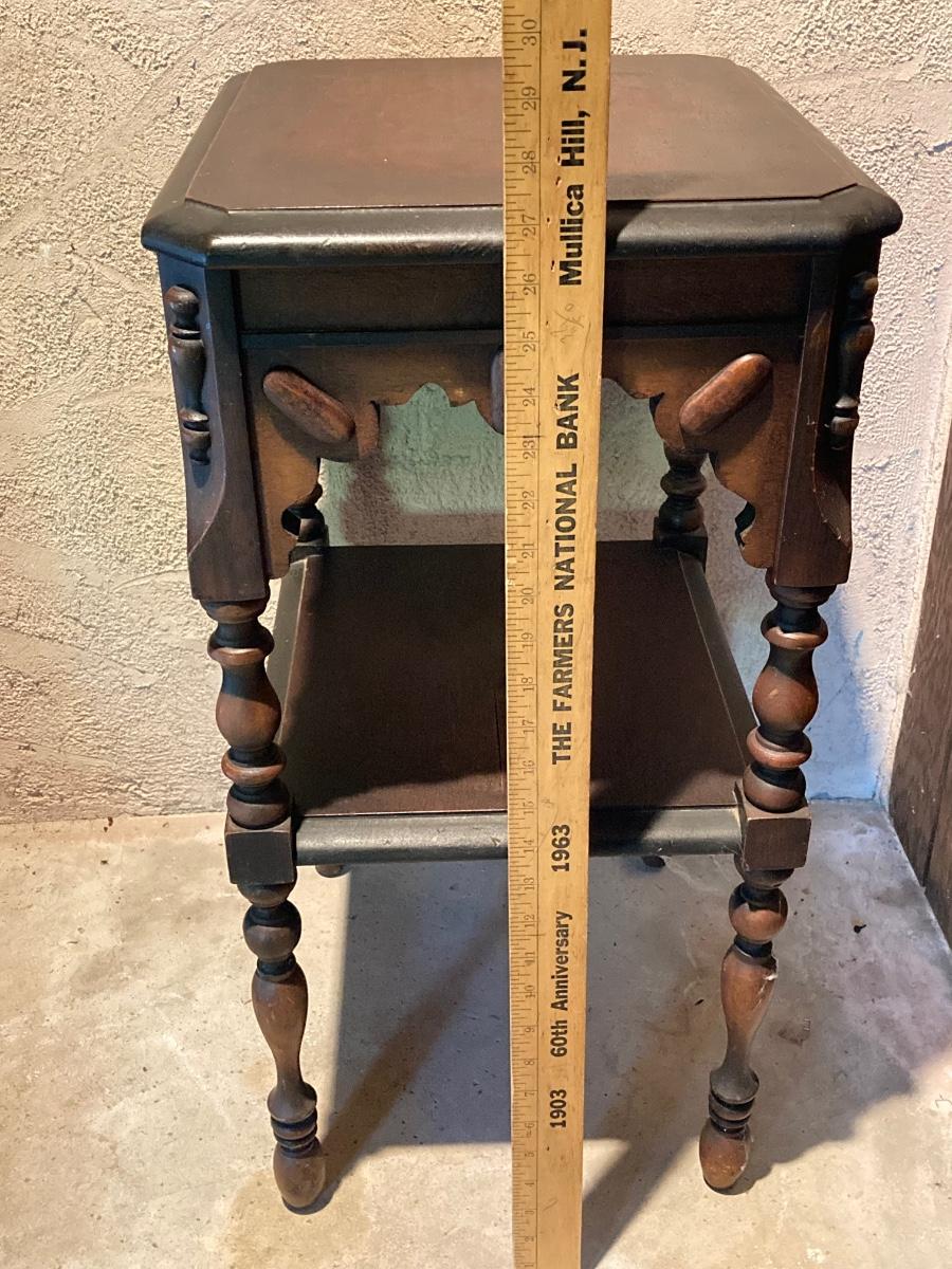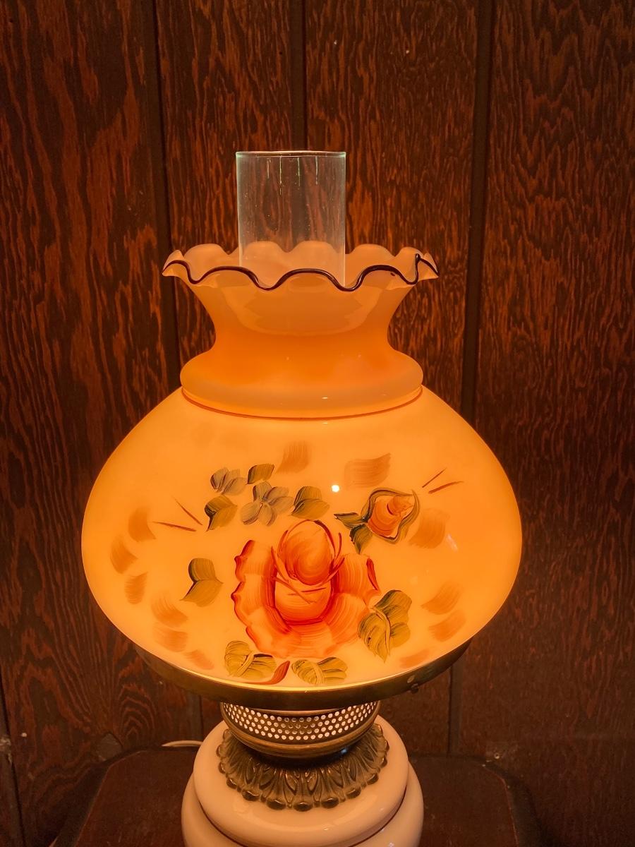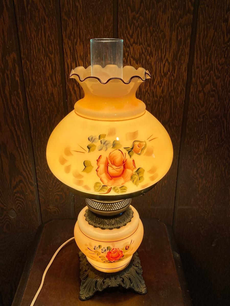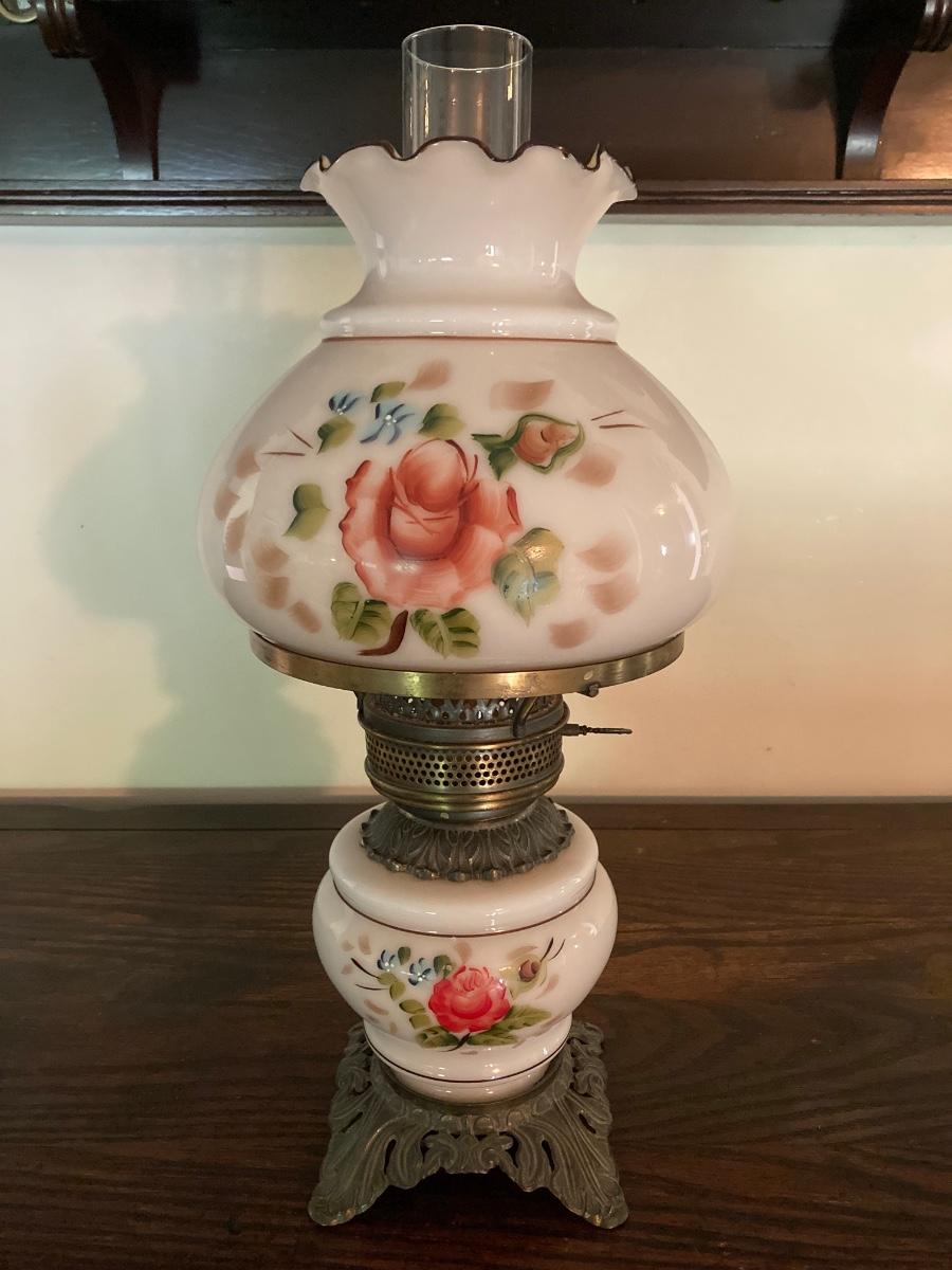 LOT 180: Vintage Hurricane Lamp and Wooden Side Table