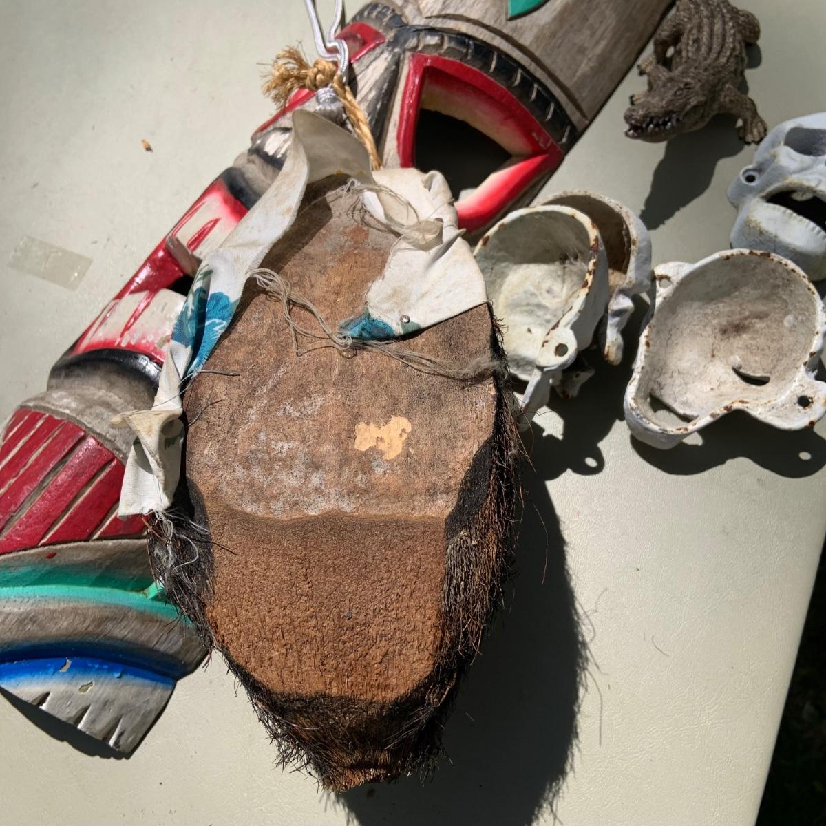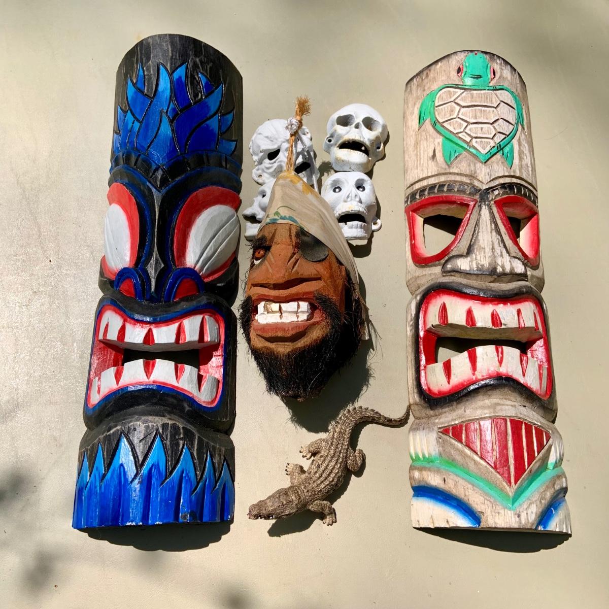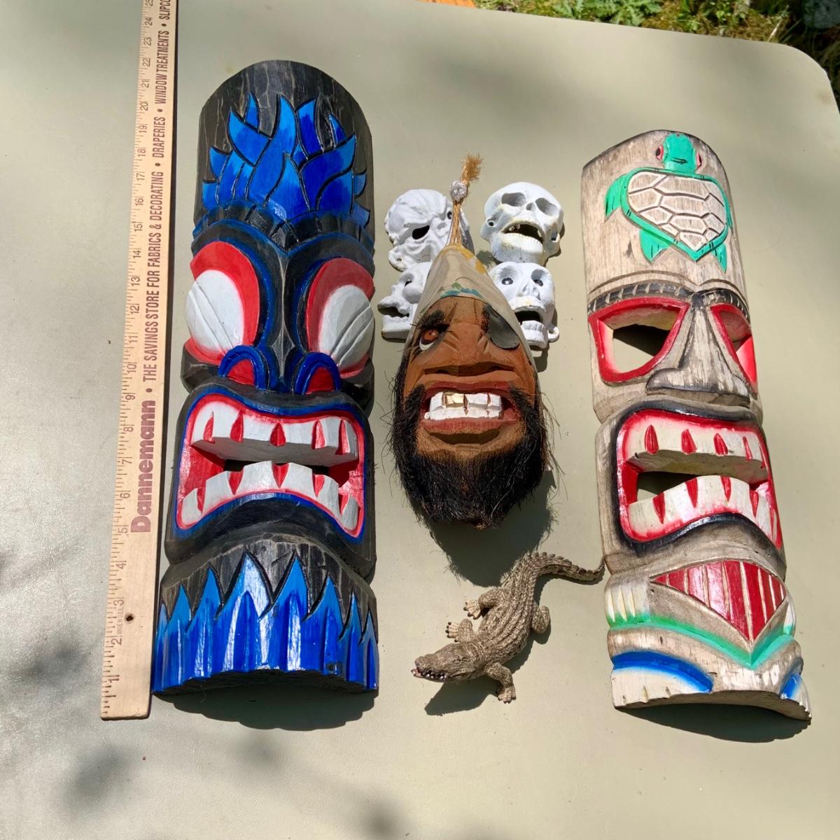 LOT 203: Wood Tiki Masks, Coconut Head Pirate, Cast Iron Skulls and Plastic Alligator