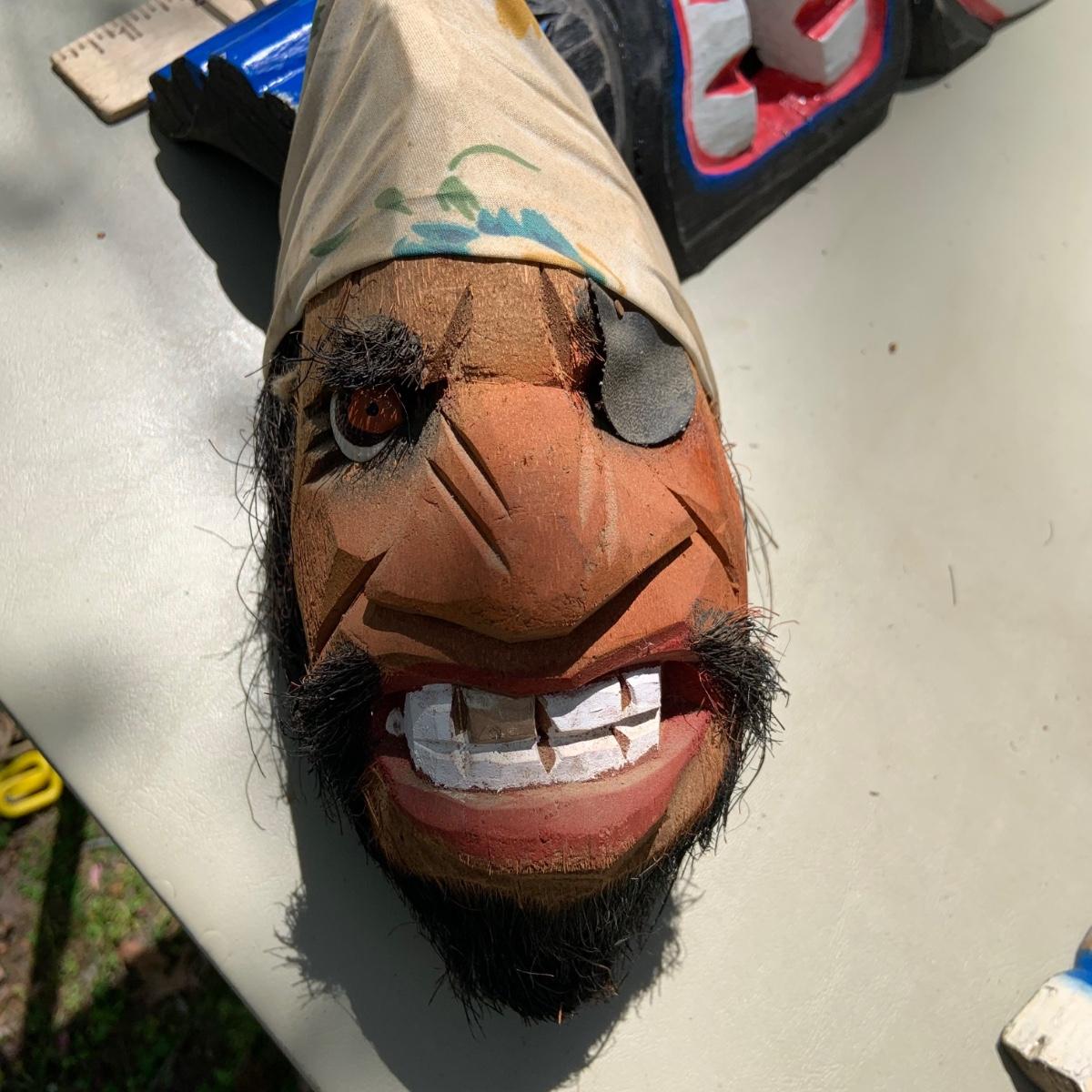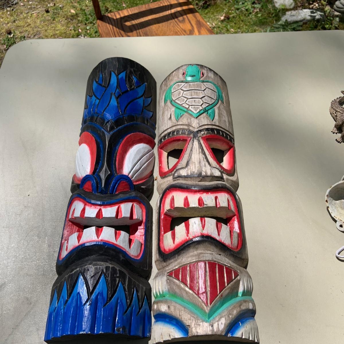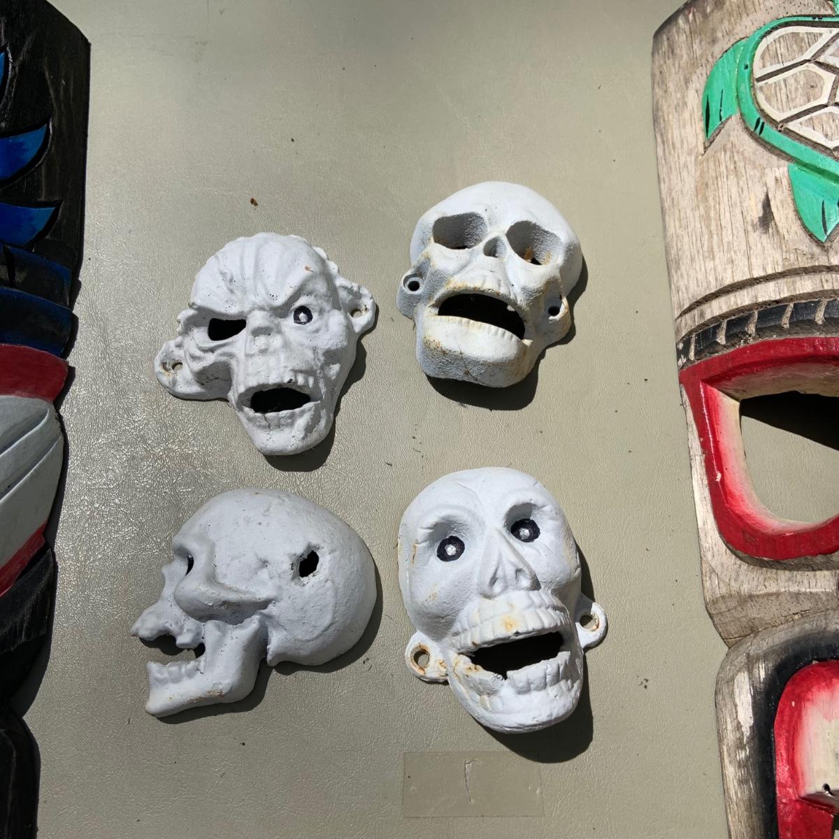 LOT 203: Wood Tiki Masks, Coconut Head Pirate, Cast Iron Skulls and Plastic Alligator