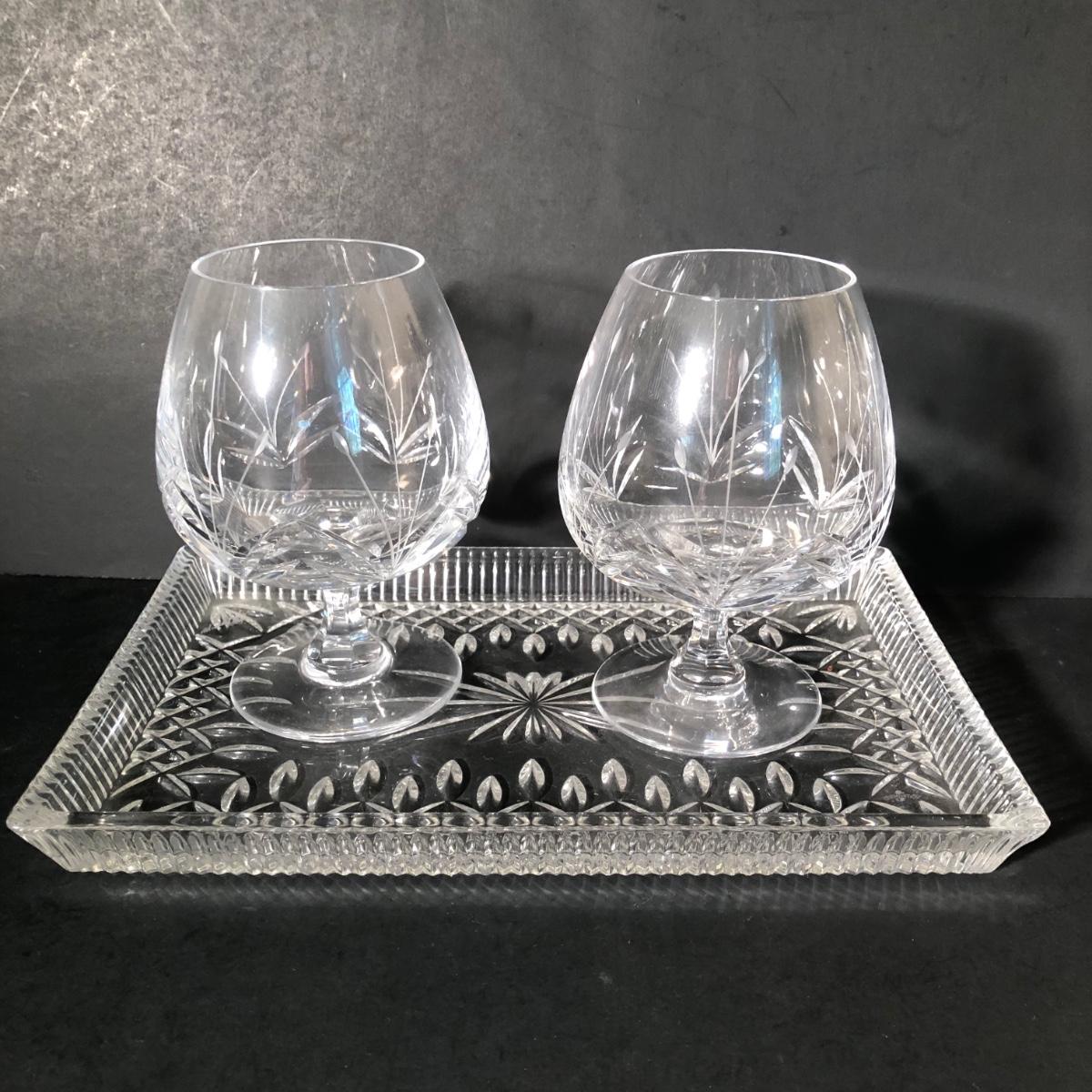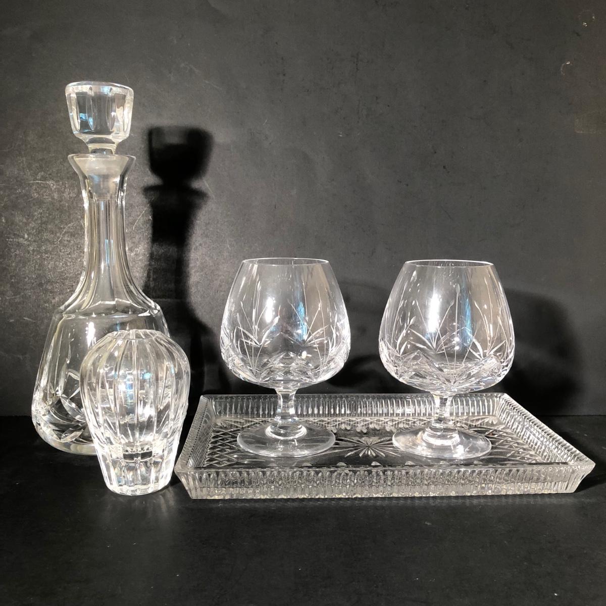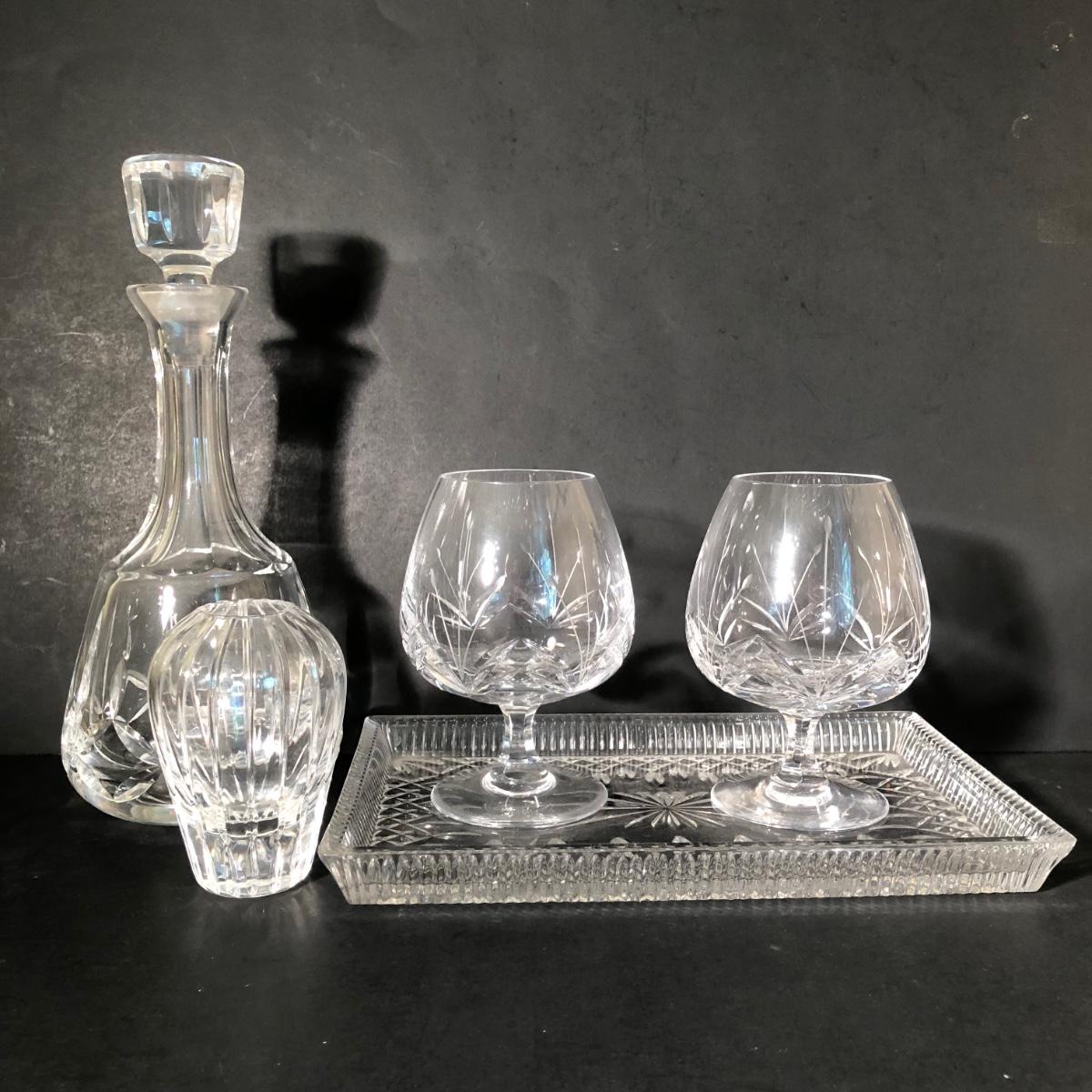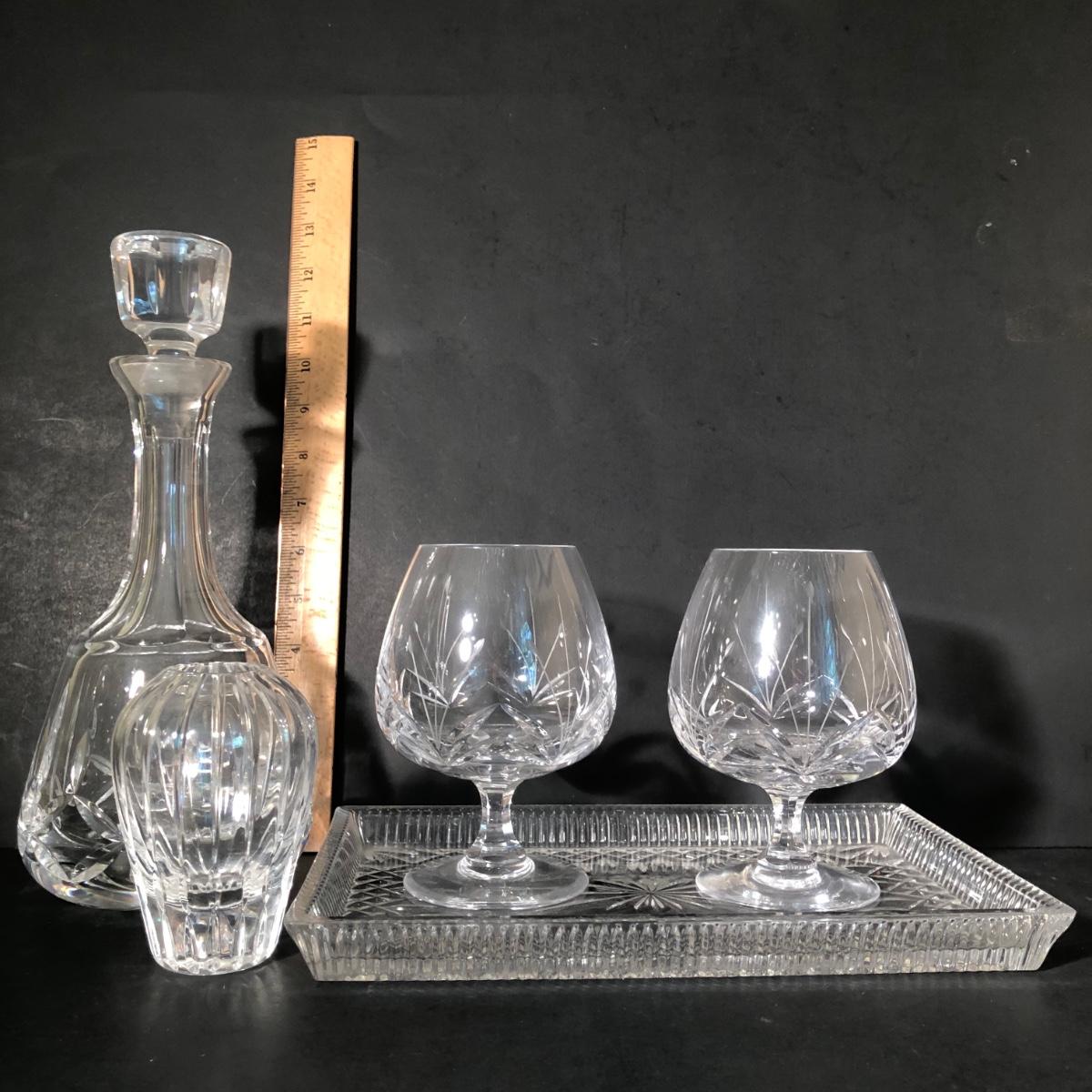 LOT 11K: Crystal Collection - Atlantis Decanter, Vintage Atlantis Bud Vase, Brandy Snifters & Serving Tray