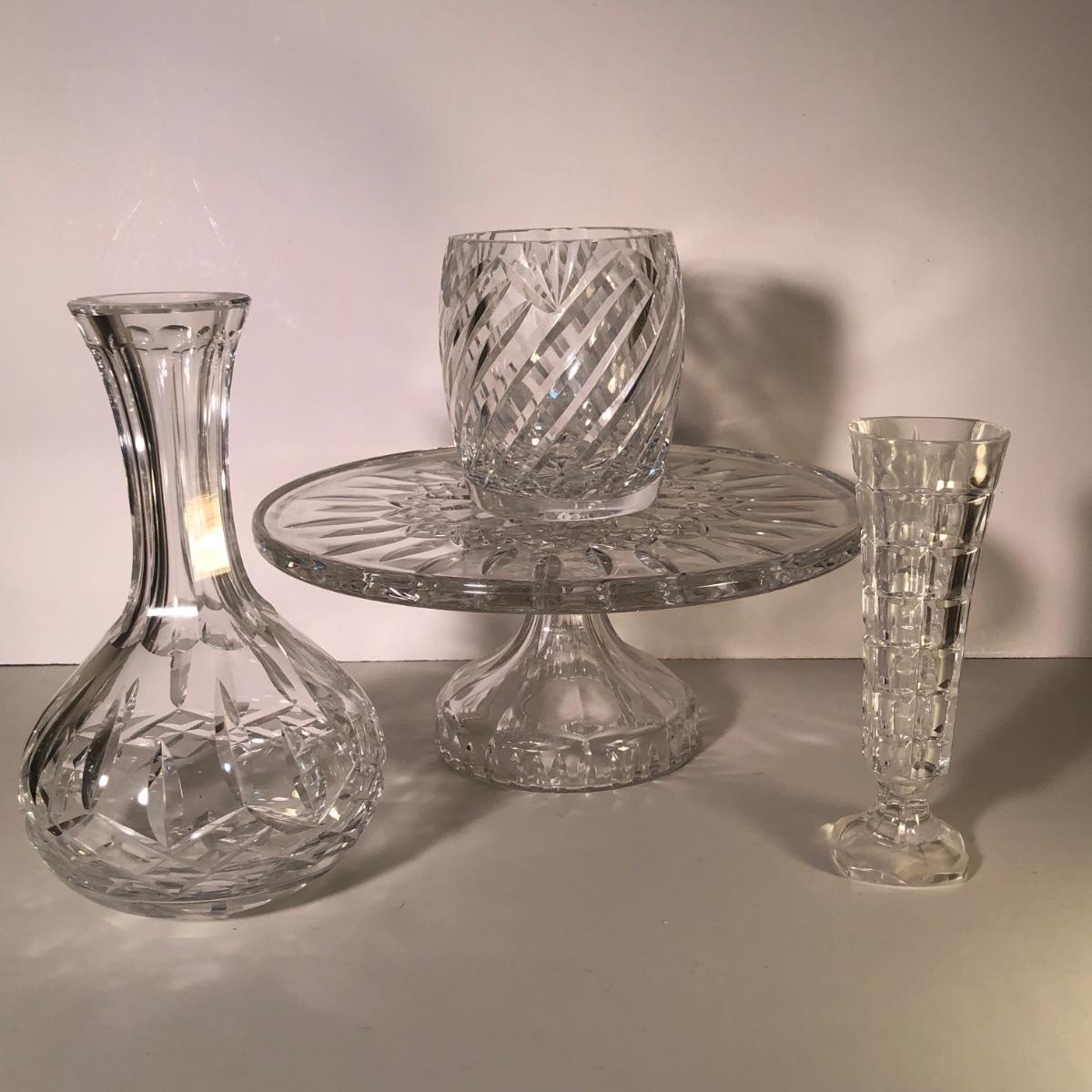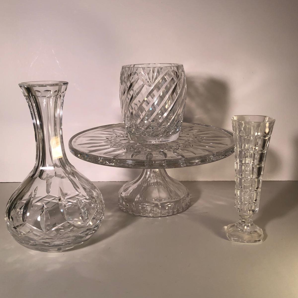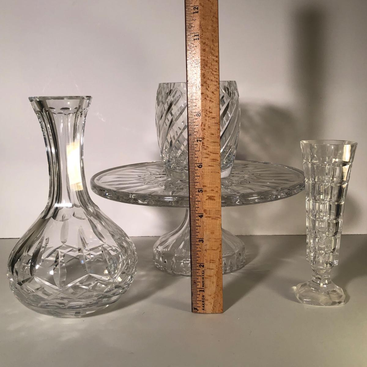 LOT 37G: Crystal Collection - Waterford Cake Plate & Bud Vase w/ More Crystal Vases