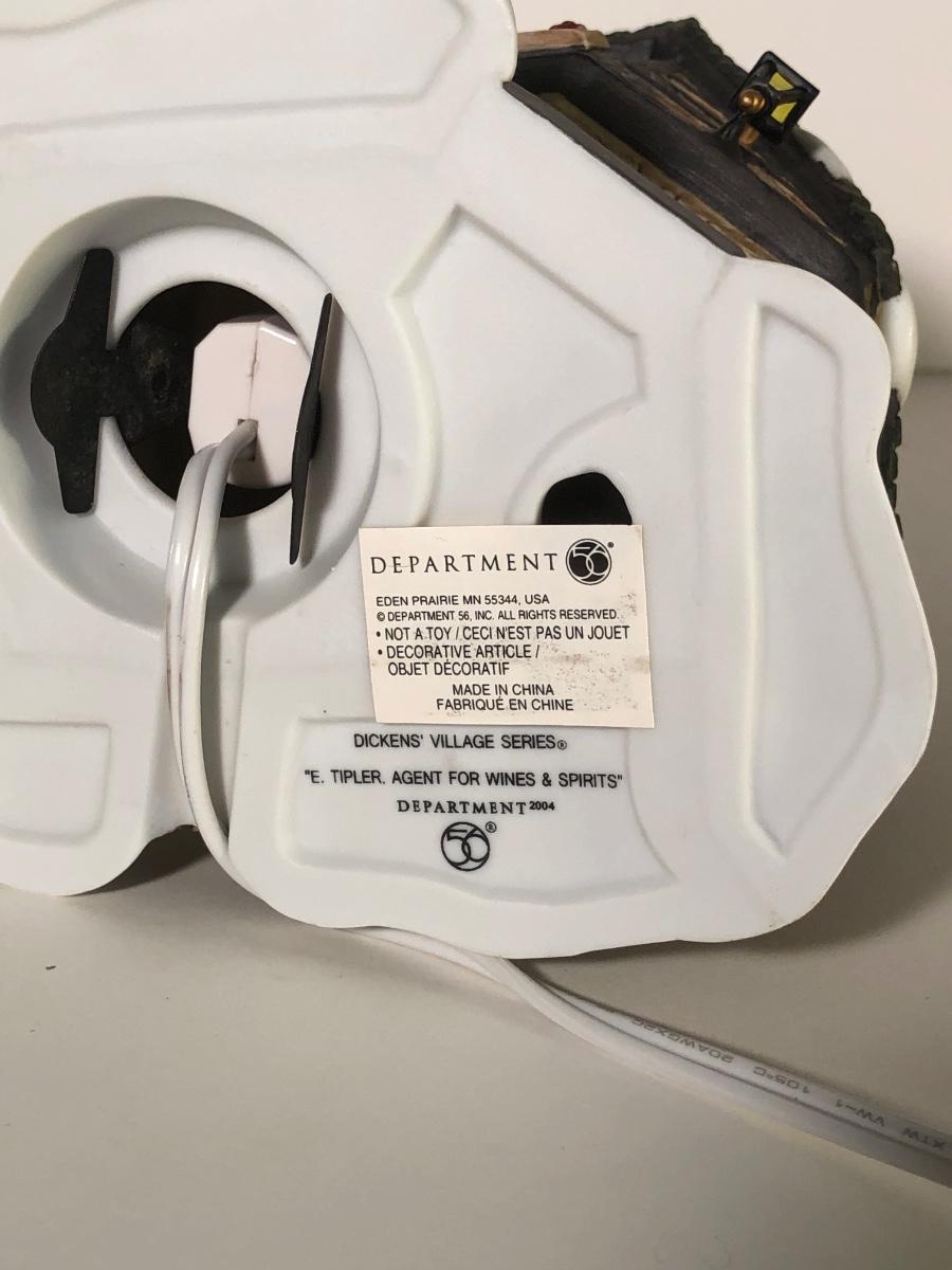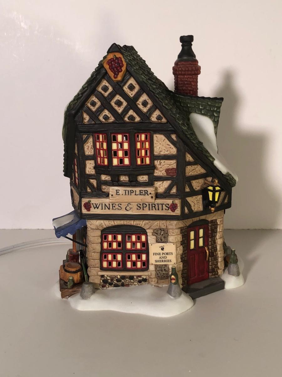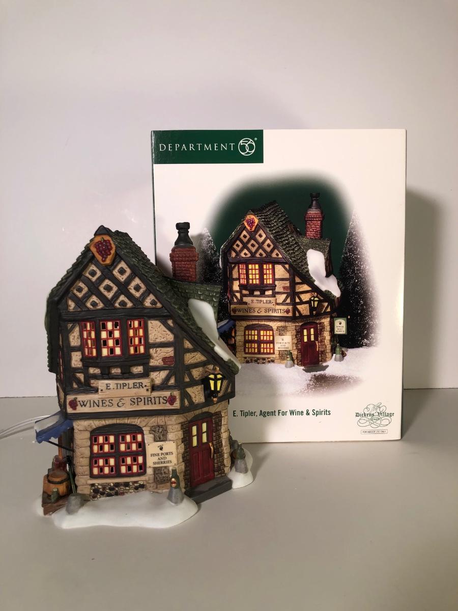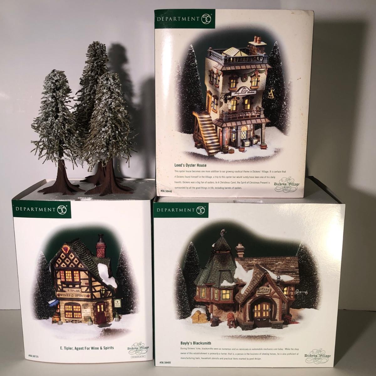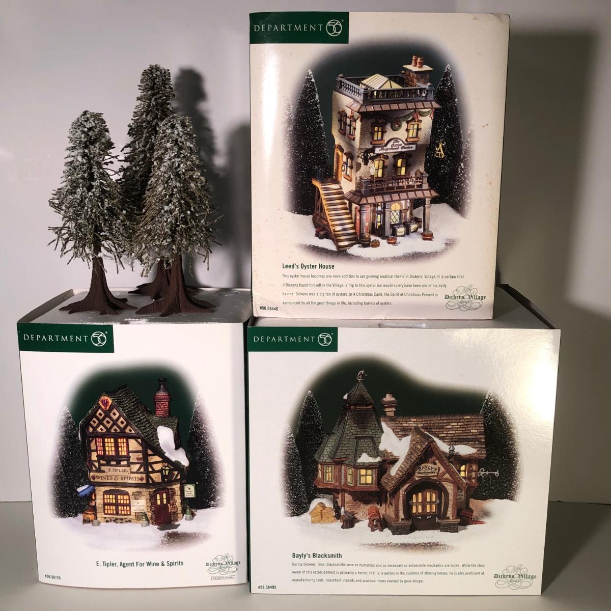 LOT 45G: Department 56 Dickens' Village - 2004 E. Tipler, Agent for Wines & Spirits #56.58725, 1999 Leed's Oyster House #56.58446, 2001 Bayly's Blacksmith #56.58495 & Frosted Trees