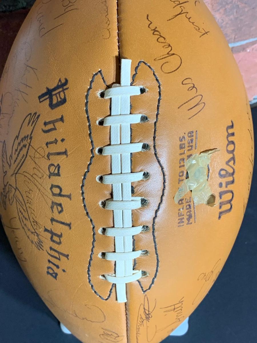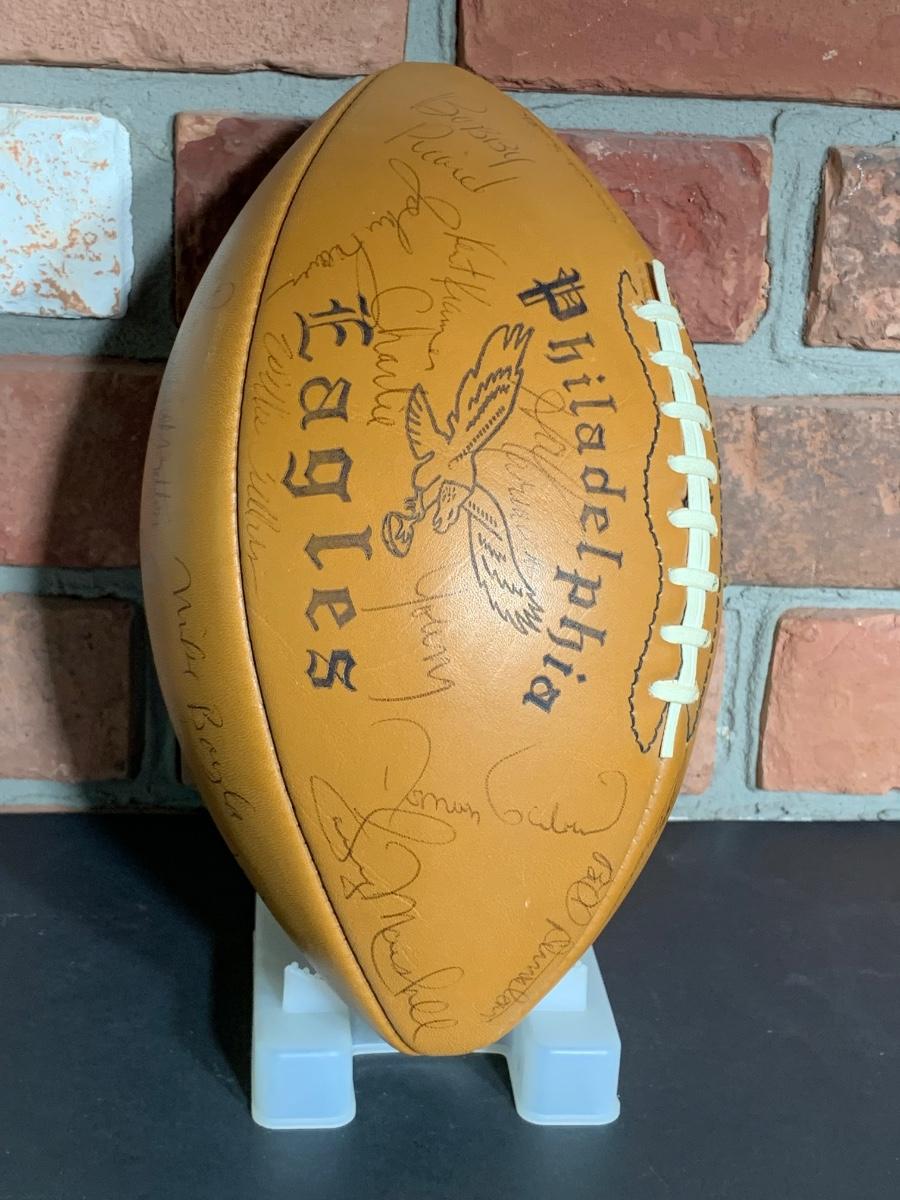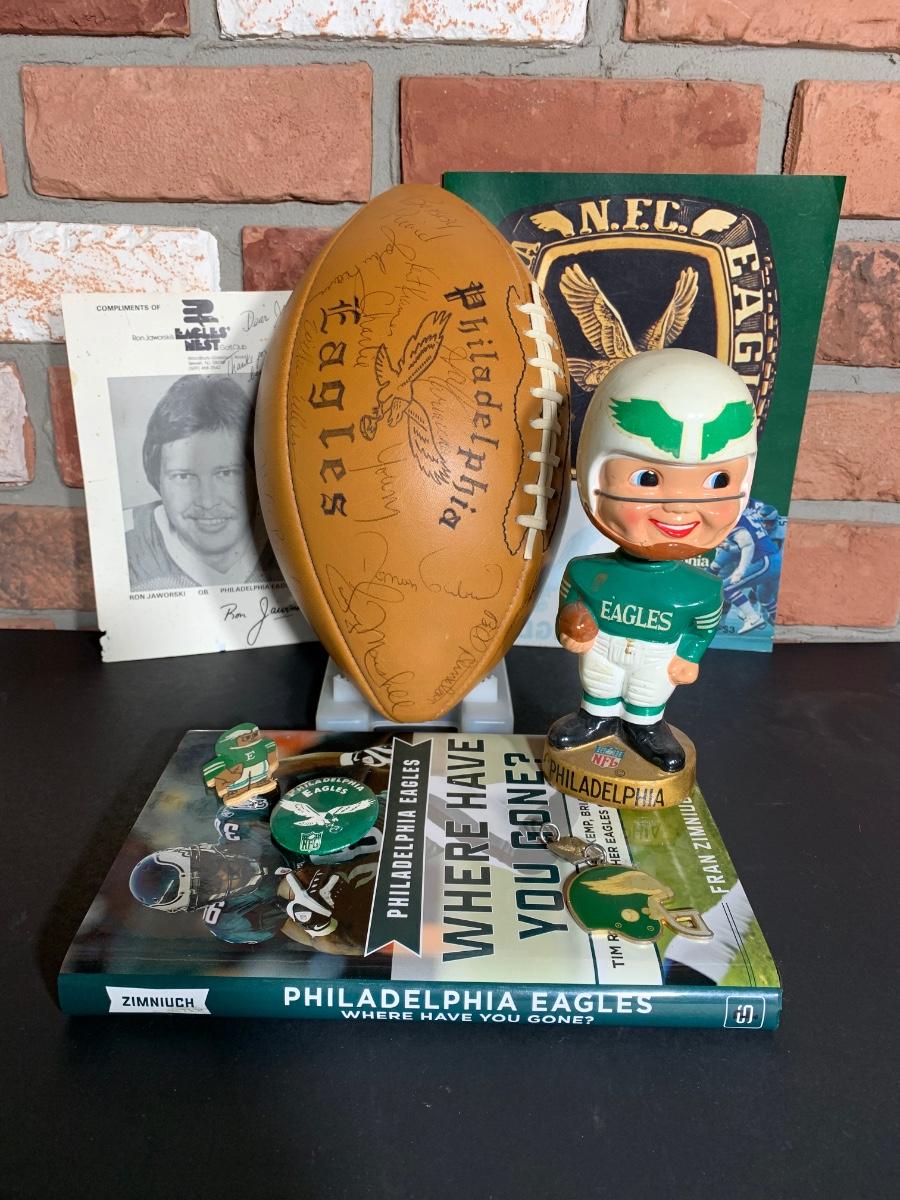 LOT 85 G: Philadelphia Eagles Collection: 1975 Team Signed Football including Bill Bergey, Roman Gabriel, & Harold Carmichael, Signed Ron Jaworski Image, 1967 Bobble Head/Nodder & More